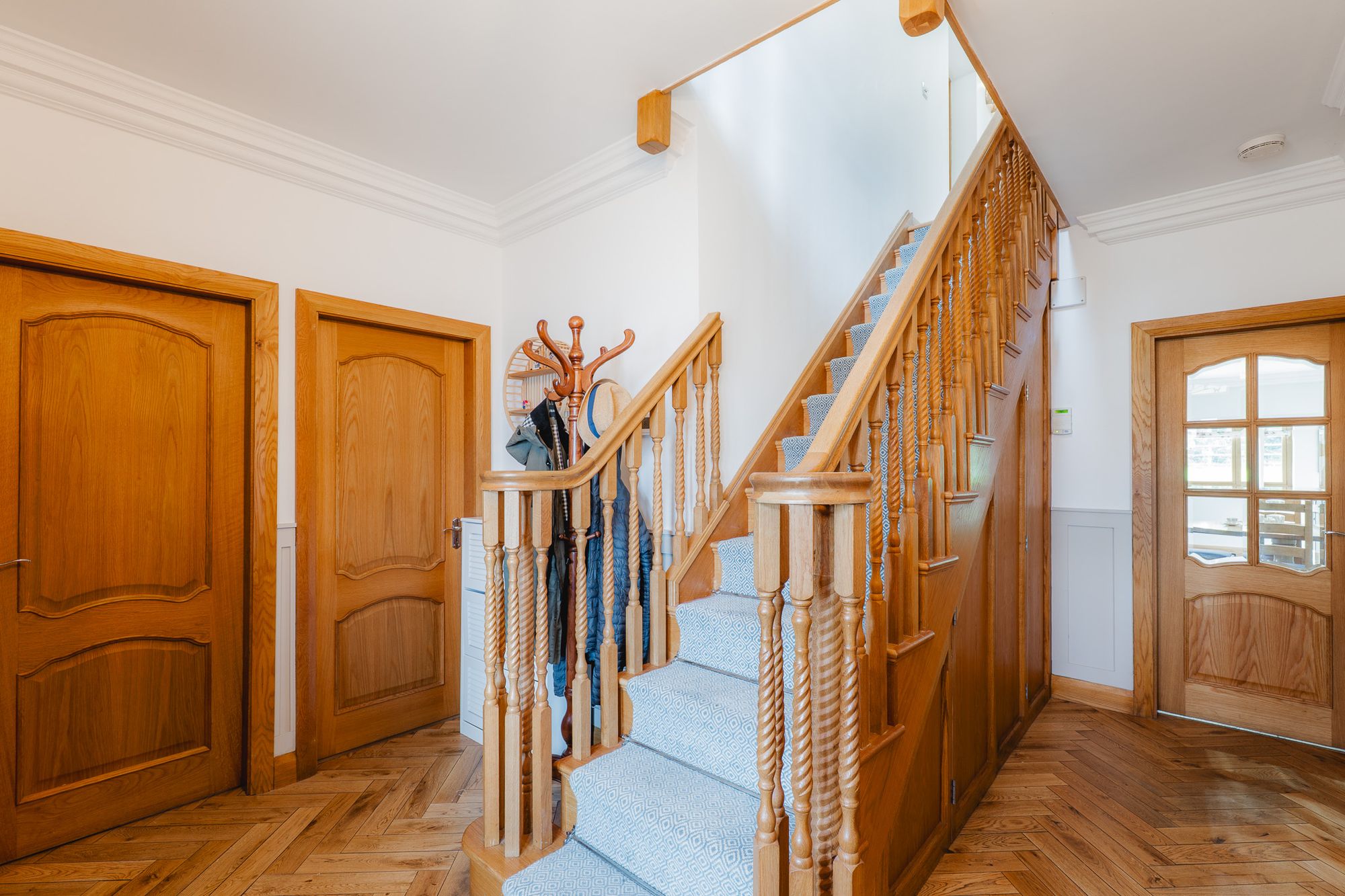 Double doors, nestled beneath a stunning stained-glass transom, open into the main entrance hall, where oak parquet flooring, warmed by underfloor heating – a feature throughout – flows underfoot.
