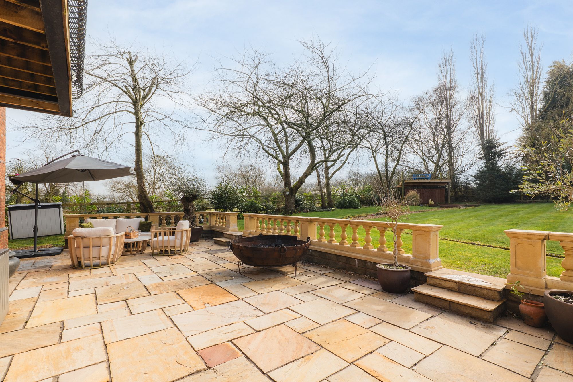 As the sun sets, the patio and decking areas provide the perfect spot to soak in the evening light, with uninterrupted views stretching out into the distance. Enjoy unforgettable evenings around the stunning space, ideal for a large fire pit or seated area, perfect for outdoor gatherings, cosy nights under the stars.