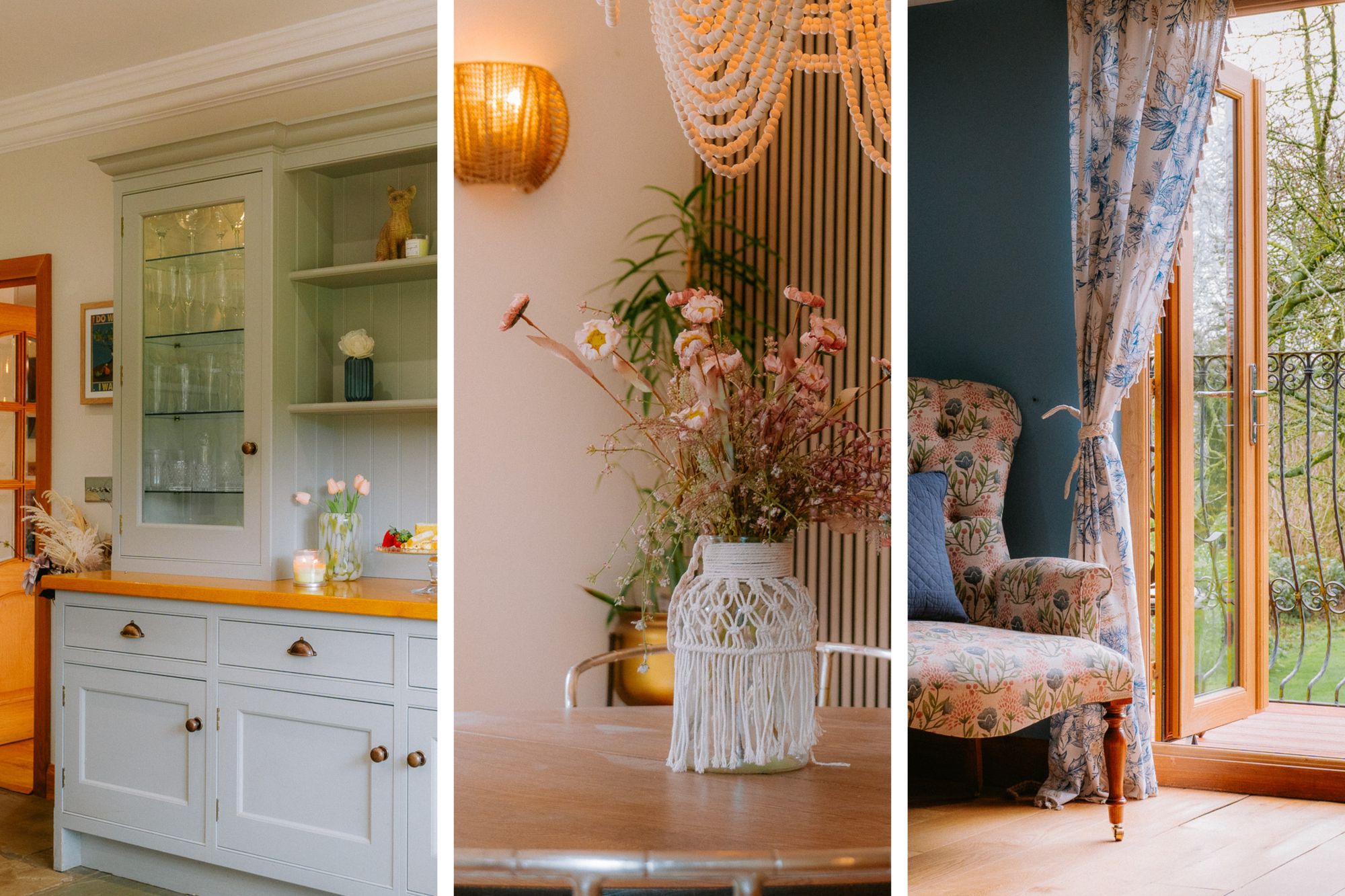Forget-me-not blue walls and a floral feature wall evoke the countryside surroundings in this peaceful, light-filled bedroom. Storage is in abundance in the walk-in wardrobe, where fitted shelving, drawers and hanging rails are on hand to accommodate all your clothing needs.