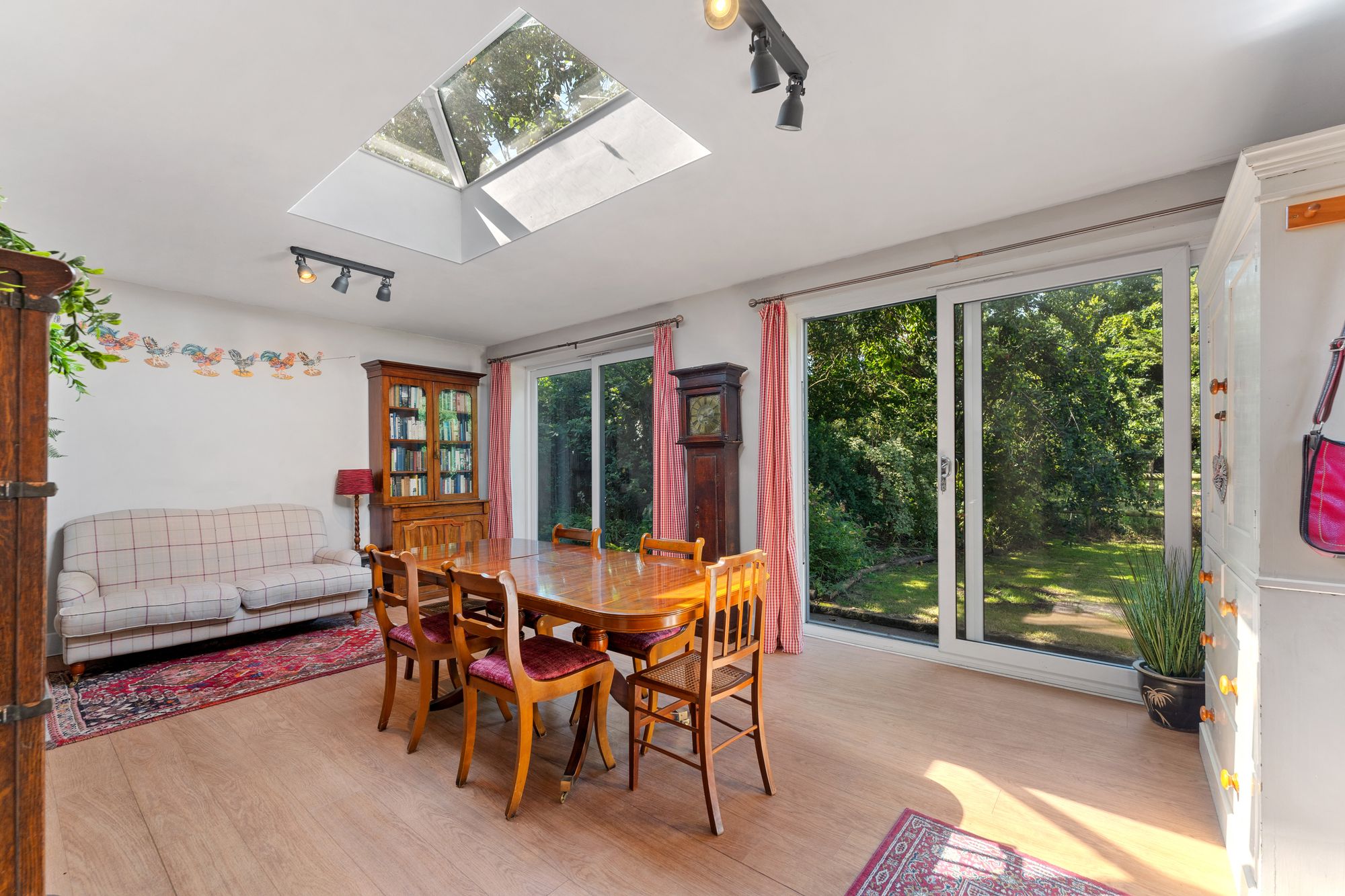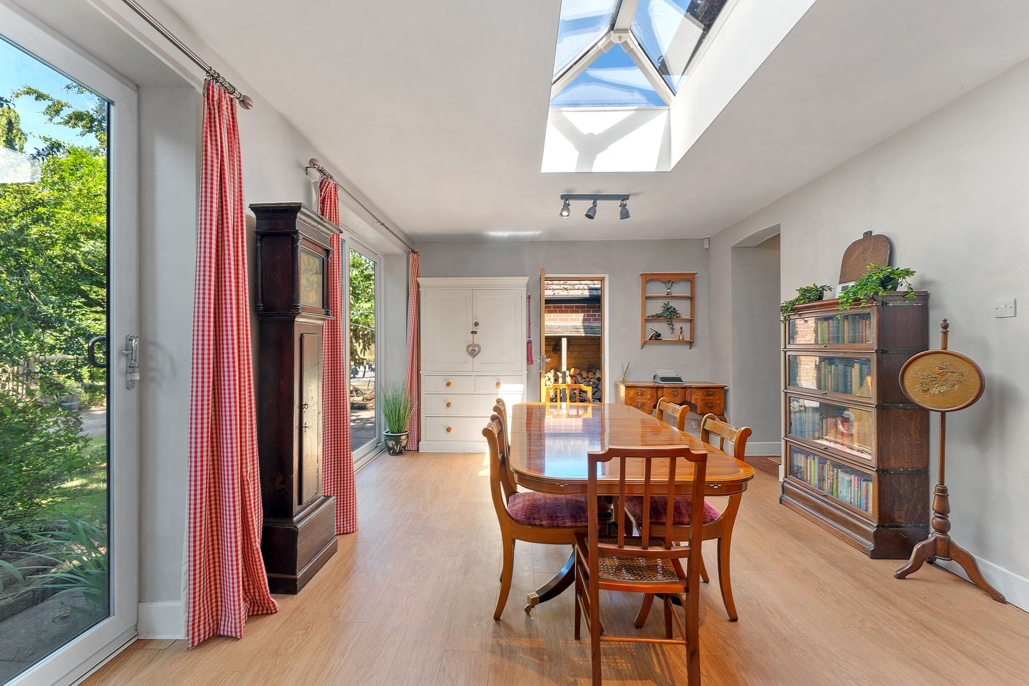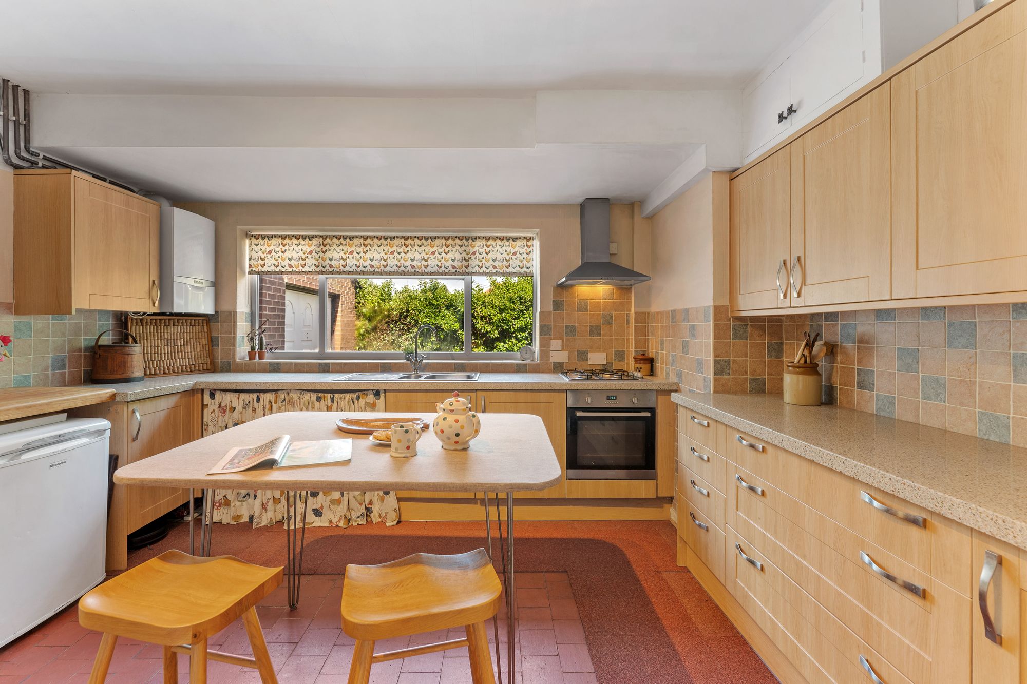 From the entrance hall, step into the kitchen, a warm, practical space with original tiled flooring underfoot. With light streaming in from windows overlooking the garden, and storage in abundance, there is real potential here to open up into the living room beyond, creating a modern open-plan family-dining experience.