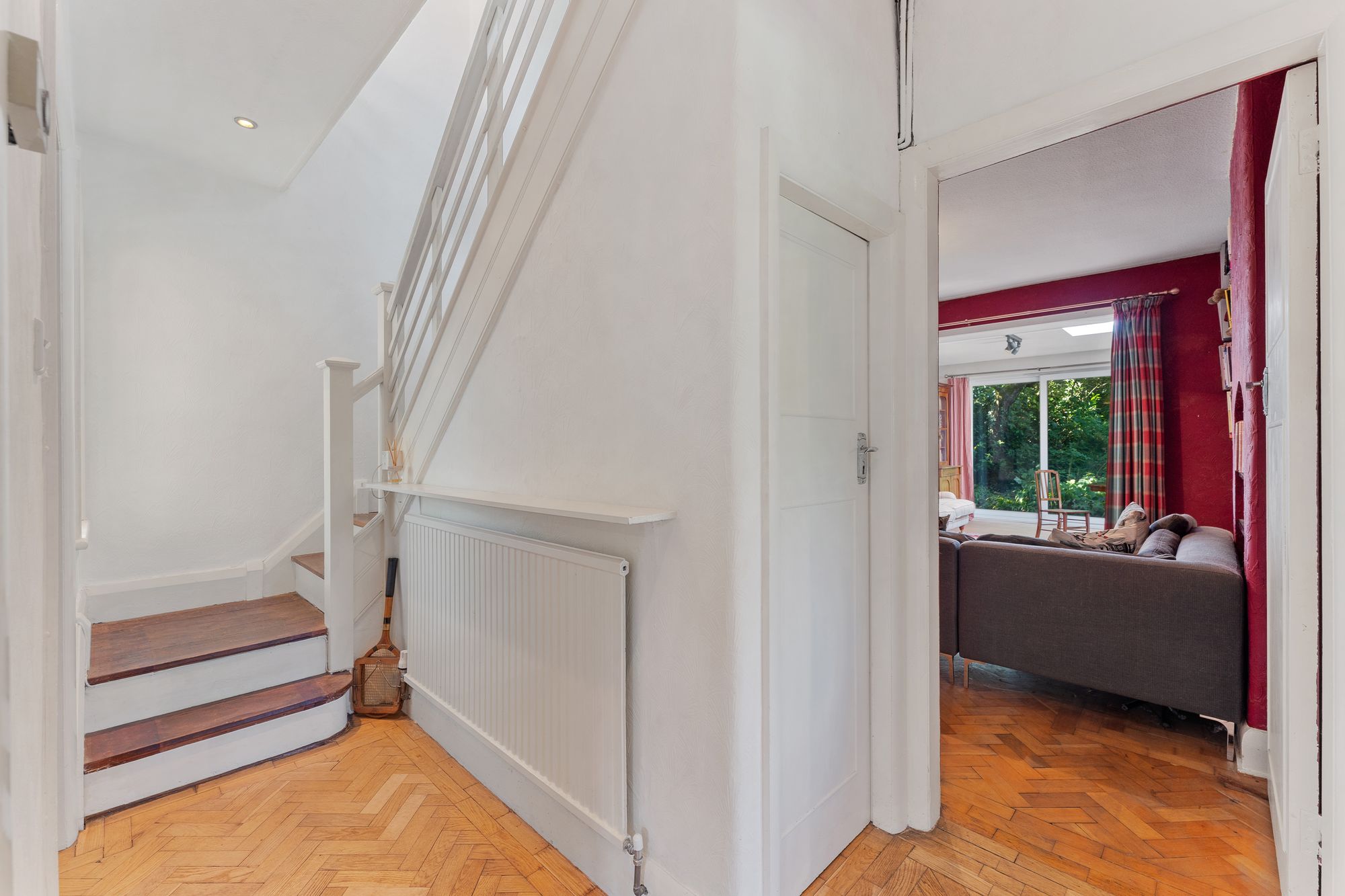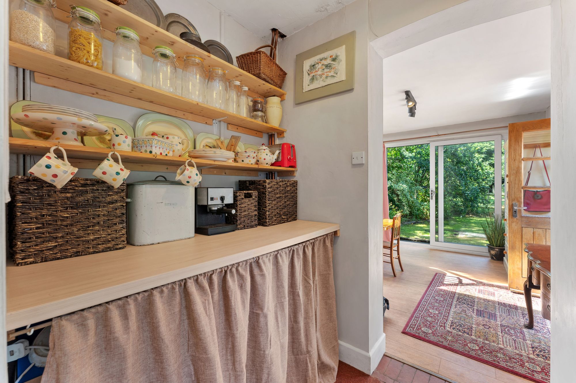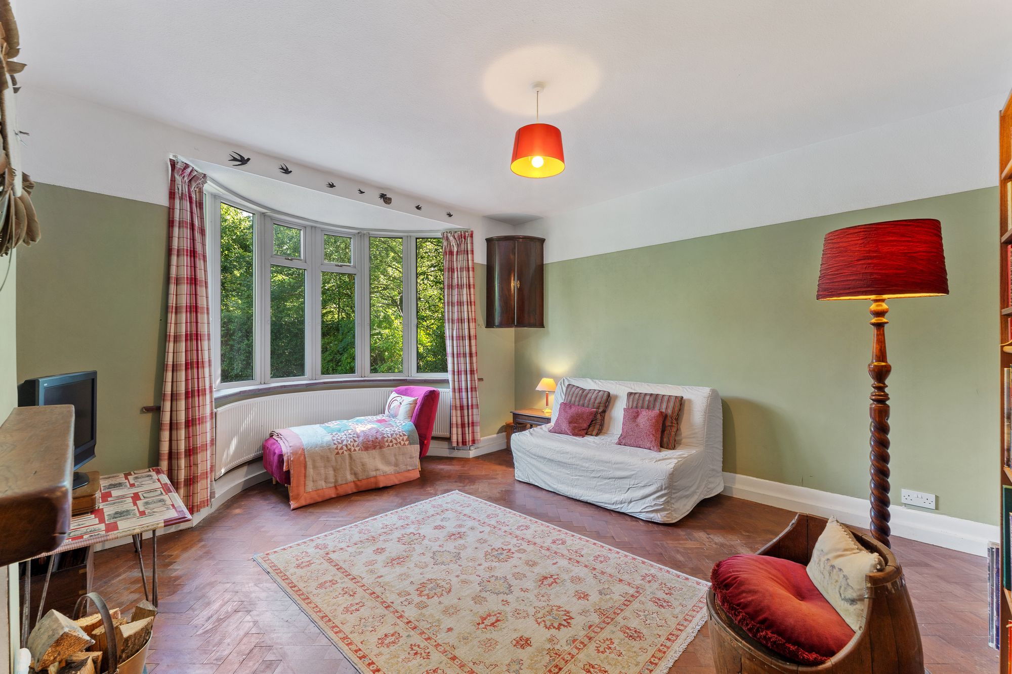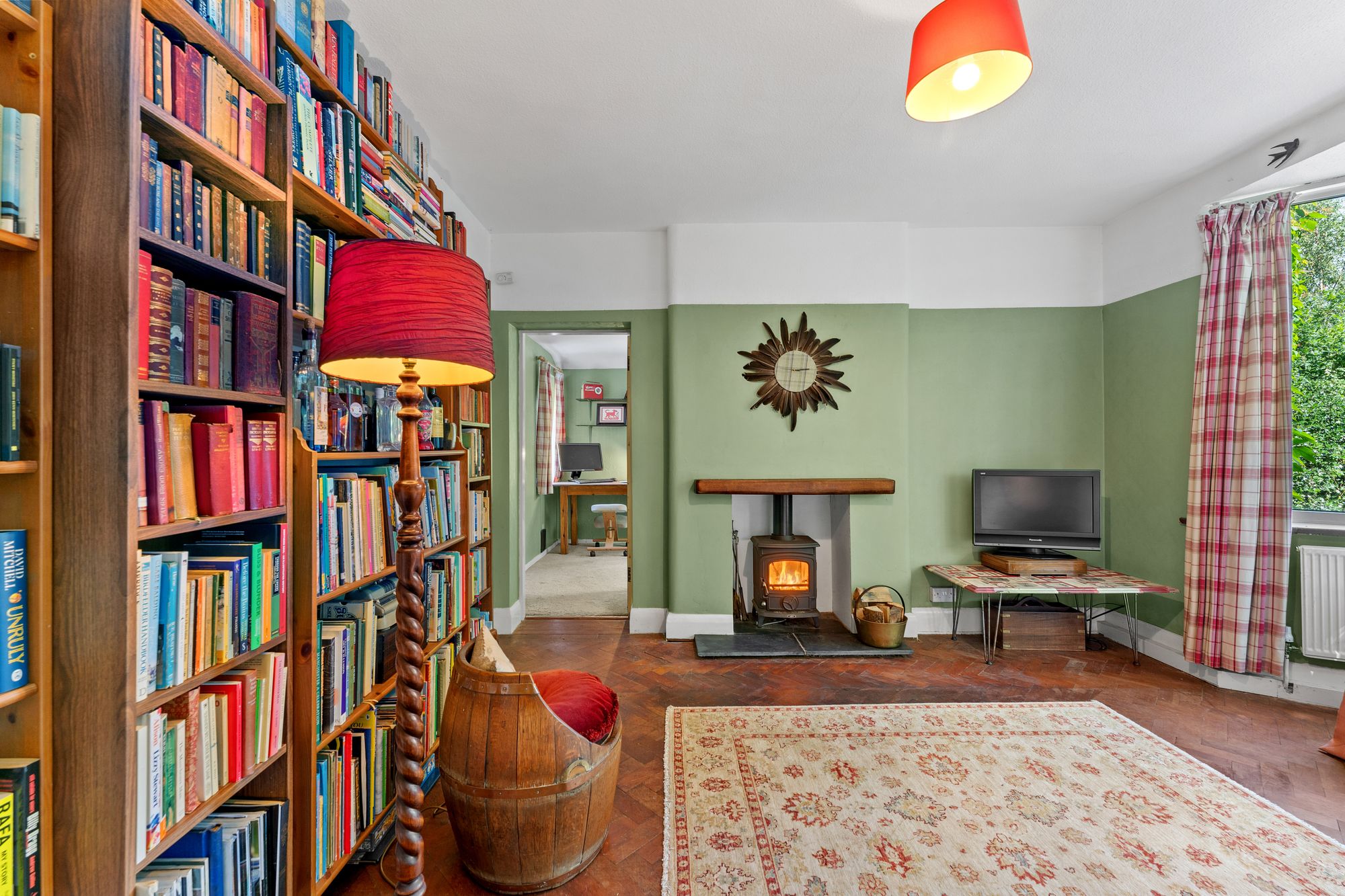 From the entrance hall, step into the kitchen, a warm, practical space with original tiled flooring underfoot. With light streaming in from windows overlooking the garden, and storage in abundance, there is real potential here to open up into the living room beyond, creating a modern open-plan family-dining experience.