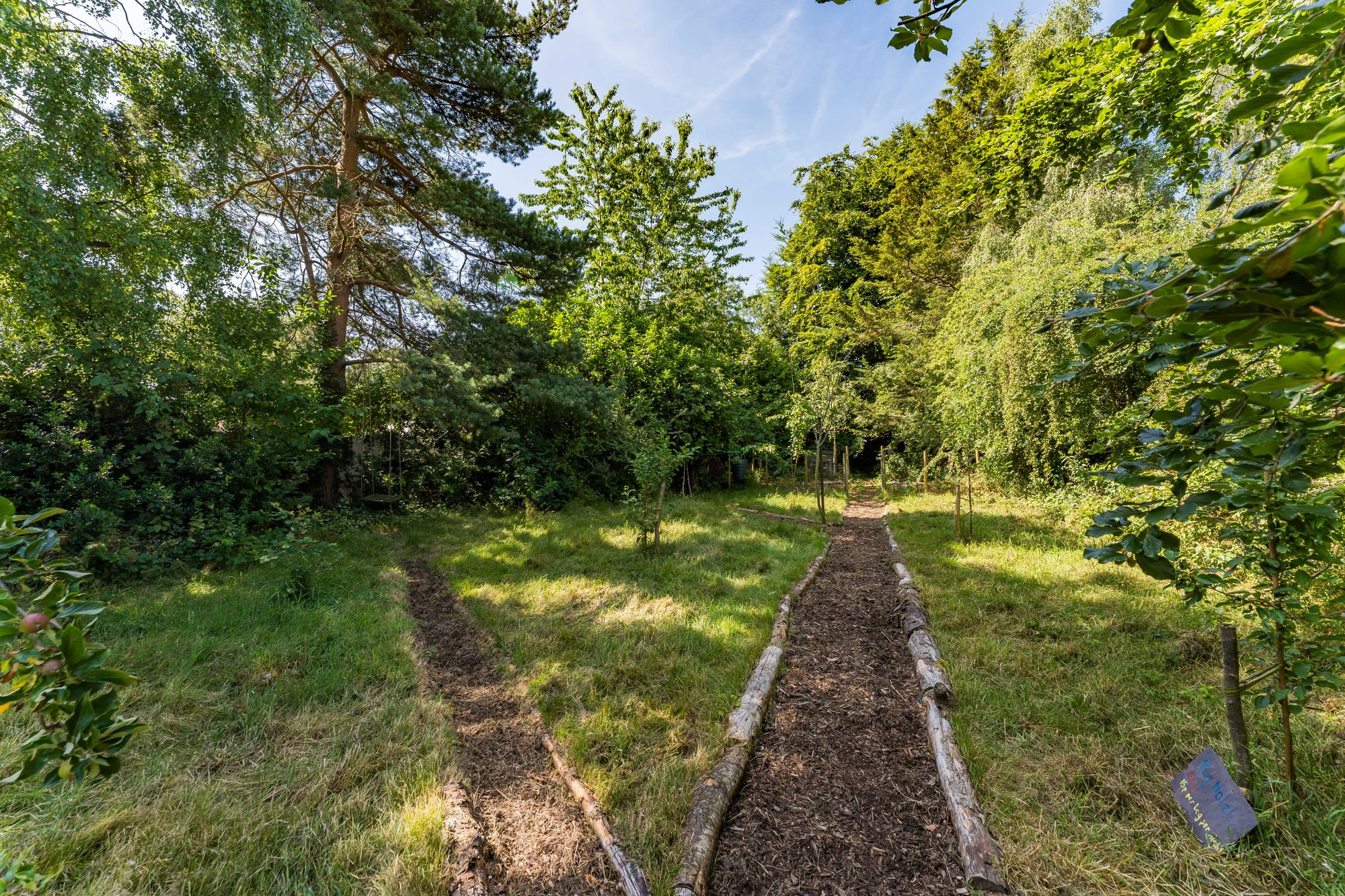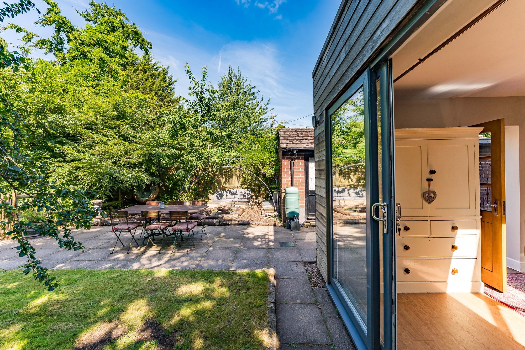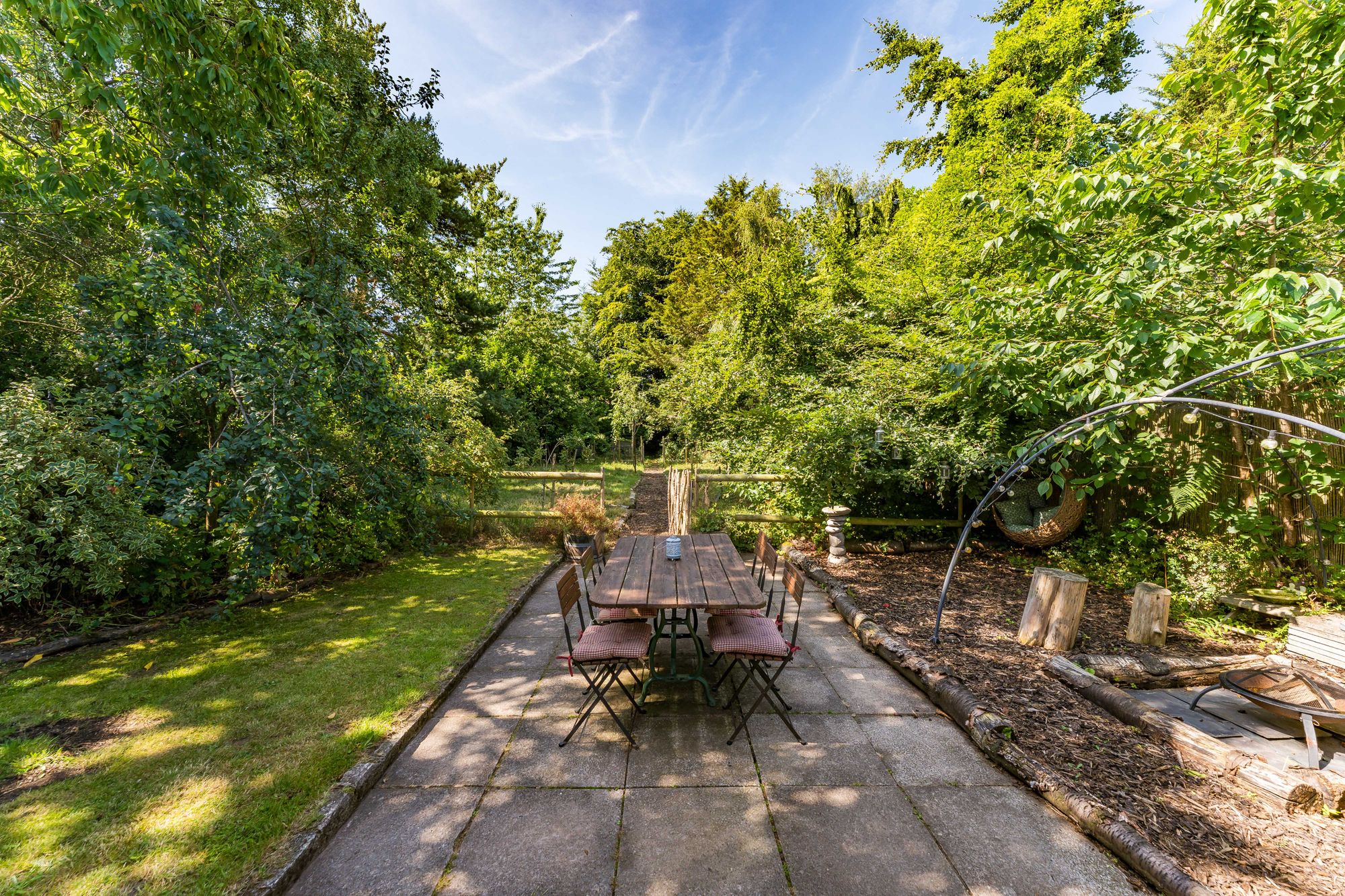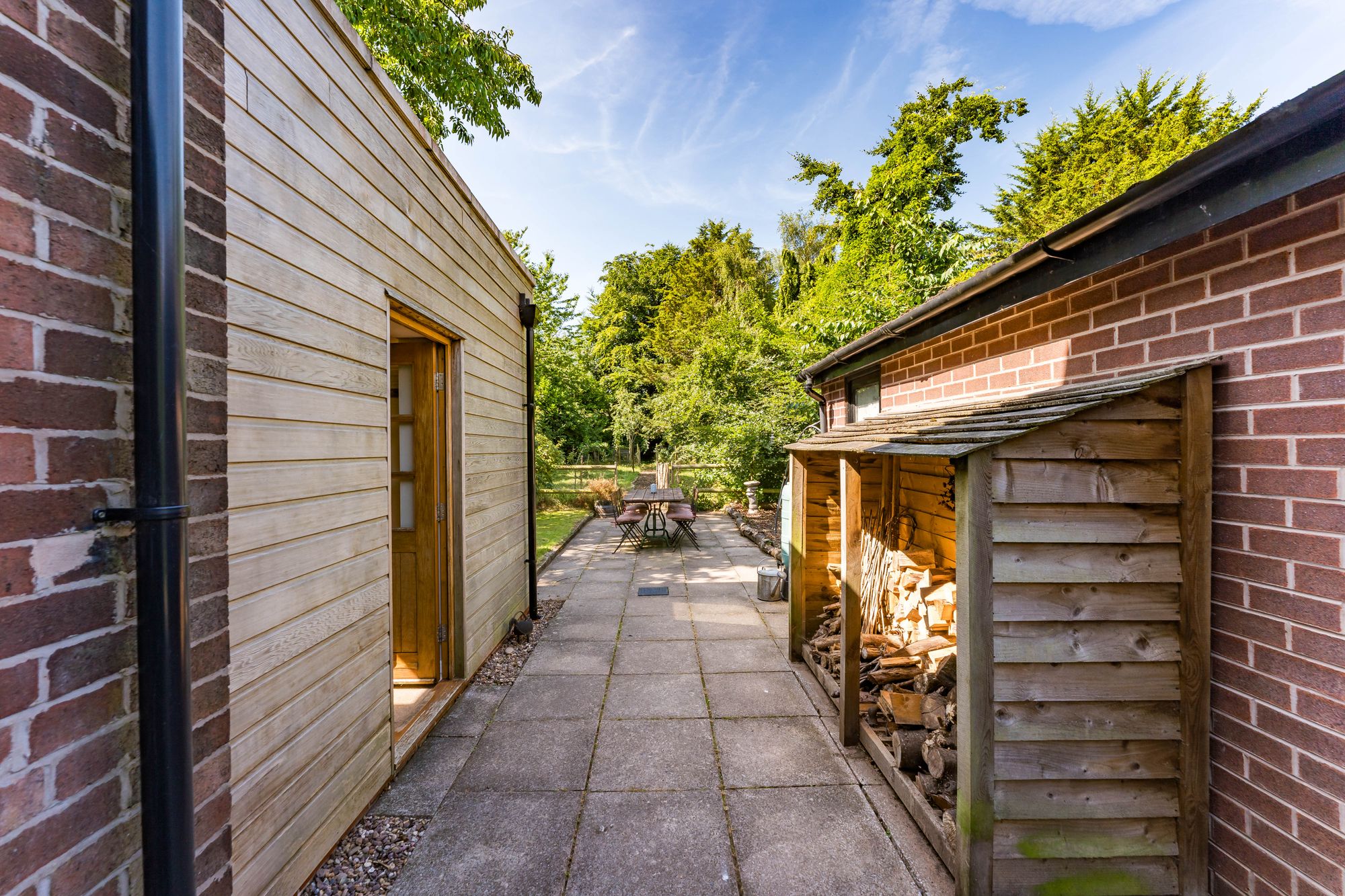 Neat lawn gives way to wilder ground beyond the fencing, where an orchard, vegetable patch, and rustic chicken run bring a sense of rhythm and purpose. Fruit trees provide dappled shade along the way, while hedgehogs and birds are regular visitors. At the far end, a detached garage offers space for bikes, tools or weekend projects, with a dedicated workshop area too.