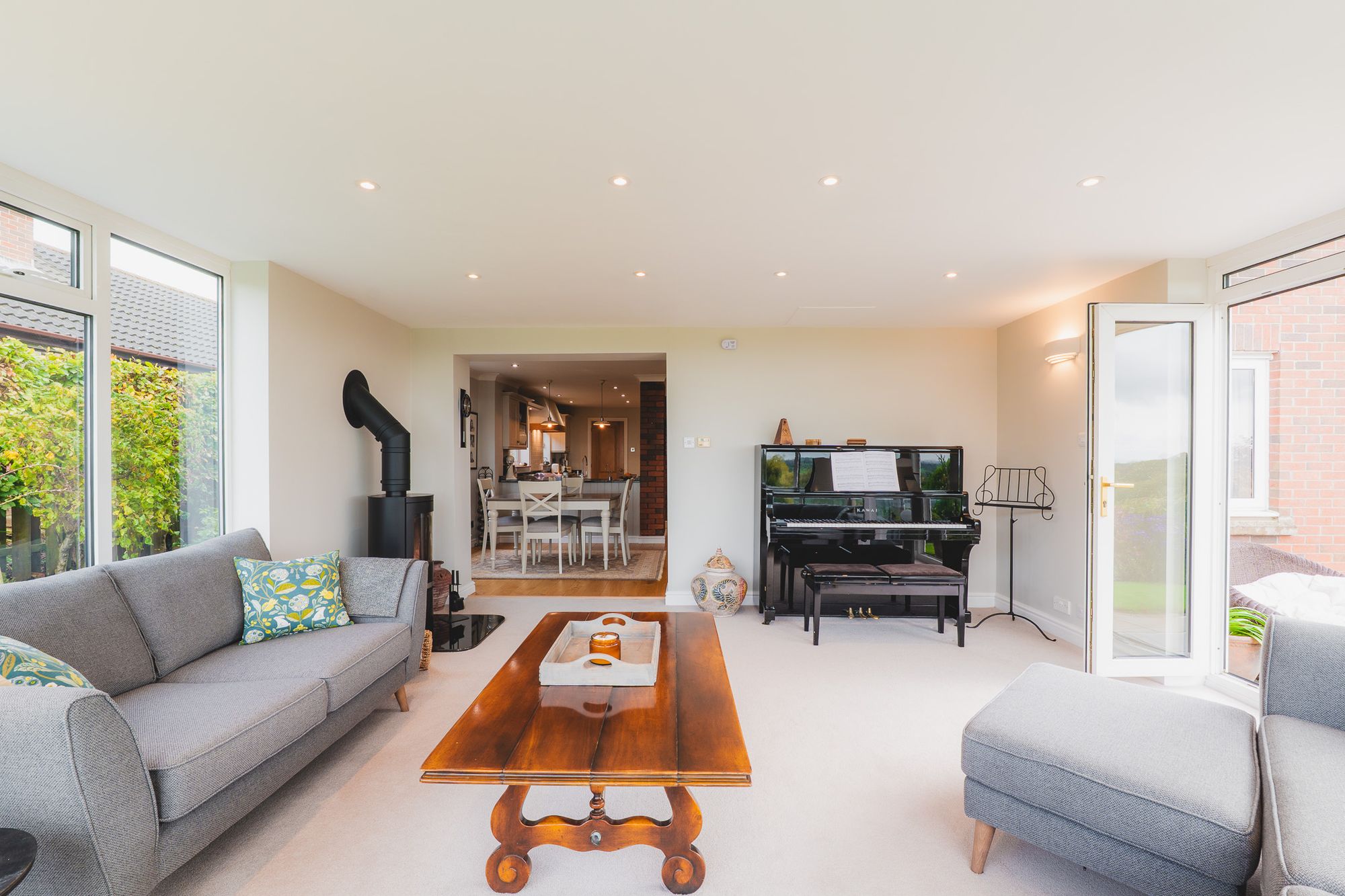 A home with effortless flow, the welcoming lounge, with its vaulted ceiling and newly installed log-burner, opens up from the dining room. Light streams in through windows to the front, while to the rear, French doors open invitingly to the garden, where the mature planting provides year-round colour and interest.