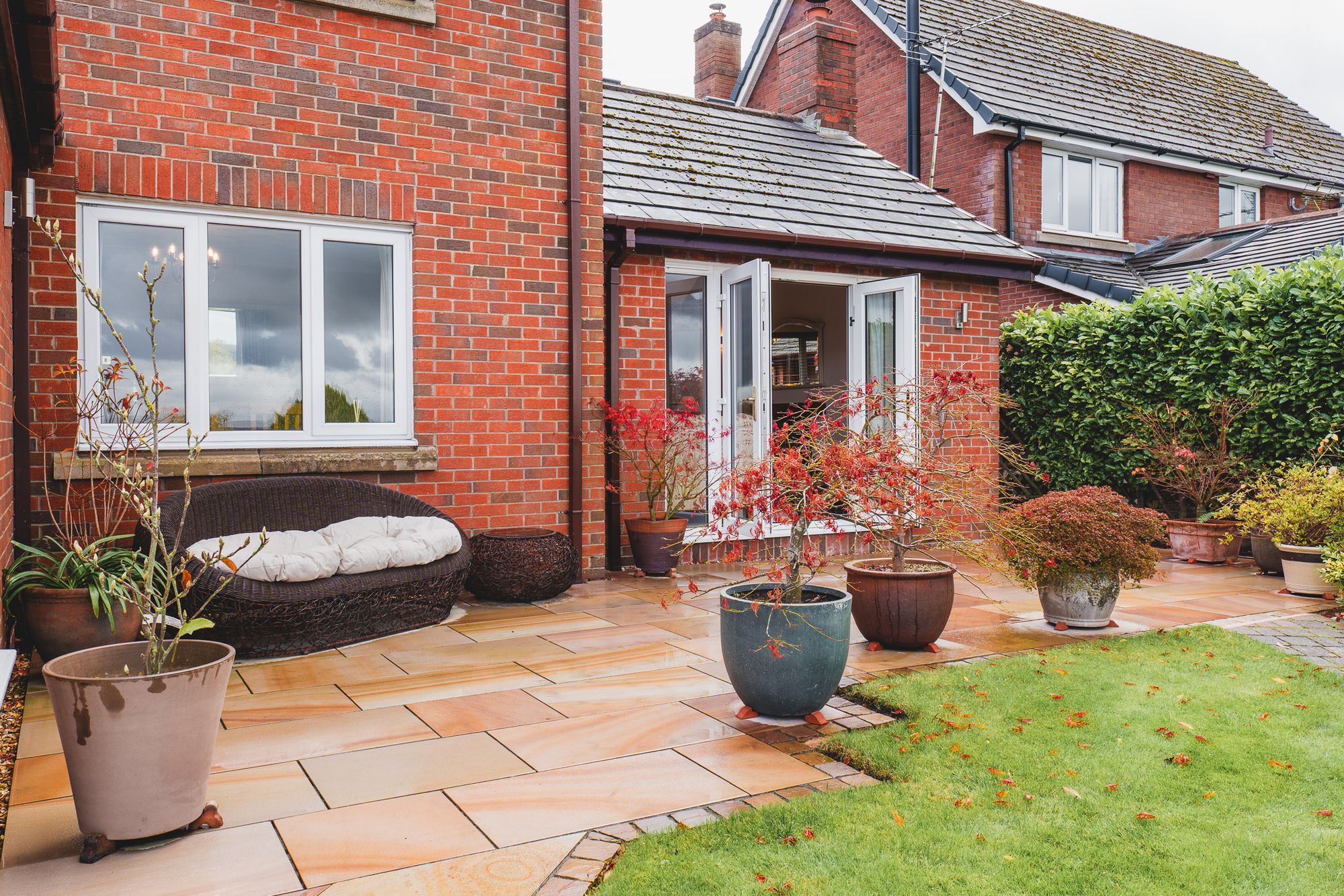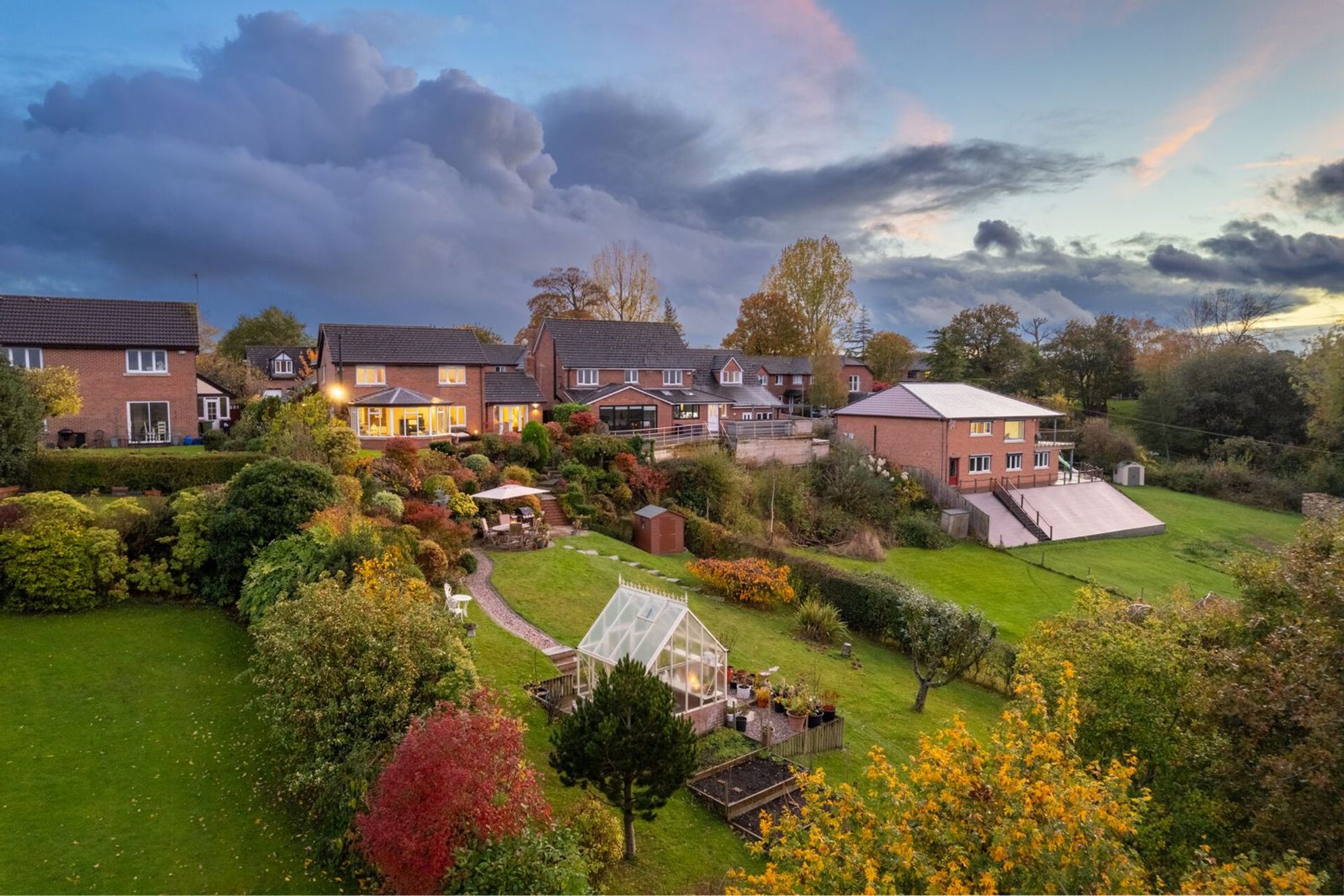 At the front, a neat lawn and mature maple tree set a peaceful, residential tone, but step out to the rear and the scene transforms. Gently sloping down from the home, the captivating garden unfolds in layers of beautifully planted borders and winding pathways, with lawns offering evergreen hues all fringed in colour and texture.