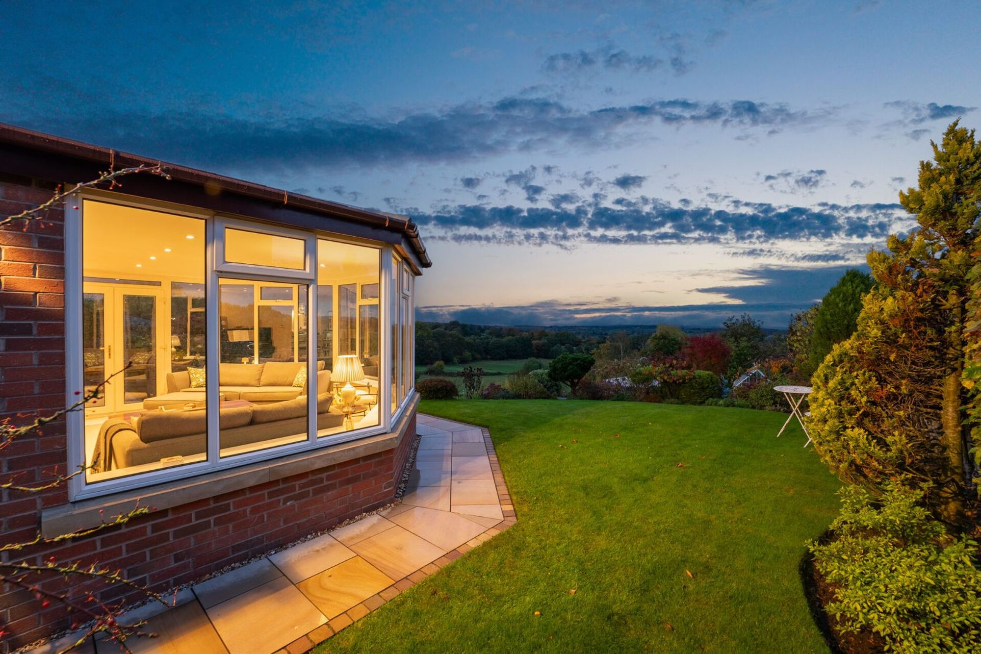 Designed as a calm, screen-free retreat, this is a versatile space that has variously served as a music room and a quiet reading spot. Panoramic glazing, with French doors opening out, draws in those incredible elevated views, capturing blush-gold sunsets spilling across the west-facing windows to early-morning mist rising over the Cheshire plains.
