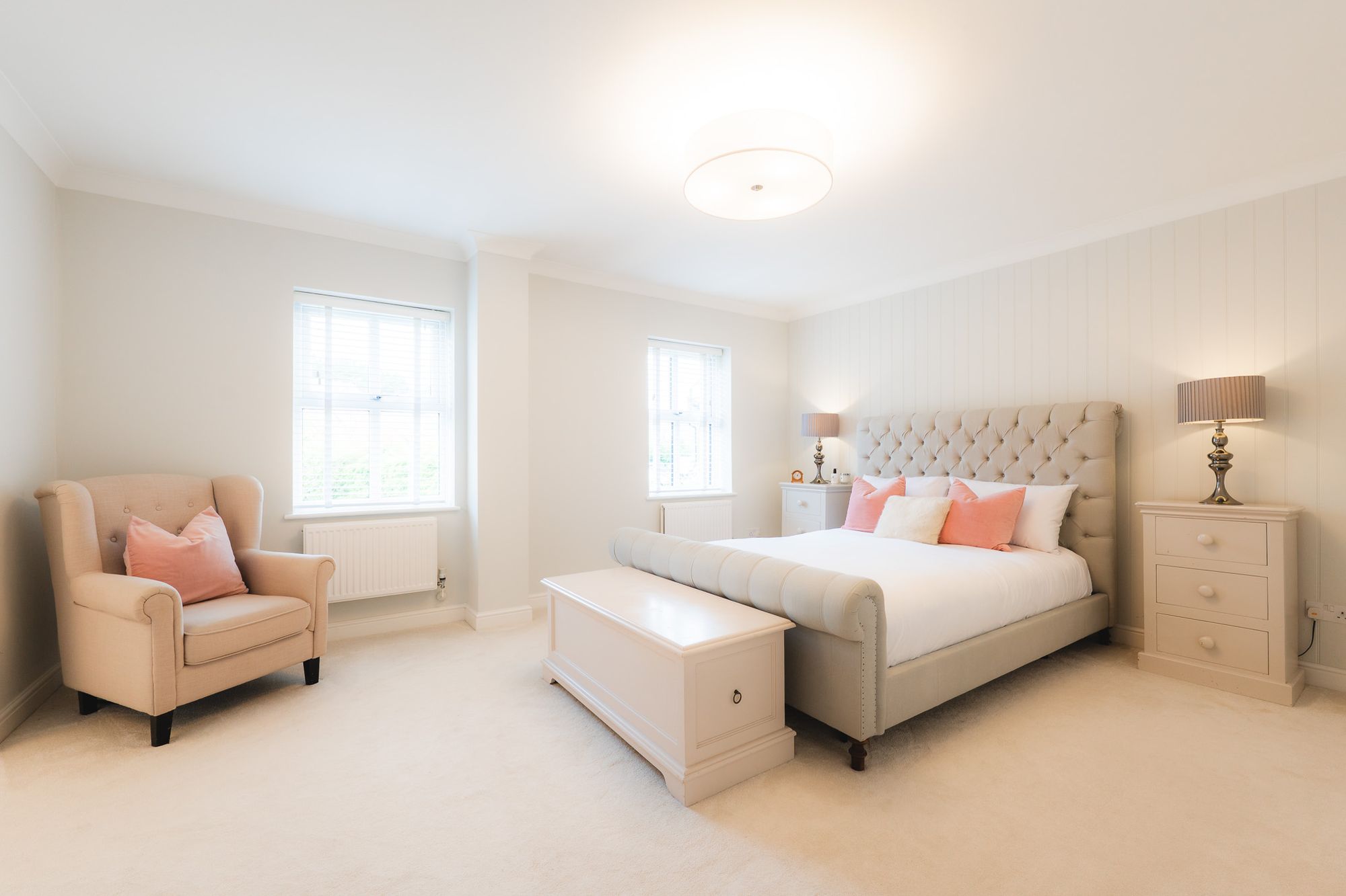 Set apart from the main flow of bedrooms, the master suite is an example of elegance, providing a spacious and refined retreat for escape and refuge at the end of a busy day. Spanning the full width of the home, wake up to nature and birdsong, with windows looking out to the cone-topped pine trees of the nearby woodland.