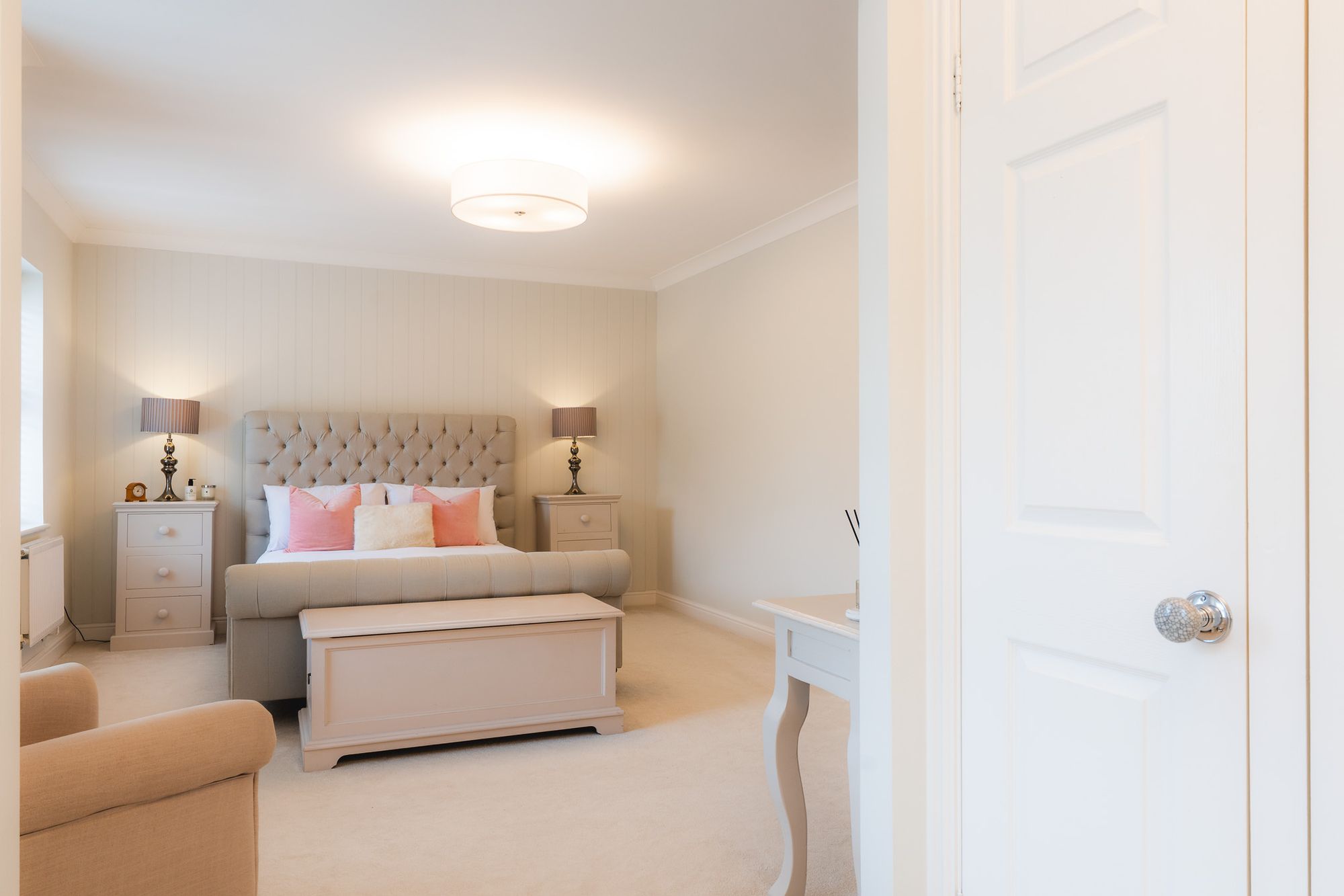 Distinguishing itself from any label of new build starkness, No. 29, Broughton Close’s soft homage to Georgian formality makes way for a light, calm interior in the entrance hall, where soft neutrals, soothing shades and layered architraves blend modern minimalism with period grace.