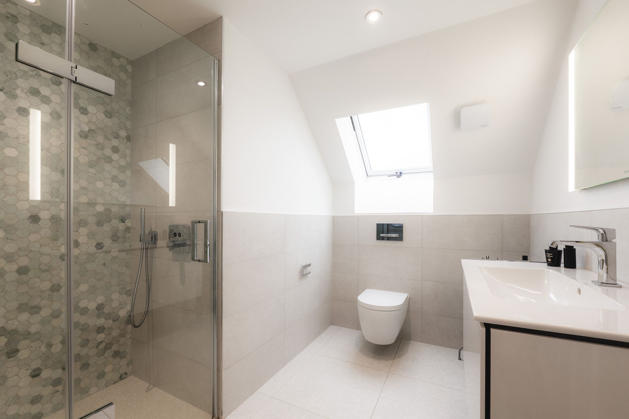 Stairs rise again to the second floor, where two spacious bedrooms sit beneath the gentle slope of the top-floor ceiling. Served by a bathroom finished in a clean grey-and-white palette, with shower, vanity basin and WC — all warmed by underfloor heating — this level works beautifully as a self-contained guest floor. Equally, it lends itself to older teens seeking a little more independence, with the option to use one room as a bedroom and the other as a private lounge or games room.