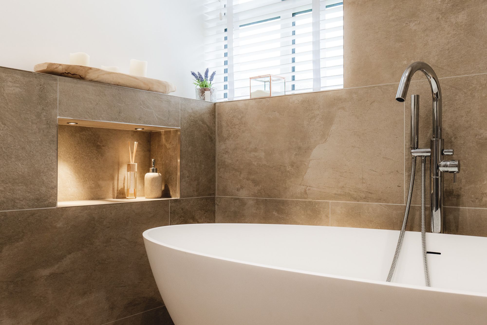 Also offering a luxurious, spa-like experience, is the main family bathroom, dressed in soft stone hues and warm, ambient lighting. Slip away from the hustle and bustle of family life and soak away the aches in the freestanding, egg-shaped bath with showerhead attachment, candles flickering, and glass of wine waiting in reaching distance in the tiled alcove to the side.