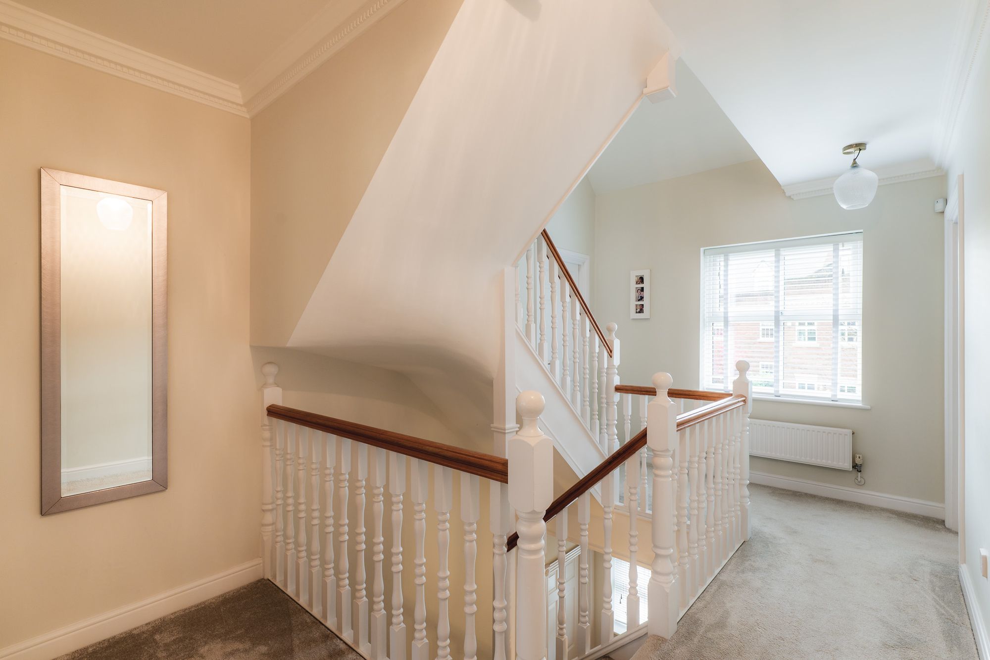 From the kitchen, the flow continues effortlessly through to the snug, or back into the entrance hall, where the carpeted stairs curve gently up to the first-floor landing.