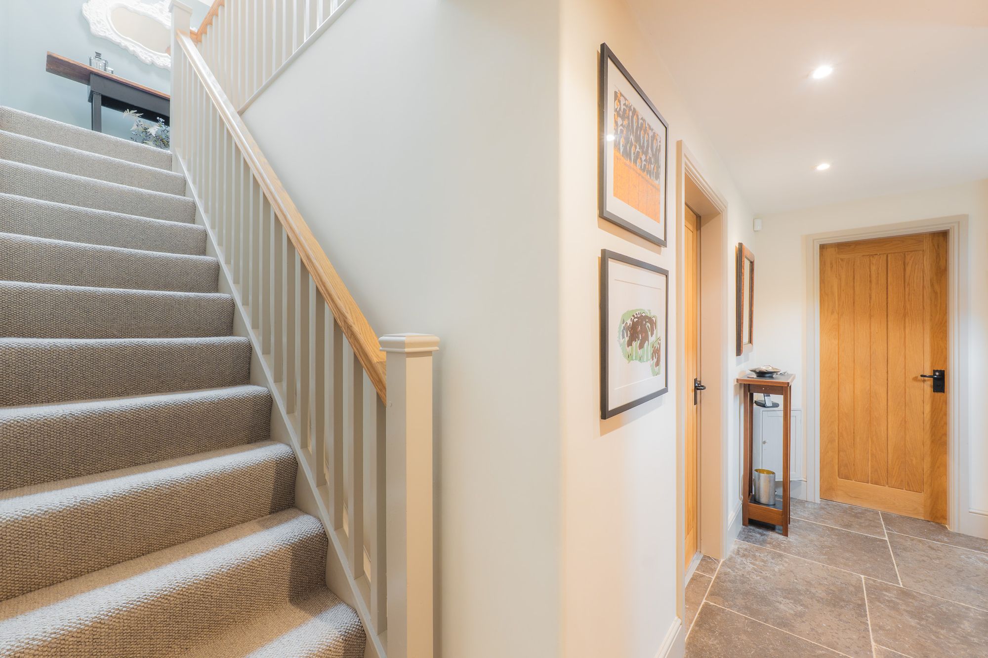Returning to the entrance hall, stairs lead up to the landing, where a splash of aqua blue dresses the wall ahead, and beams stretch out above.