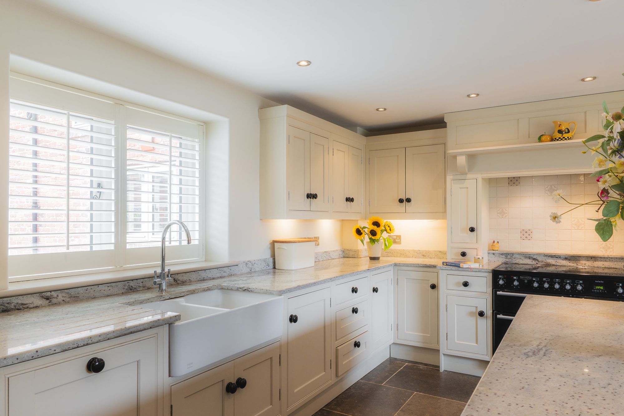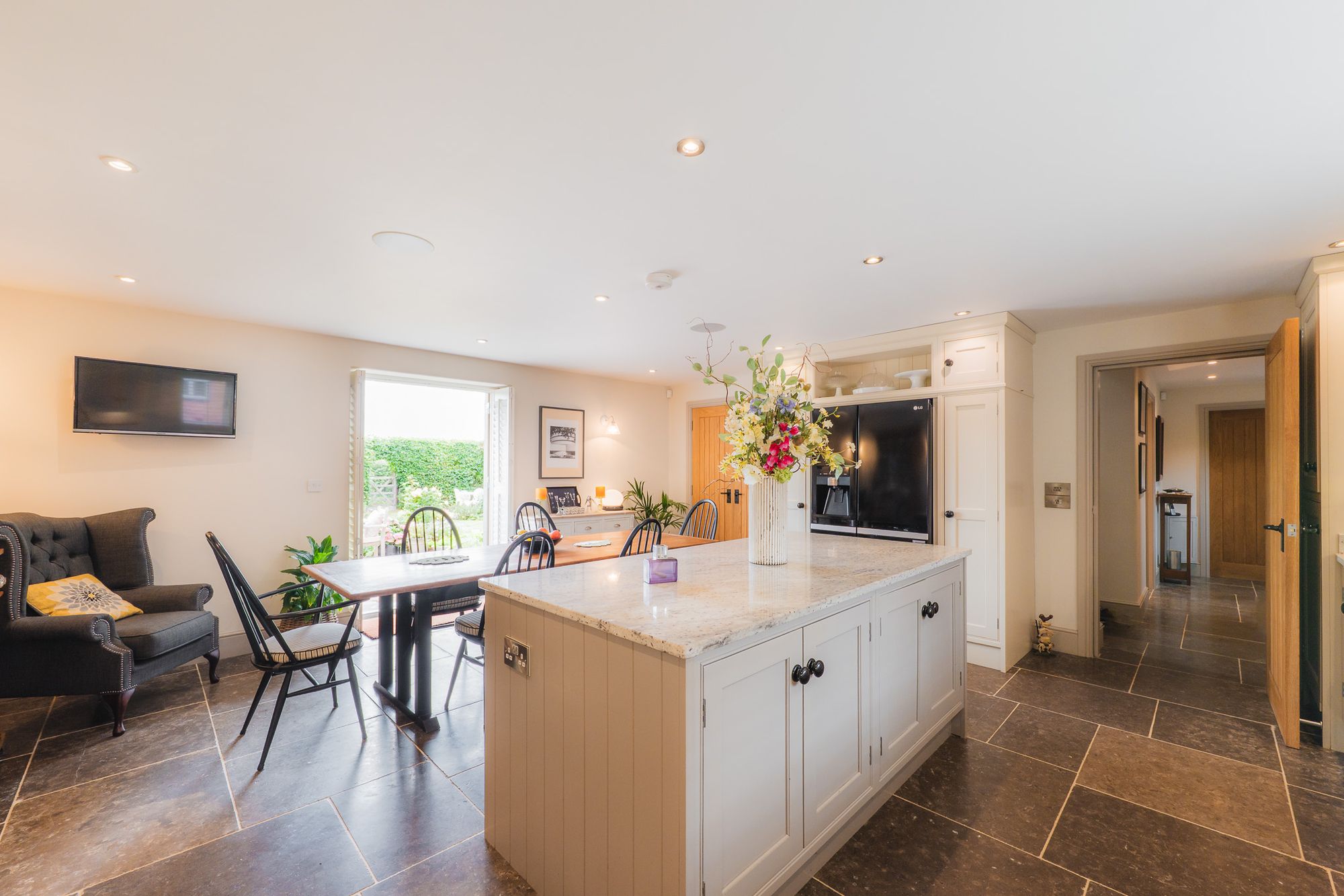 When company calls, the dining-kitchen transforms readily into an entertaining haven, its large, slate-style tiling amplifying the spaciousness of the open plan room. Plantation shuttered windows to the front provide both privacy and light from above the Belfast sink, while alabaster white worktops offer ample space for food prep.