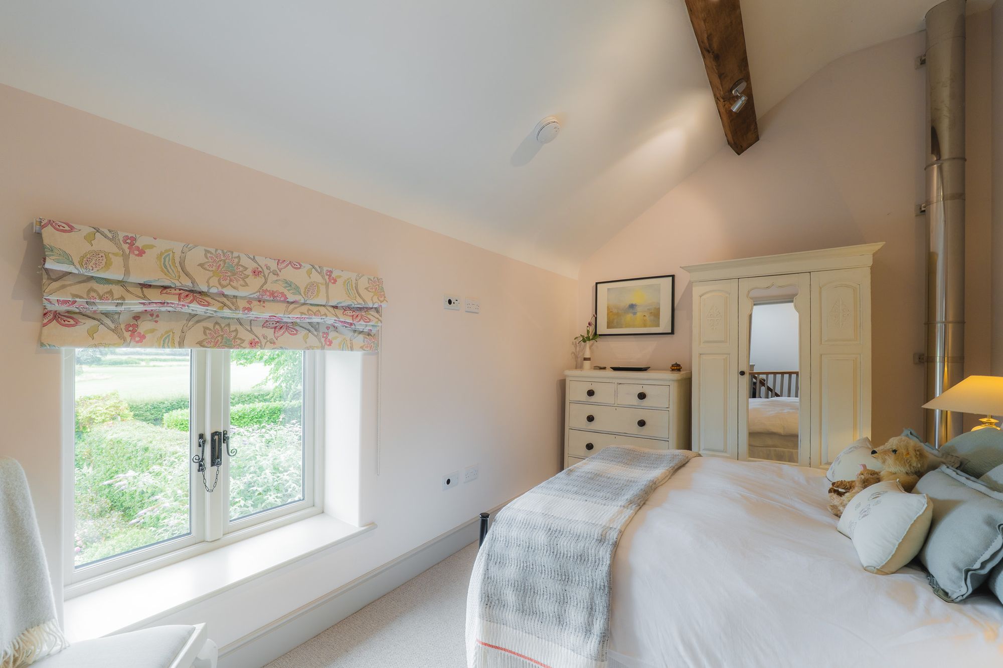 On the right, step into the first of the bedrooms, a spacious double, where glorious views beckon from the daintily latched window, out over the garden and to the countryside beyond, while beams adorn the high ceiling above.