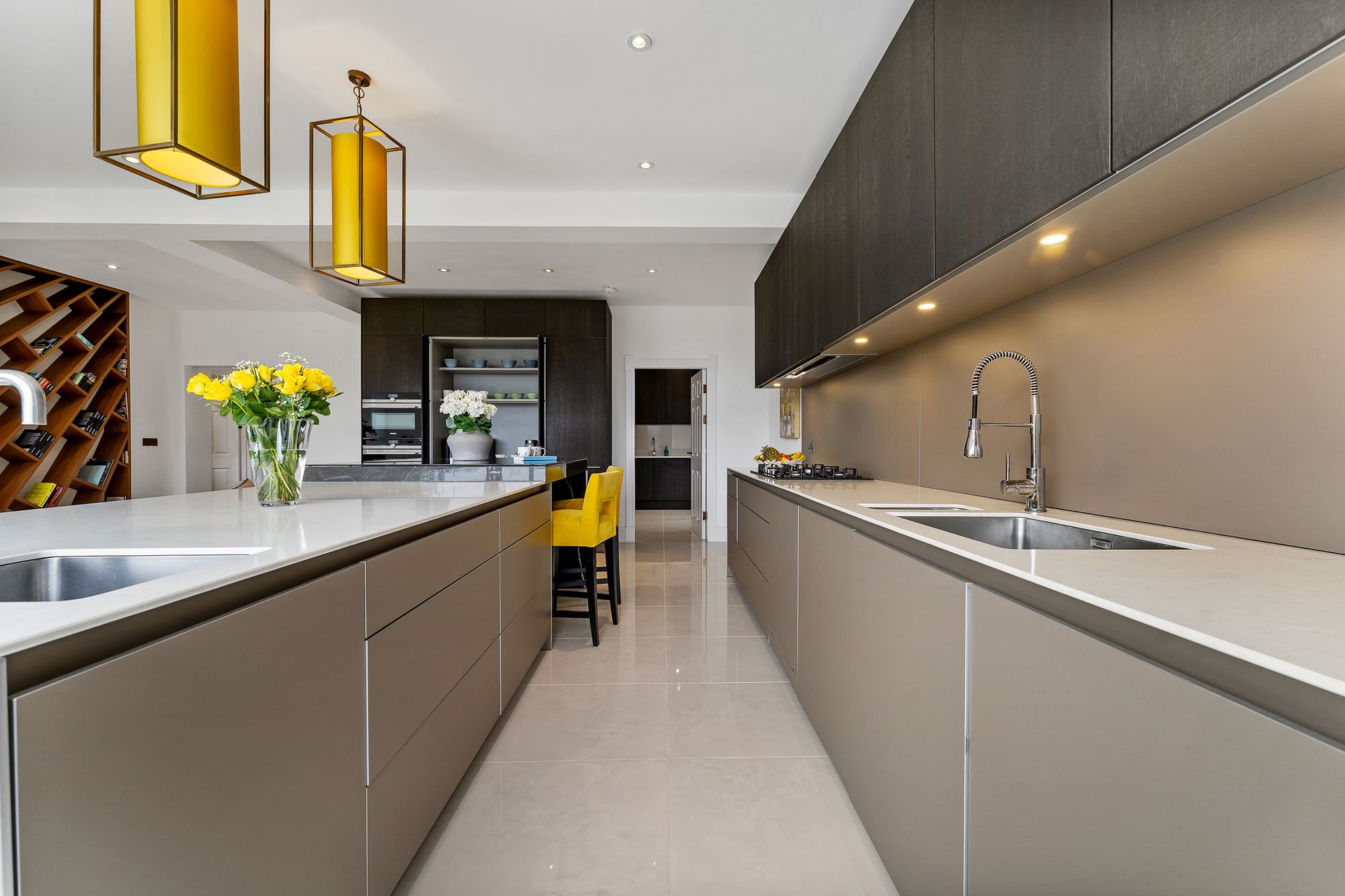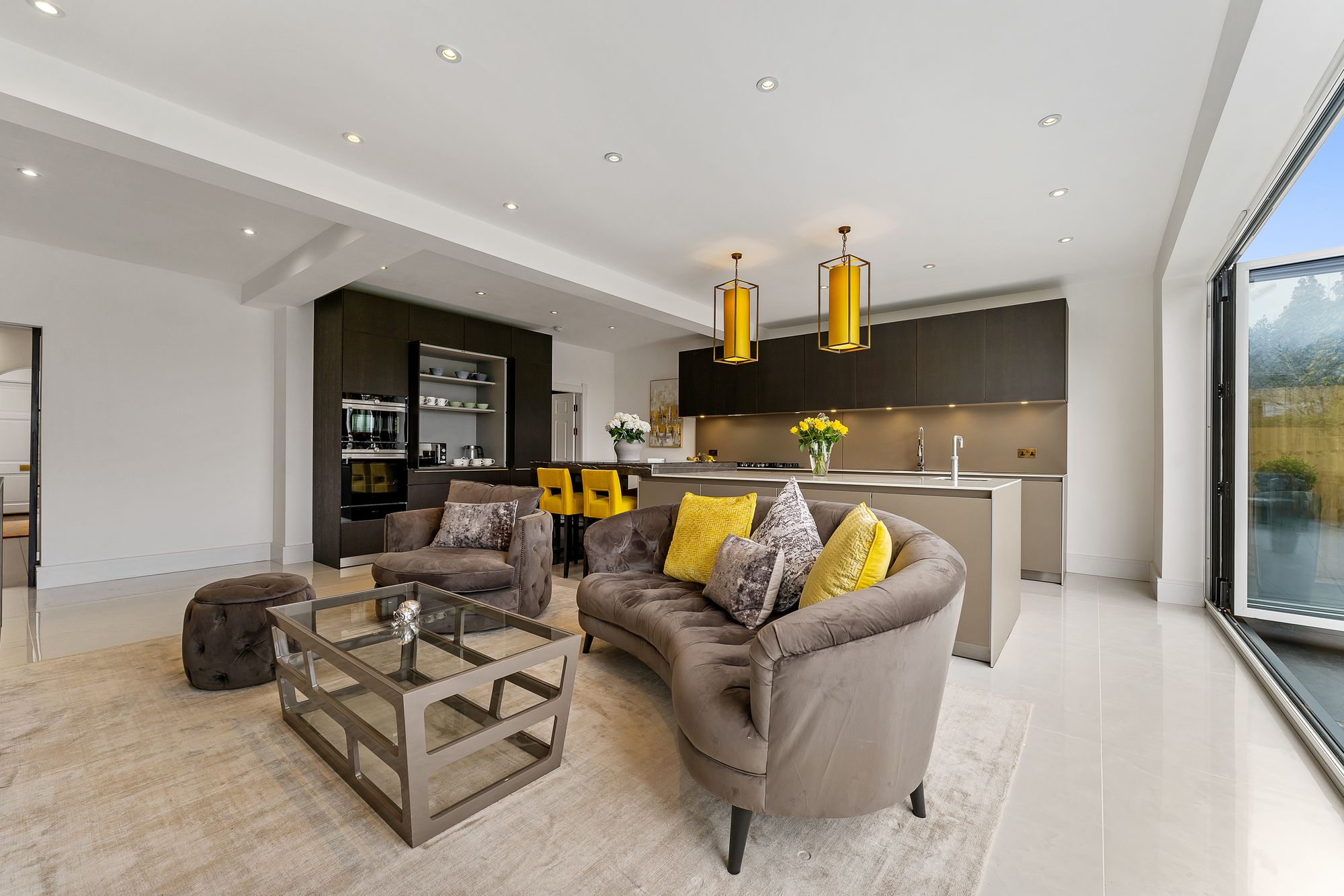 Capturing the essence of the period character, sliding Crittall-style doors open to reveal the designer Bulthaup kitchen, the sociable heart of this home. Warmth flows out beneath the porcelain tiles underfoot, also featuring in the study and lounge and continuing through into the utility room.