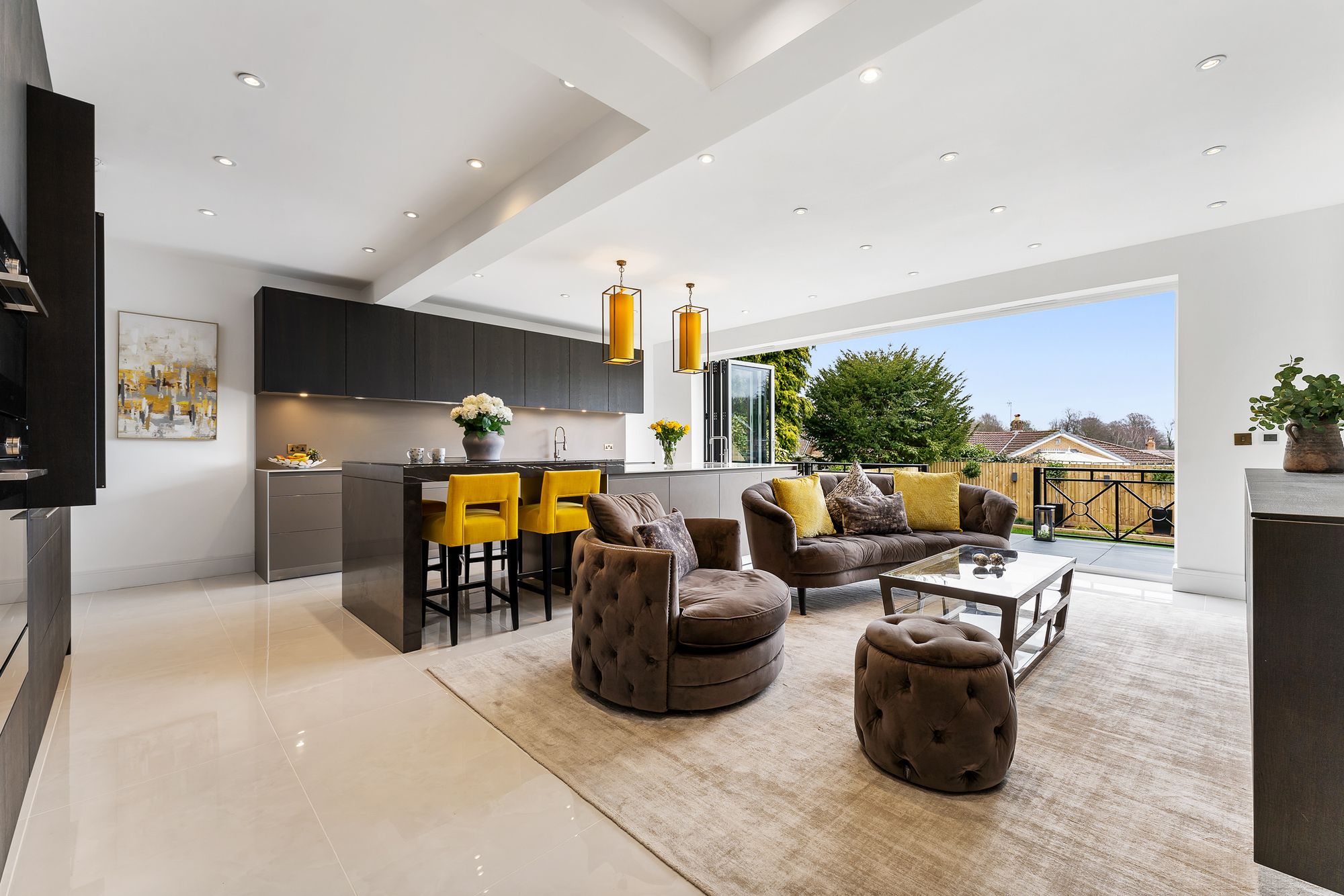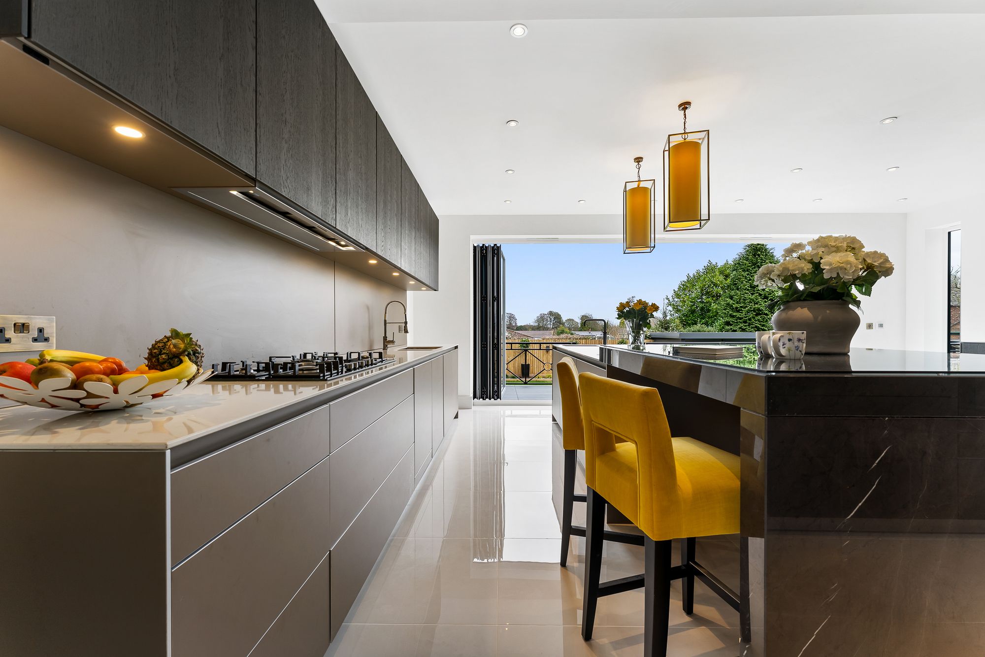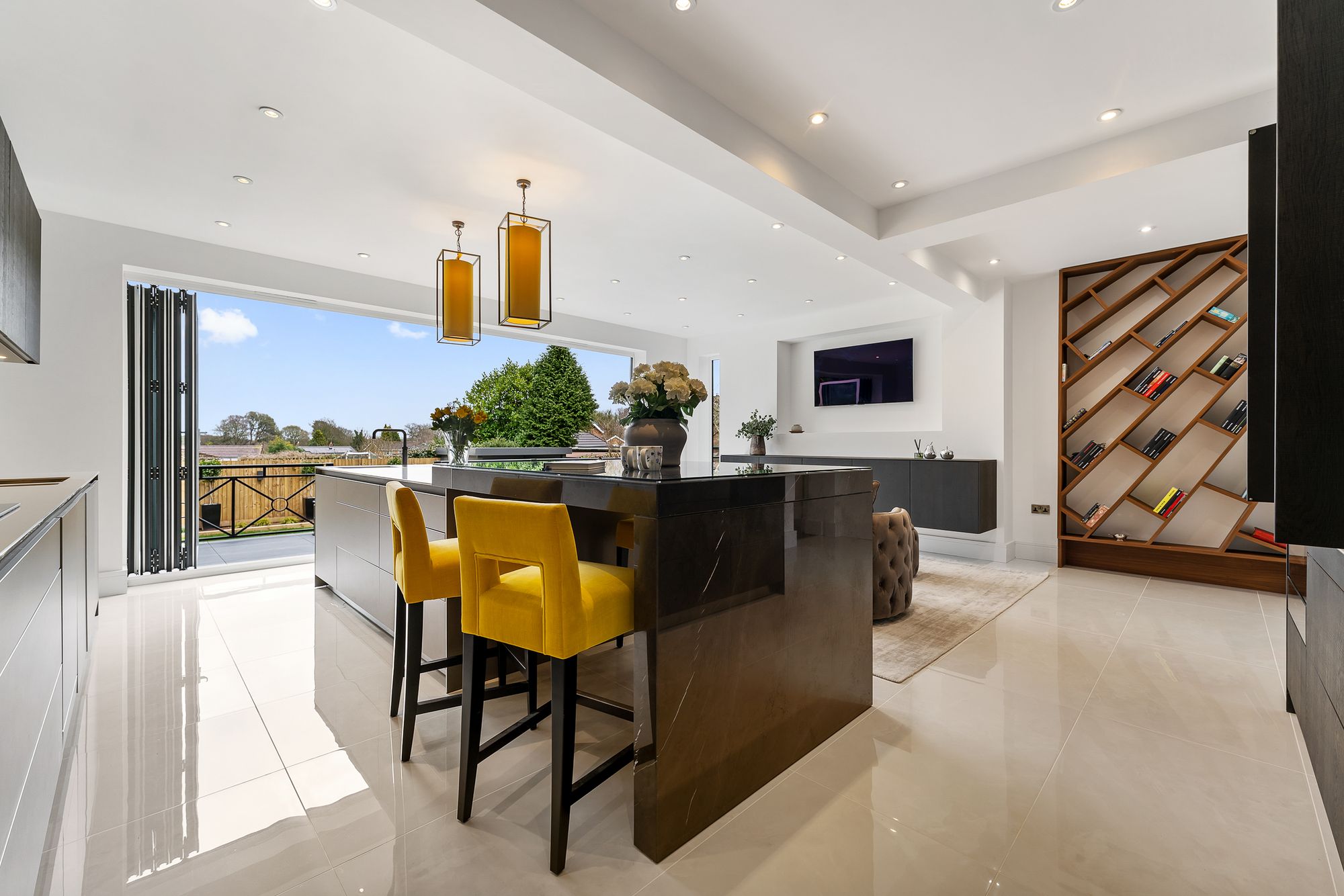 Full width bifold doors open out to the elevated porcelain patio, drawing in far-reaching views across garden, rooftops and treetops, offering easy access out for al fresco dining on sunny days.