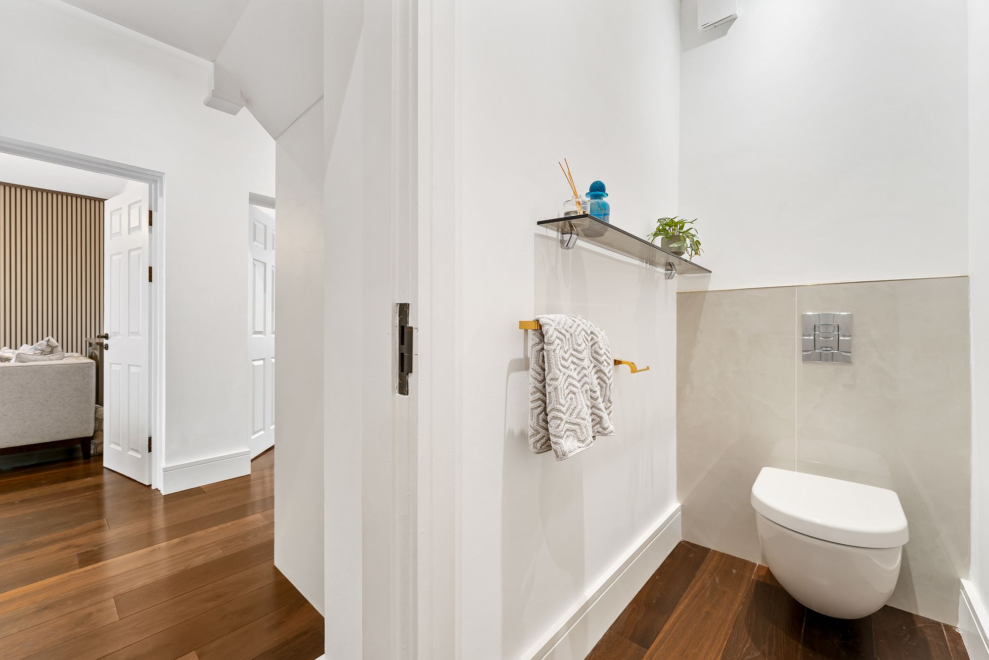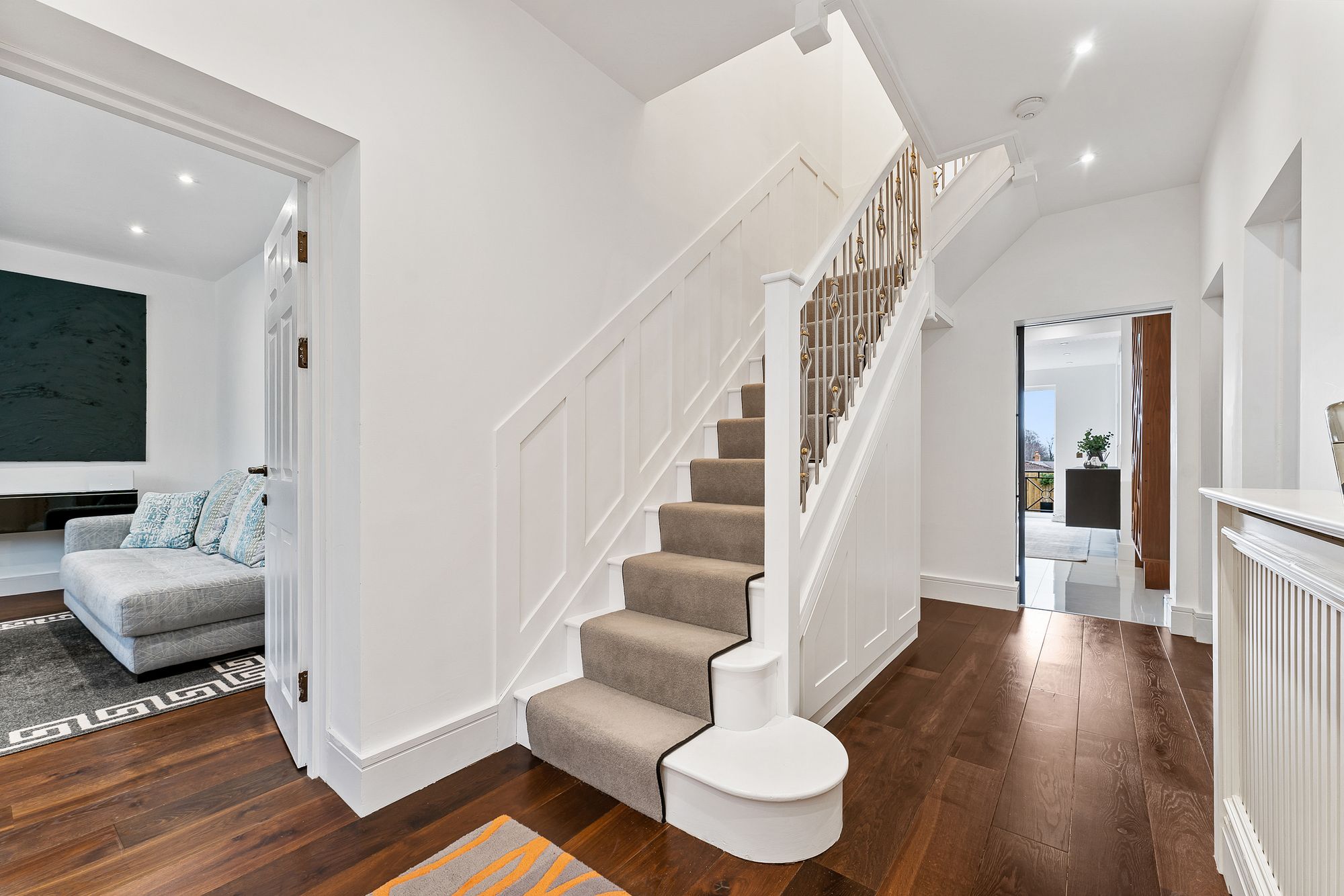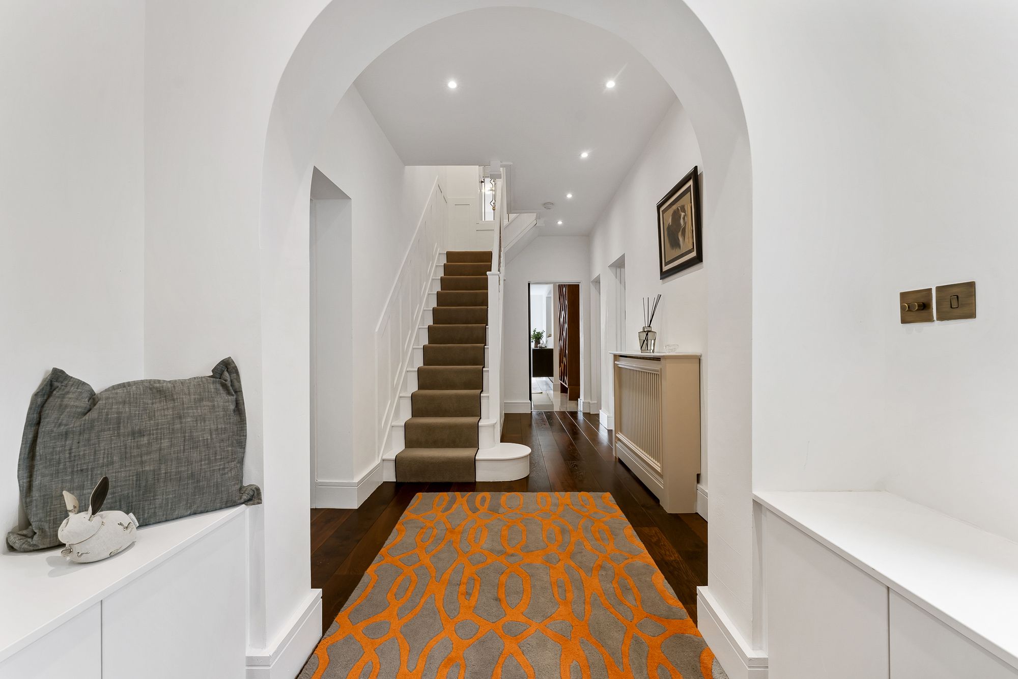 Inside, the archway above the door is mirrored, framing a broad, bright and inviting entrance hallway, where the fresh white décor and contemporary spotlighting contrast elegantly with the rich polished tones of the engineered dark oak flooring underfoot.