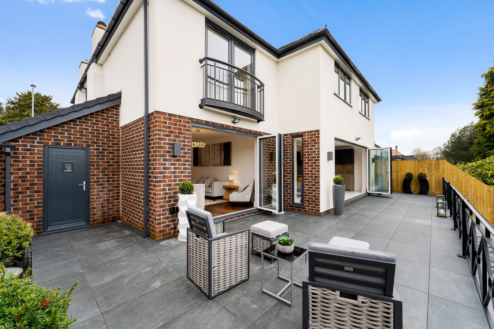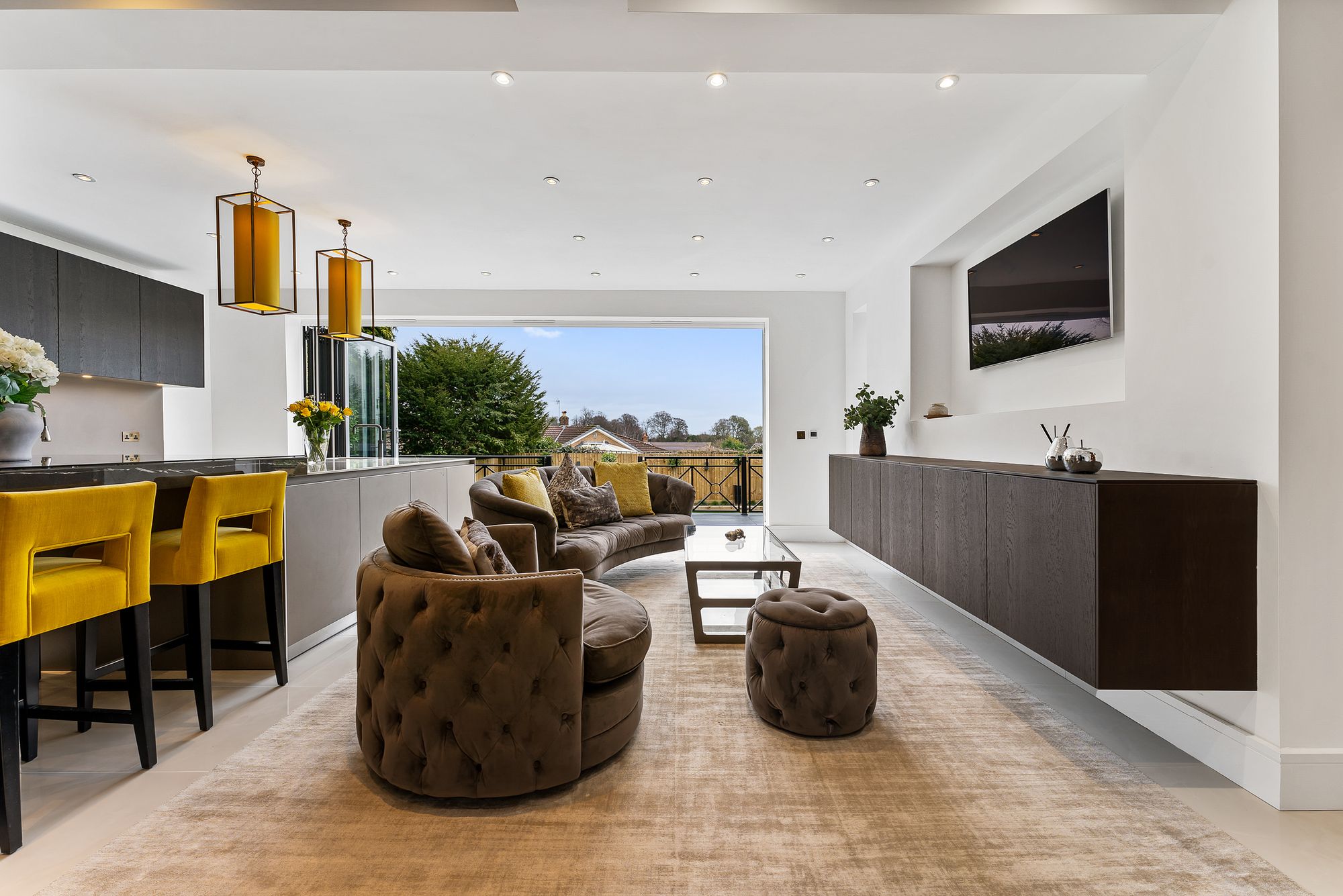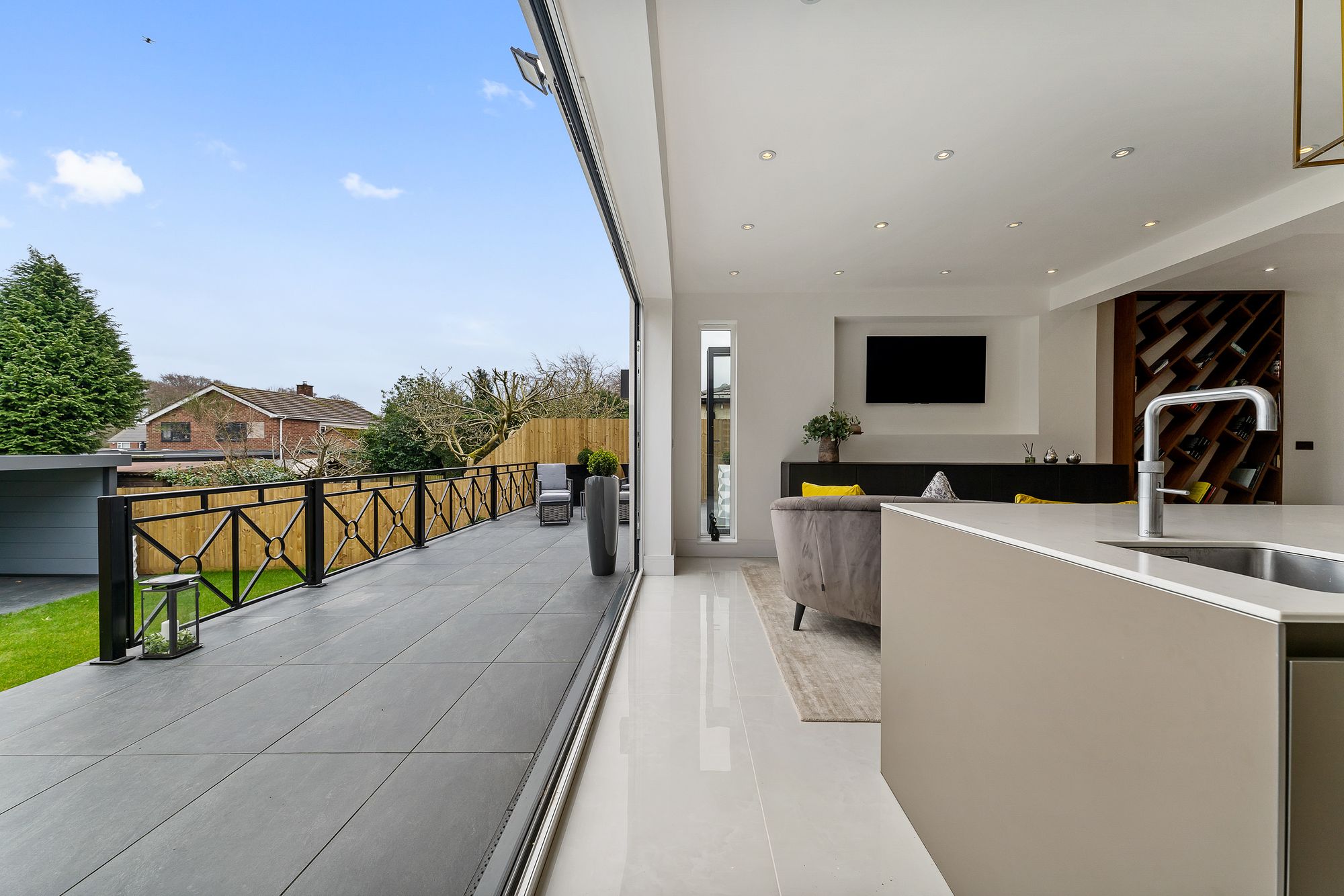 The embodiment of modern living, the light filled lounge at the rear is a spacious room, where a contemporary media wall features a wall-mounted TV with a linear, underlit, inset fire beneath, set against vertical slatted panelling adding depth and warmth to this graceful, minimal family room. Bifolding doors open at the rear, stepping out onto an elevated porcelain patio overlooking the garden, perfect for indoor outdoor living in the summer months.