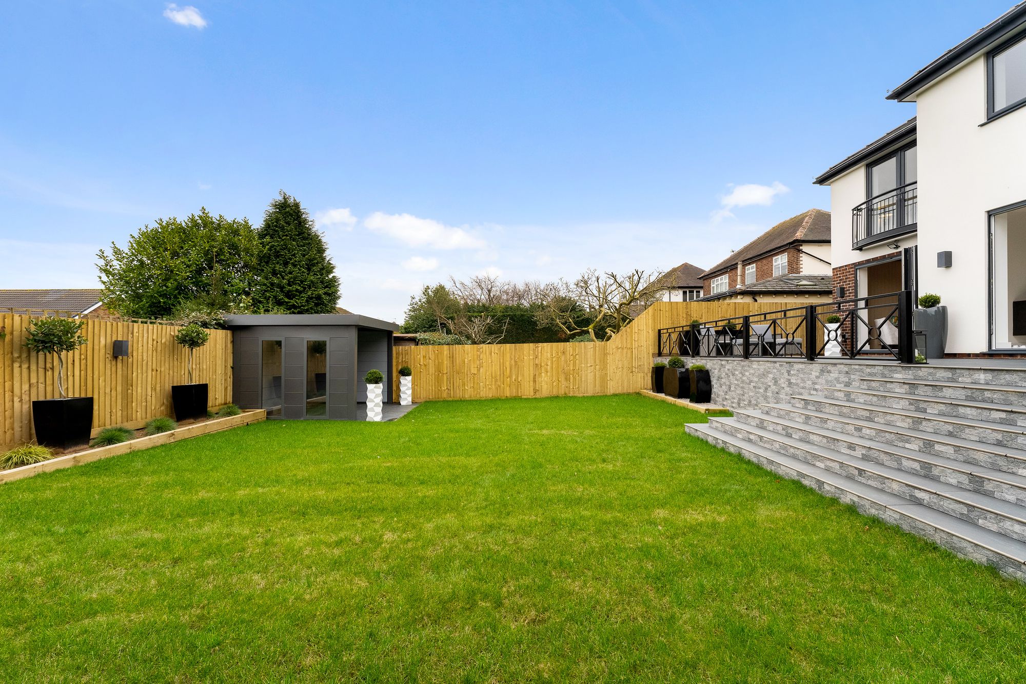 From here, steps lead down to a sunken lawn, creating a natural transition between spaces, with plenty of room for children to play.