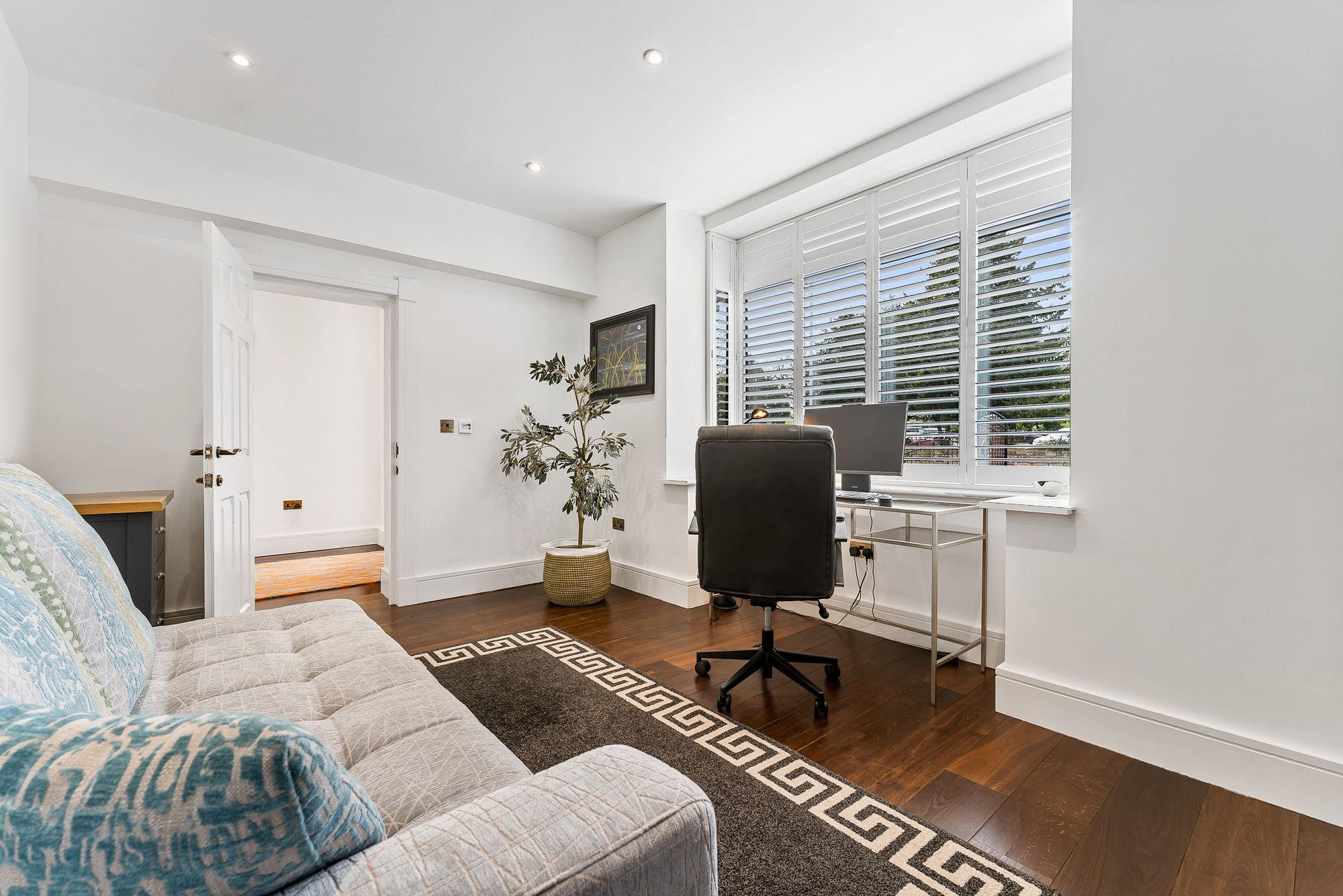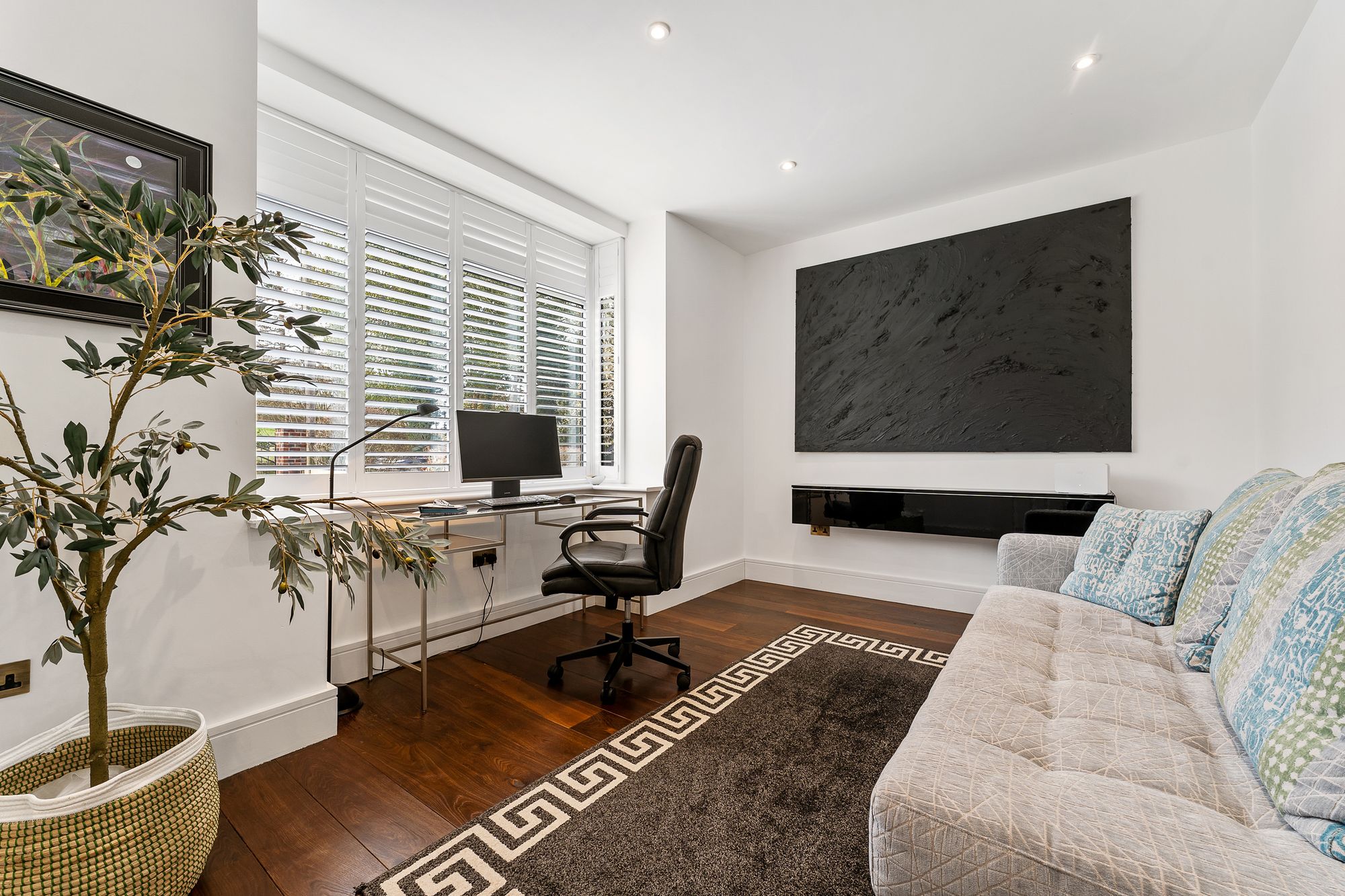 To the left, work from home in peace and quiet calm in the study; a spacious room filled with light, offering the perfect place for a desk in the bay window to the front. Ideal also as a snug, there is currently wall mounted original art in place, but it could accommodate a television with plenty of space for a sofa.