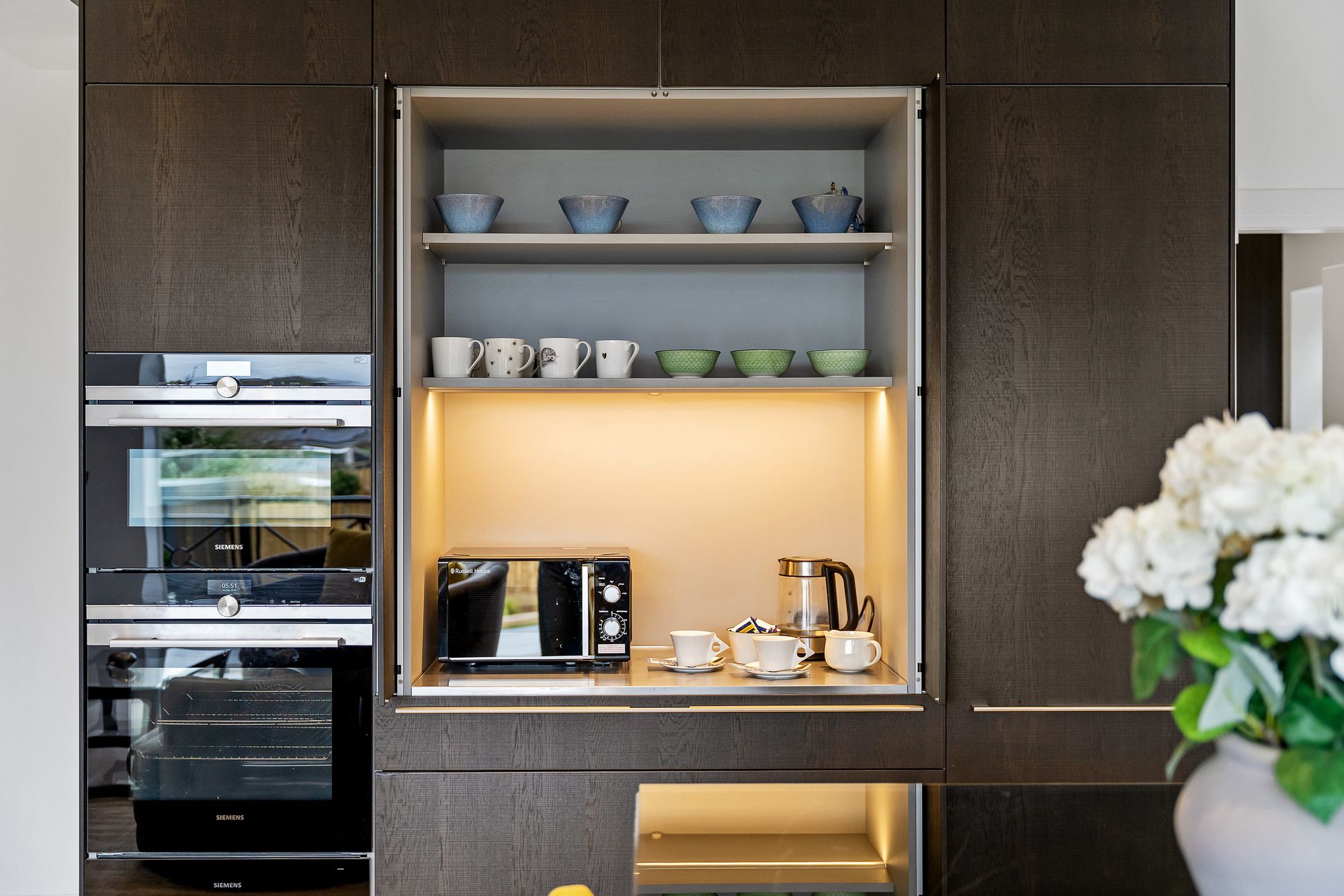 For sociable dining, the substantial island, finished in dark marble and topped with a sleek sheet of tinted black glass, creates a natural gathering point, perfect for breakfast on the go or a glass of wine in the evening, its surface catching the light with a soft, polished sheen. Alongside, Corian worktops provide a practical, contemporary counterpoint, offering ample preparation space. Siemens appliances feature throughout including ovens, warming drawer, a full-height fridge, under-counter freezer, dishwasher and a five-burner gas hob set beneath a statement extractor. Storage, another strength of No. 339, is abundant in the kitchen, with further provision found within the utility room.