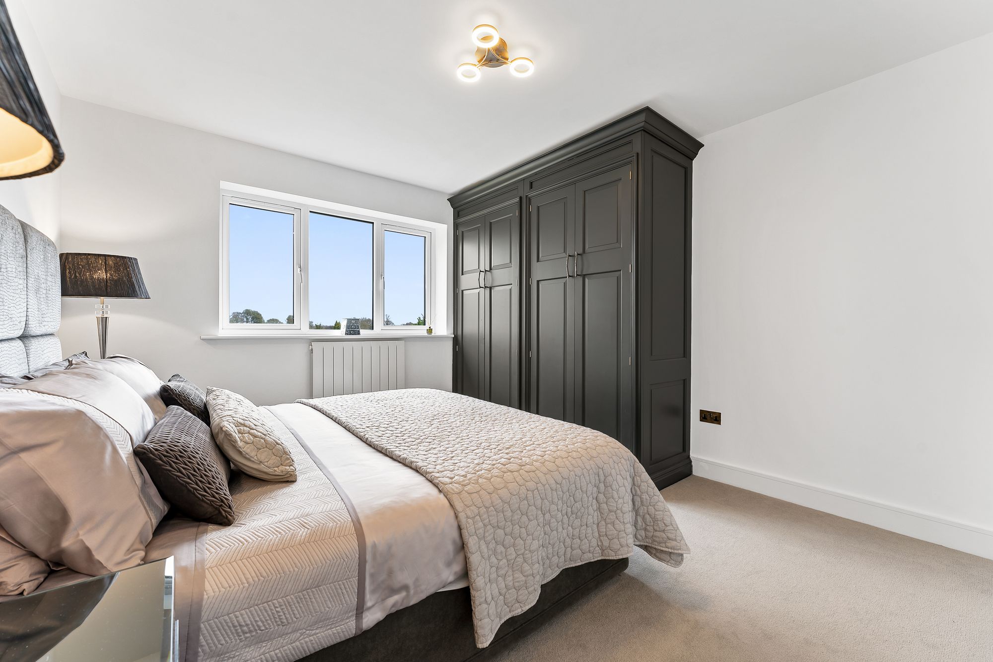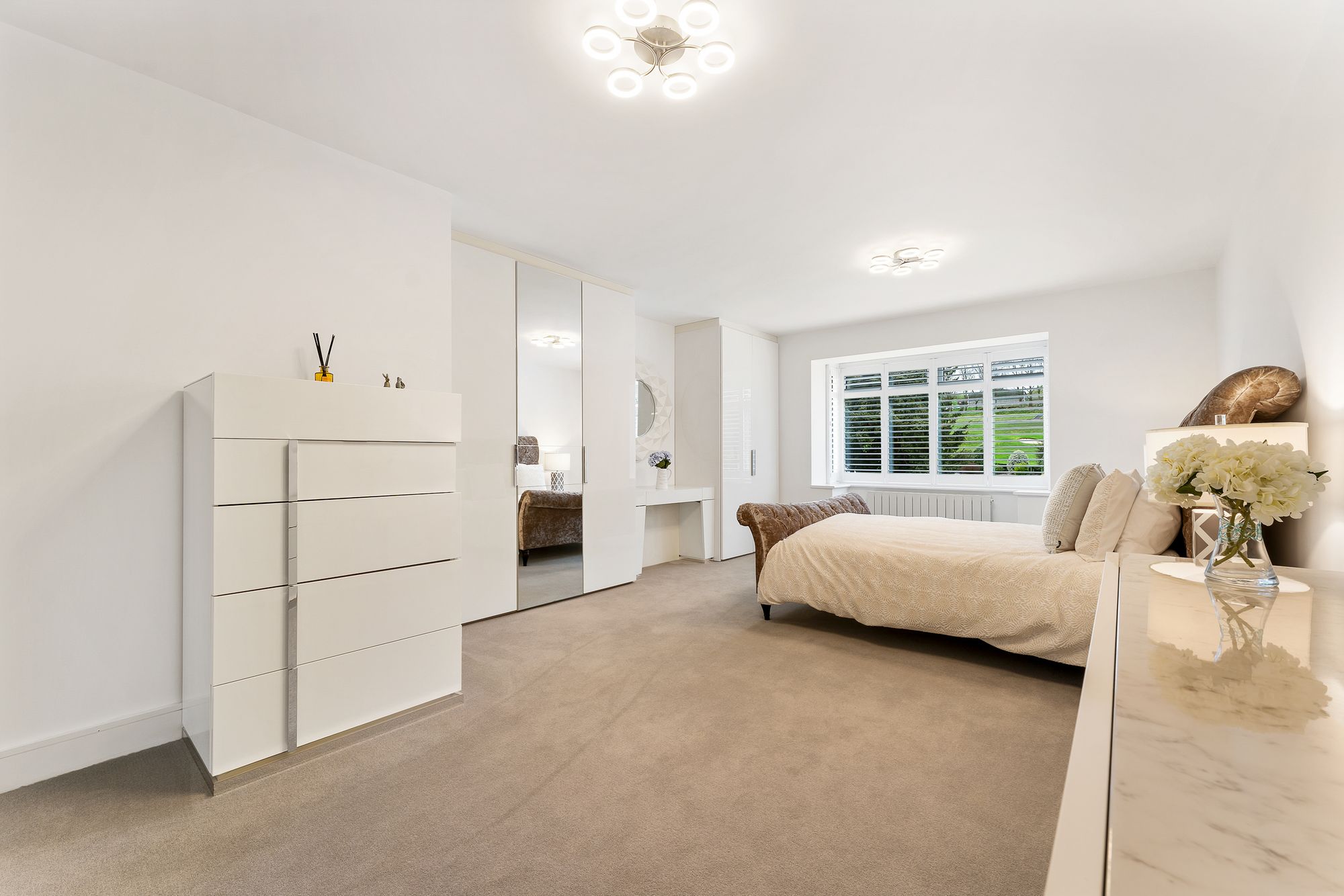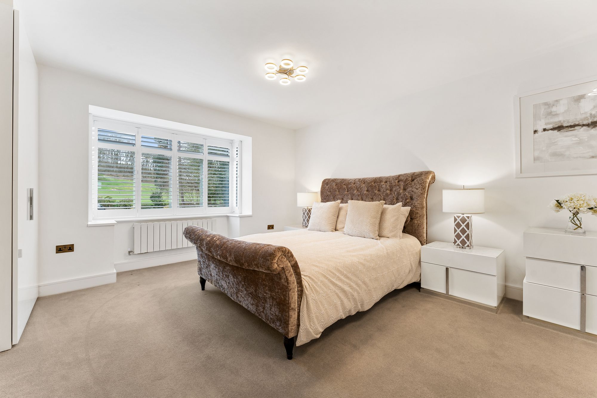 A wow-factor bedroom, a true sanctuary in white and beige, the master suite offers abundant storage in the built-in wardrobes. Wake up to peaceful, leafy views, before refreshing in the boutique standard shower room en suite with twin sculptural wash basins.