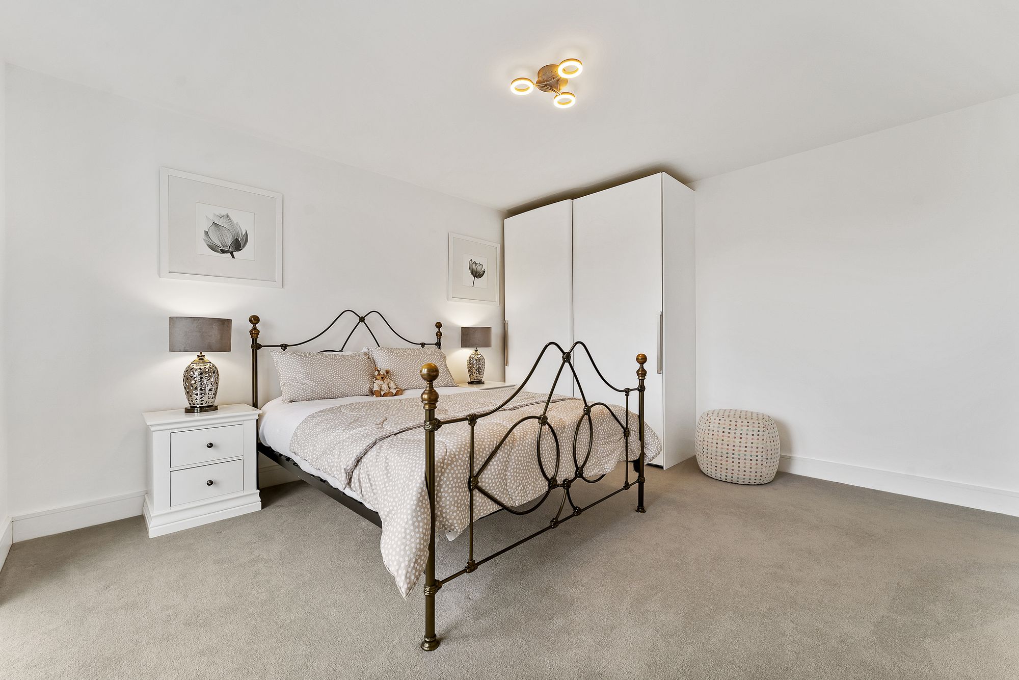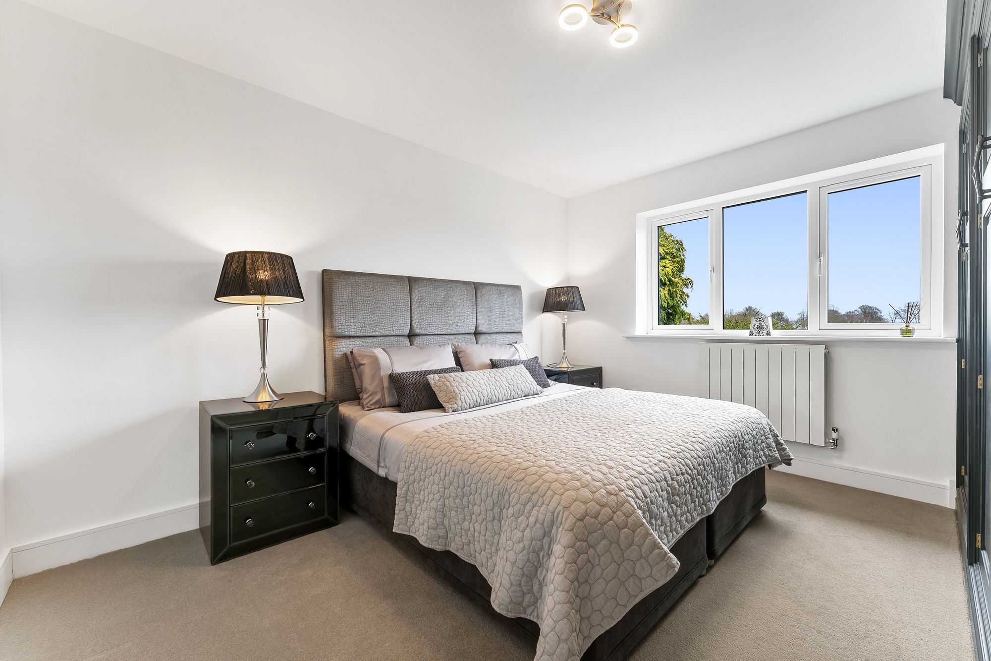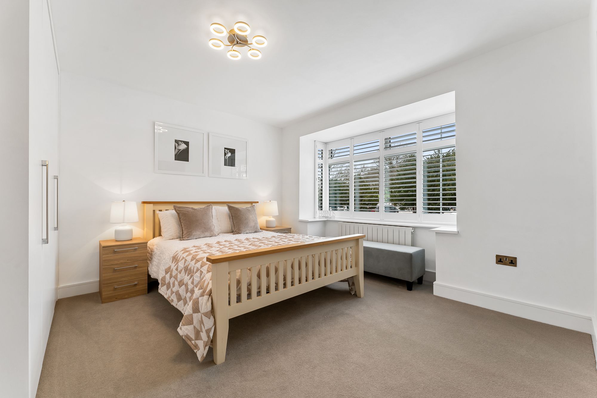A wow-factor bedroom, a true sanctuary in white and beige, the master suite offers abundant storage in the built-in wardrobes. Wake up to peaceful, leafy views, before refreshing in the boutique standard shower room en suite with twin sculptural wash basins.