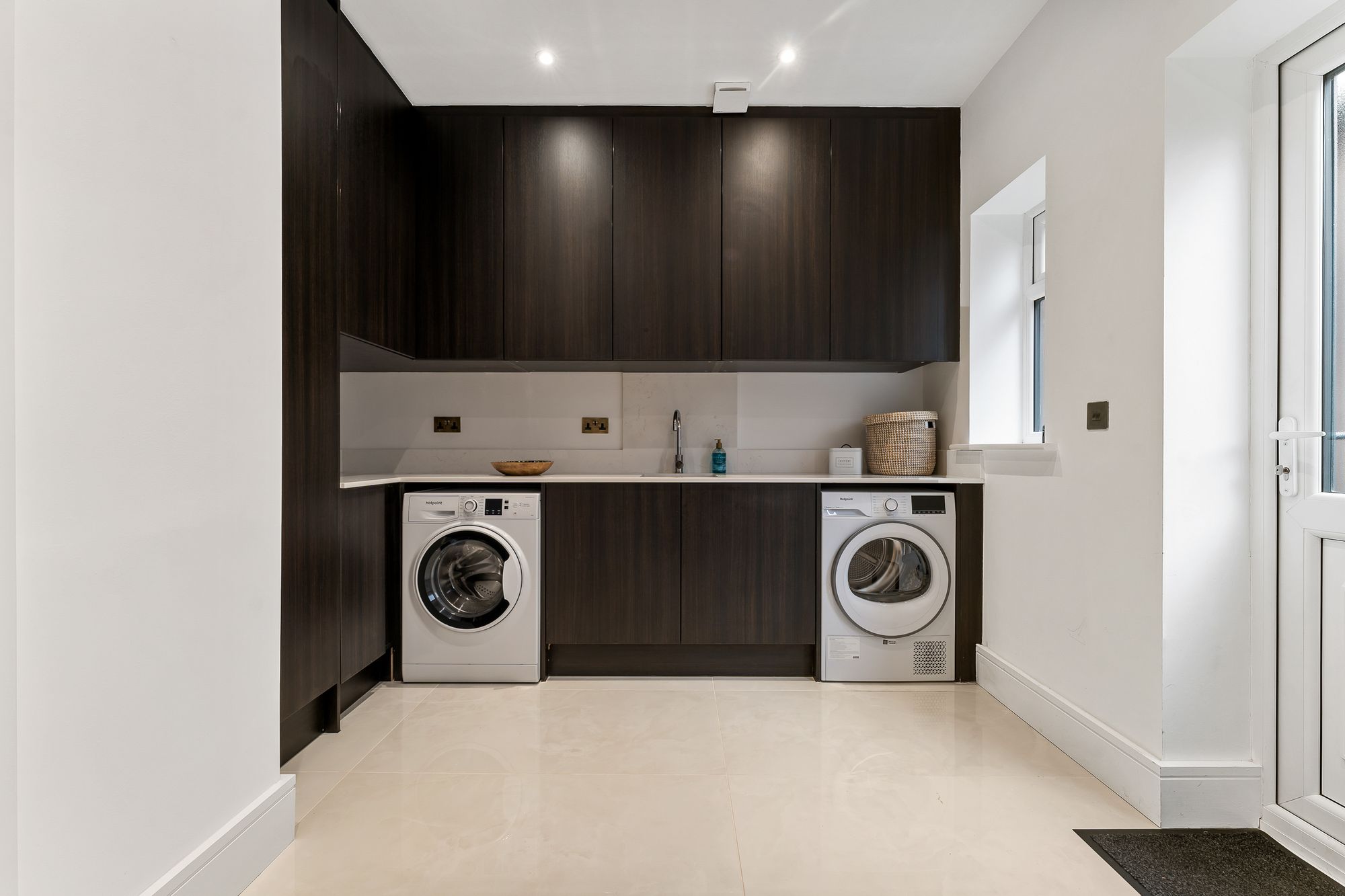 A user-friendly space, the utility room also features plumbing for washing machine and dryer, alongside ample storage including a traditional broom cupboard for taller cleaning items including vacuum, while the boiler is discreetly housed out of sight, ensuring a streamlinedlook.