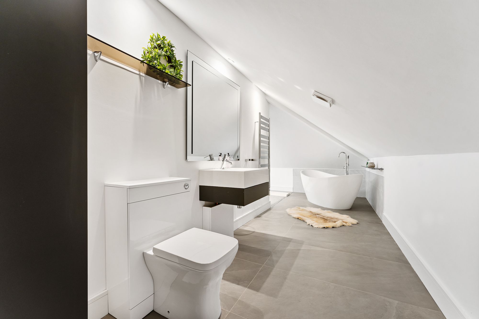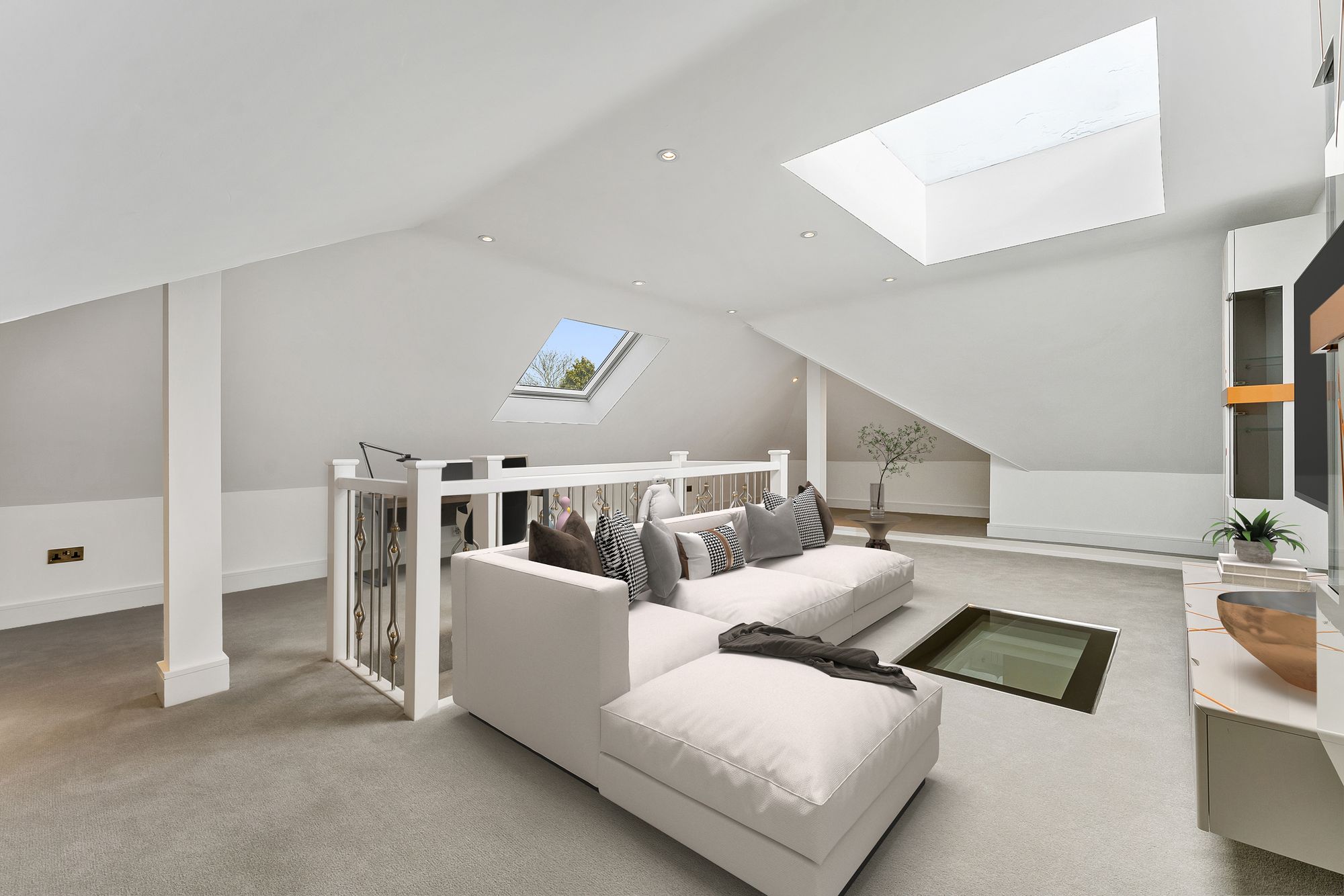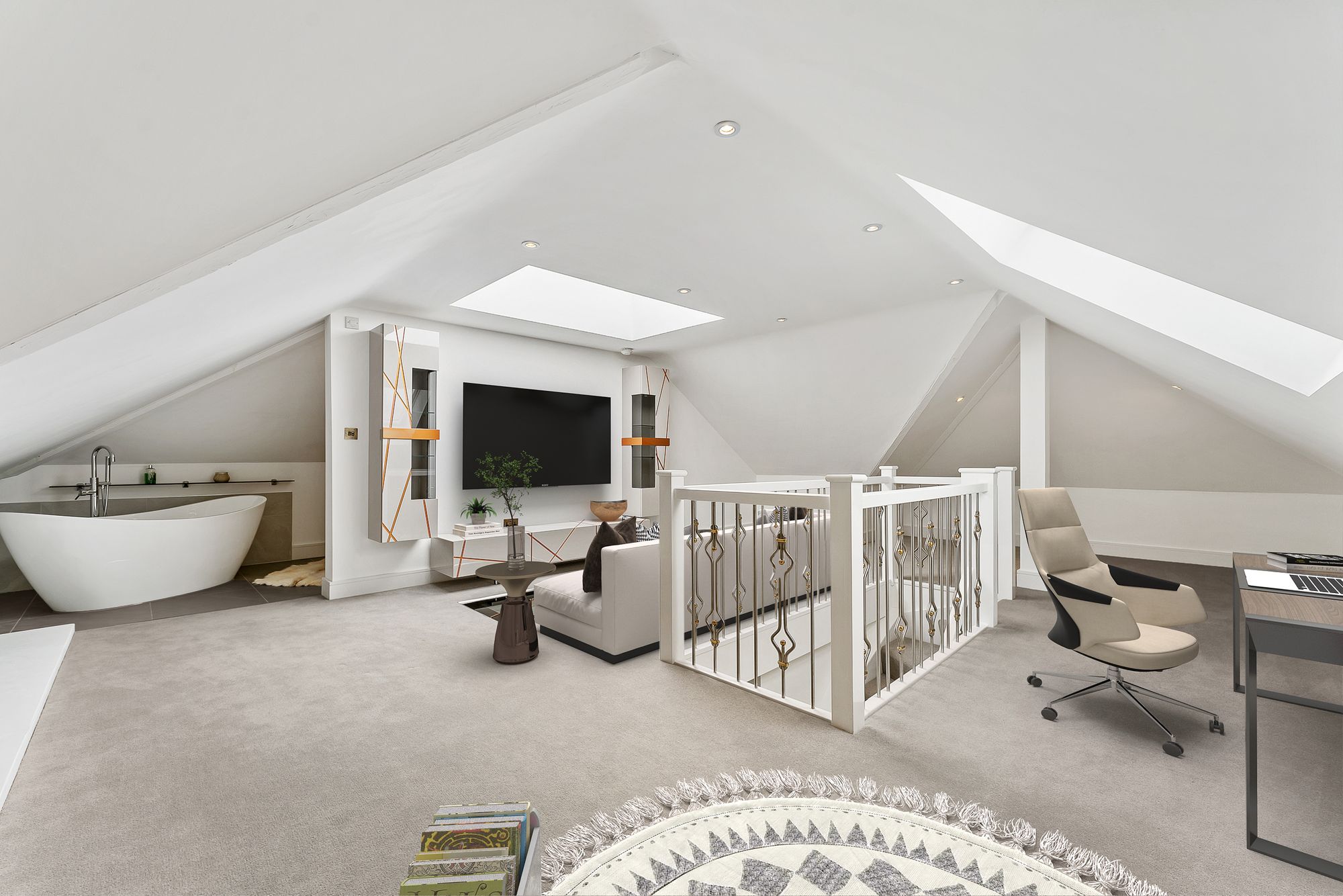 Opening up into a vast, open-plan space, the central staircase arrives at the middle of the room, naturally dividing it into zones for sleeping, working, and relaxing, without the need for walls. Set beneath the eaves, a tucked away en suite awaits with freestanding bath. A versatile space, it could equally serve as a bedroom suite, studio, yoga space or playroom.
