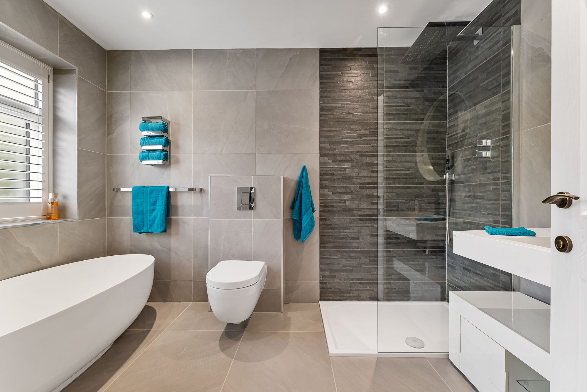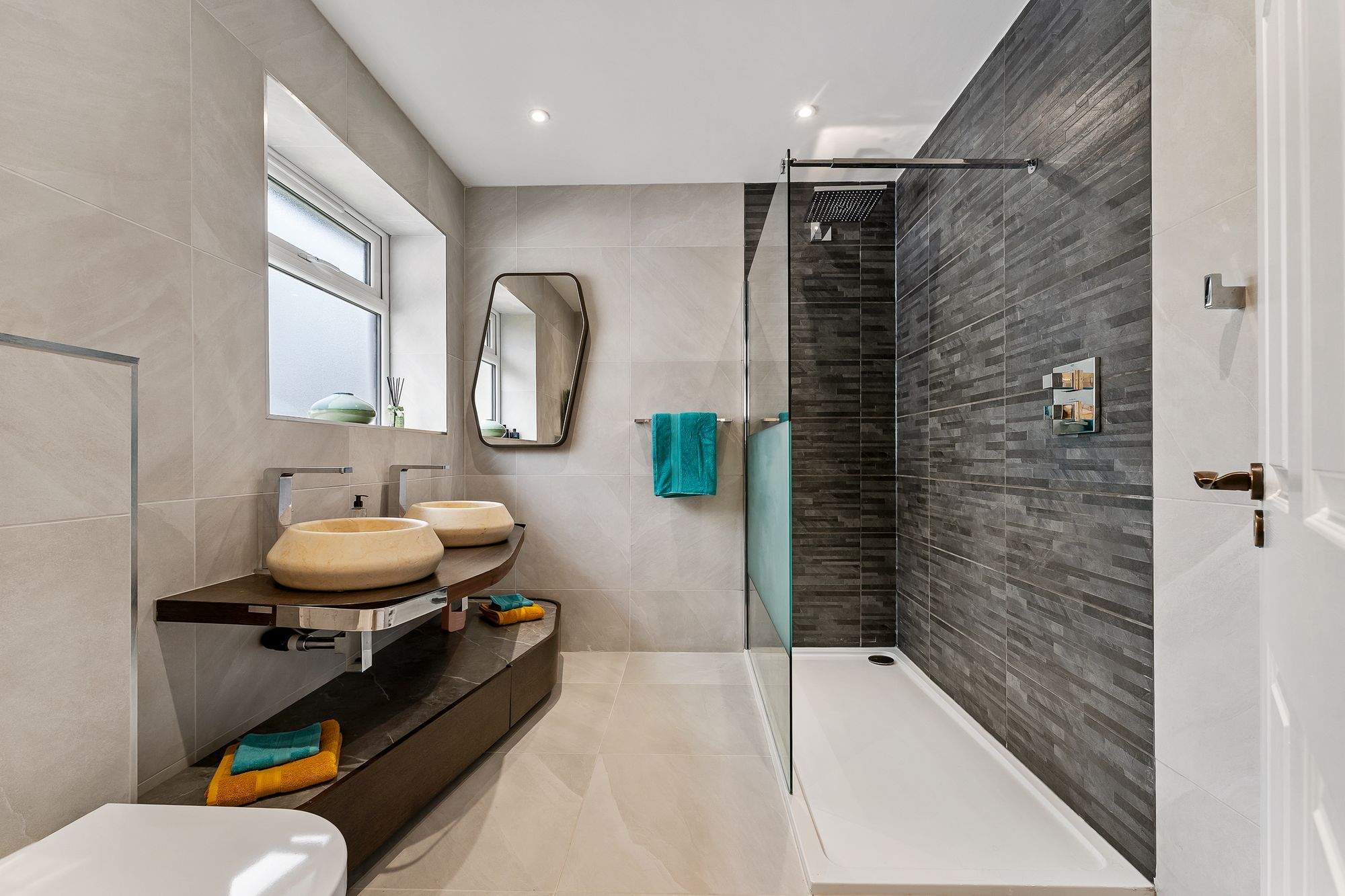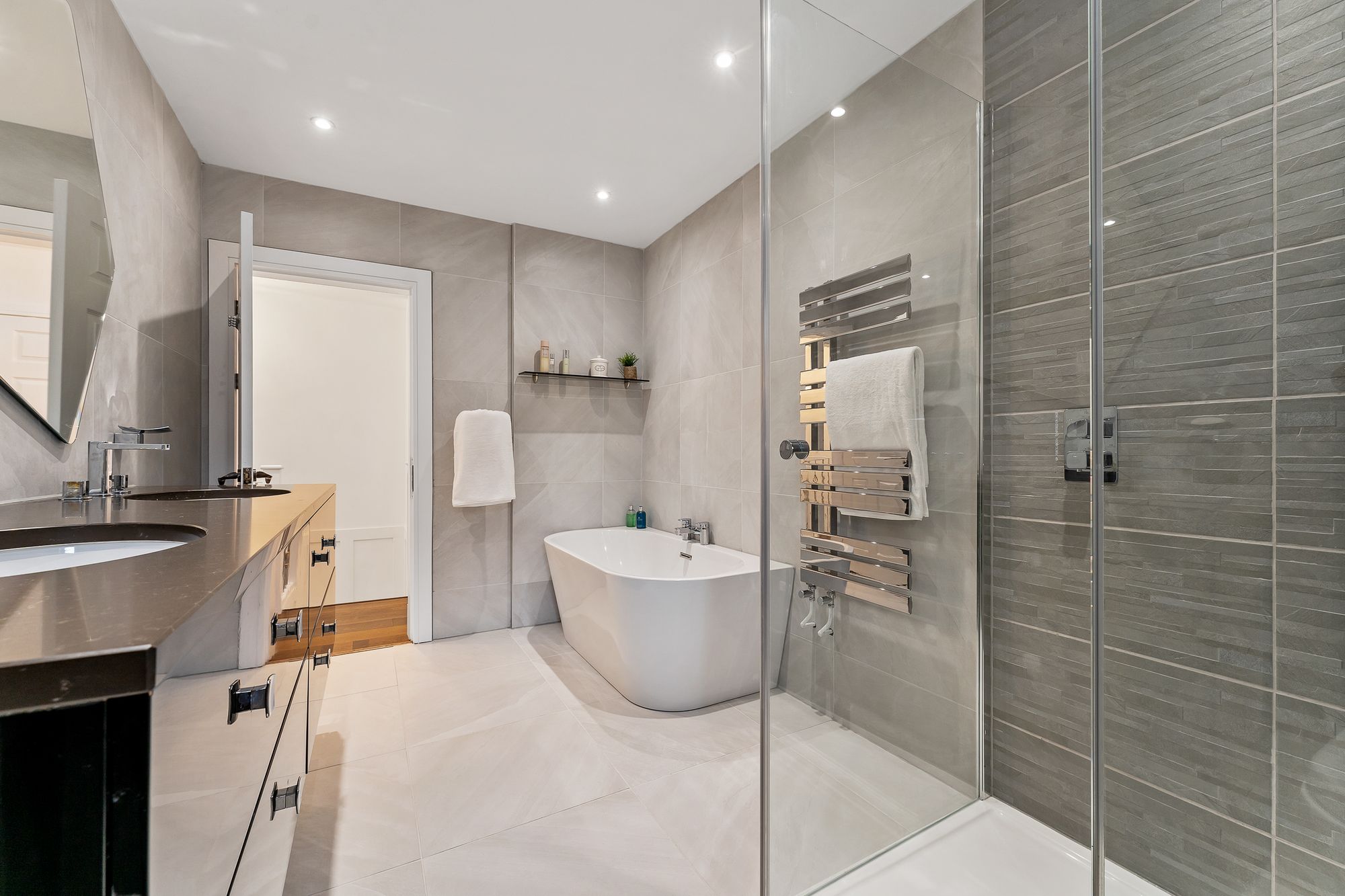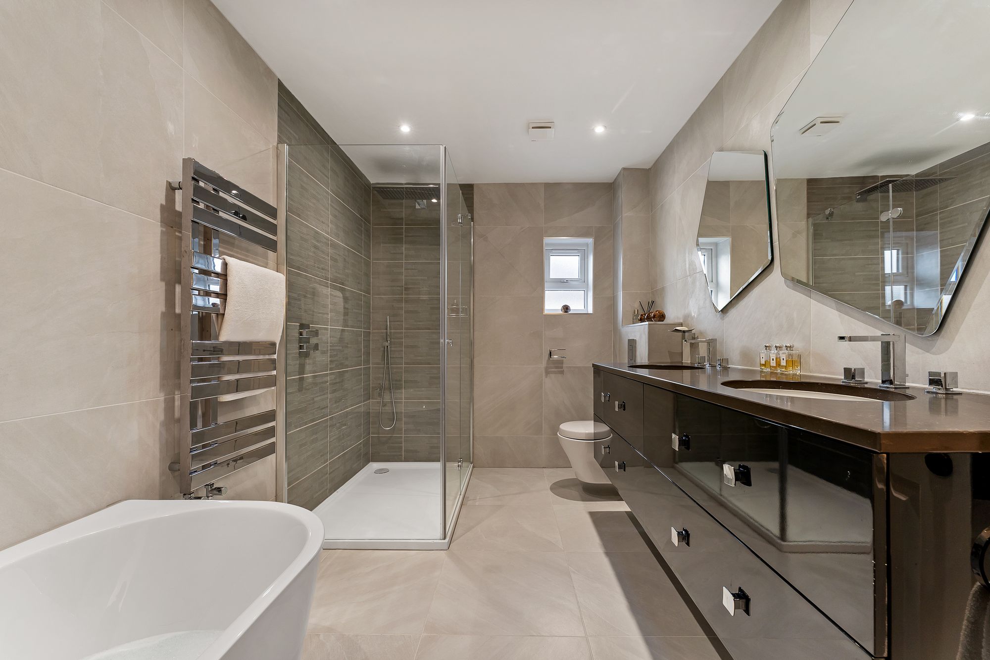 Equally opulent is the main family bathroom across the landing, again furnished with bath, separate shower, chrome heated towel radiator and twin wash basins. Fully tiled in porcelain, the bathrooms at No. 339, London Road exemplify the high-quality finish found throughout the home.