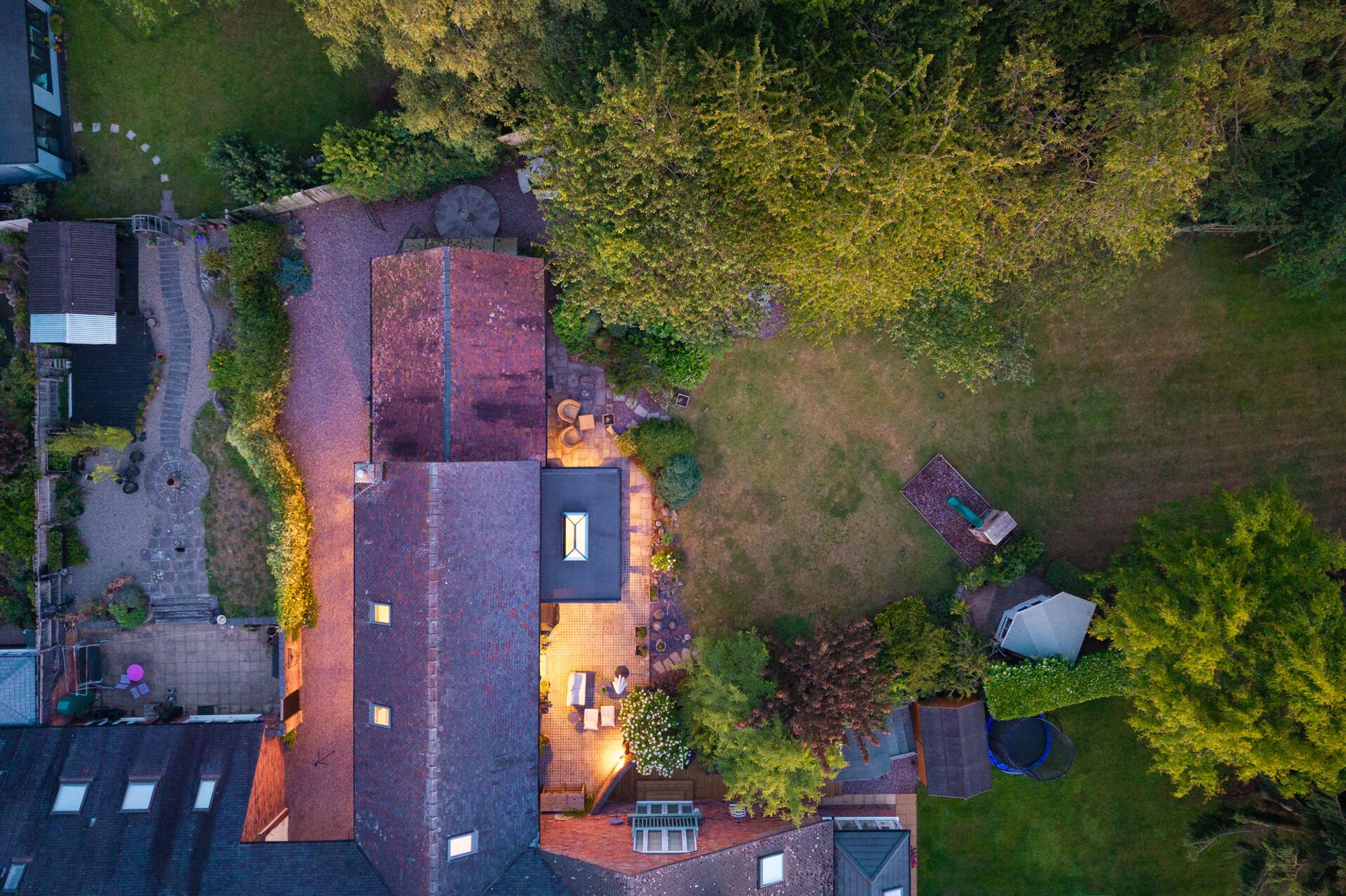 A summerhouse, currently serving as a children’s den, provides yet another place to retreat, while a barked play area highlights the home’s family-friendly essence. With plenty of room for both adventure and relaxation: for games, for reading, for picnic lunches with the childrenbasking in the sights and smells of the spring blossom, this garden is designed for the enjoyment of all.