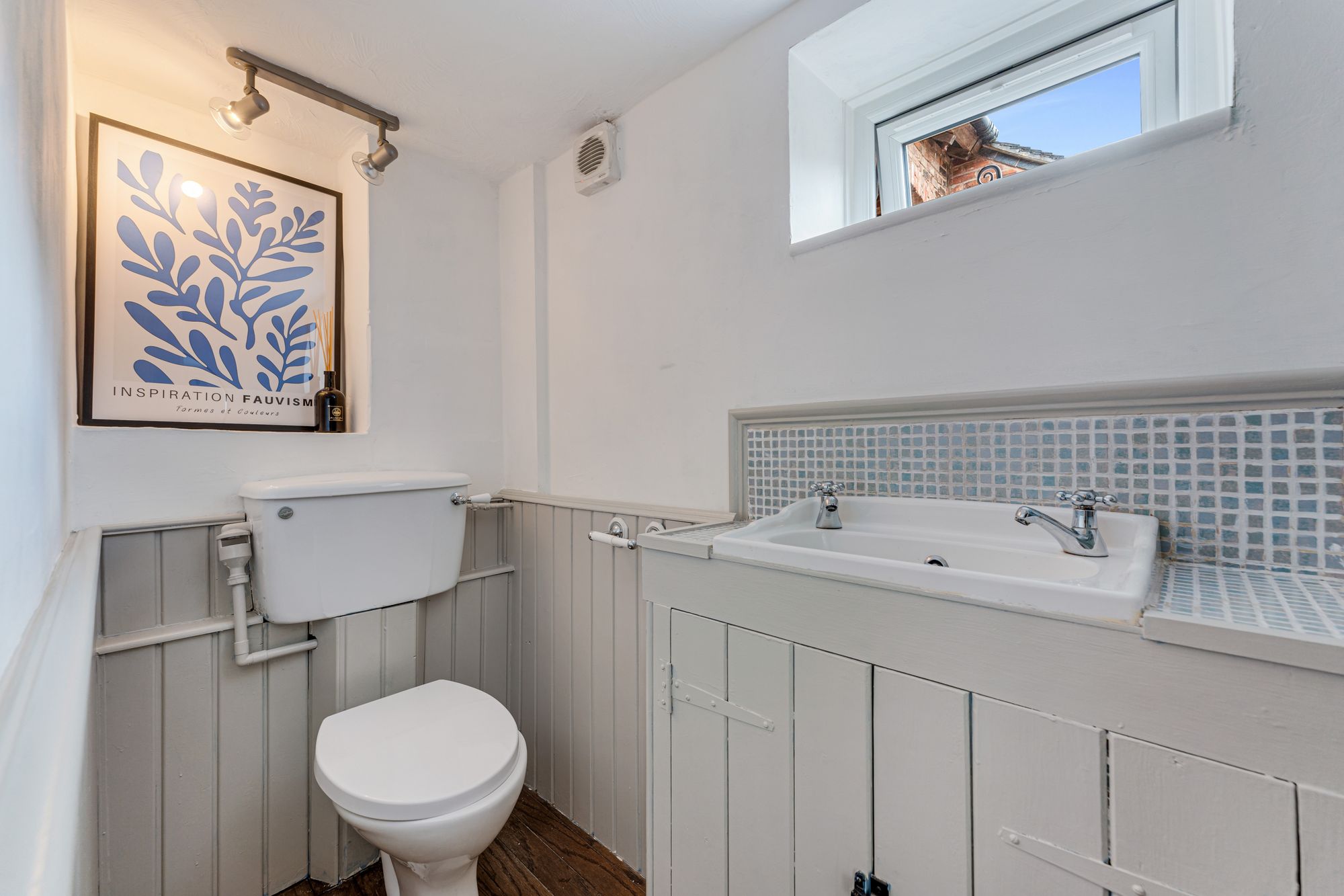 Next door, glass doors retain the light flow through into the versatile family-dining room, which also serves as a playroom and boot room entrance, with access out via a stable door to the garden at the rear. A practical and flexible space, conveniently served by the cloakroom across the entrance hall, where muted green panelling to the lower wall features, alongside a wash basin vanity unit and WC.