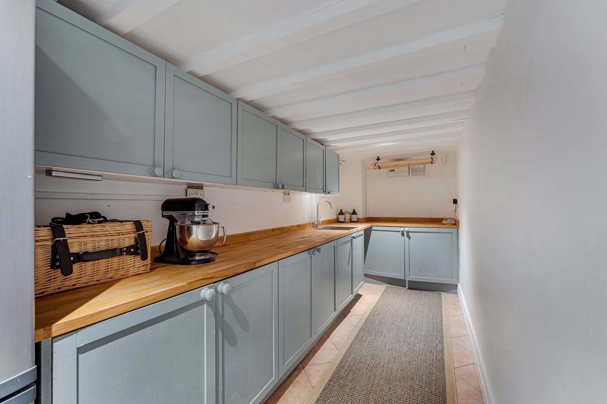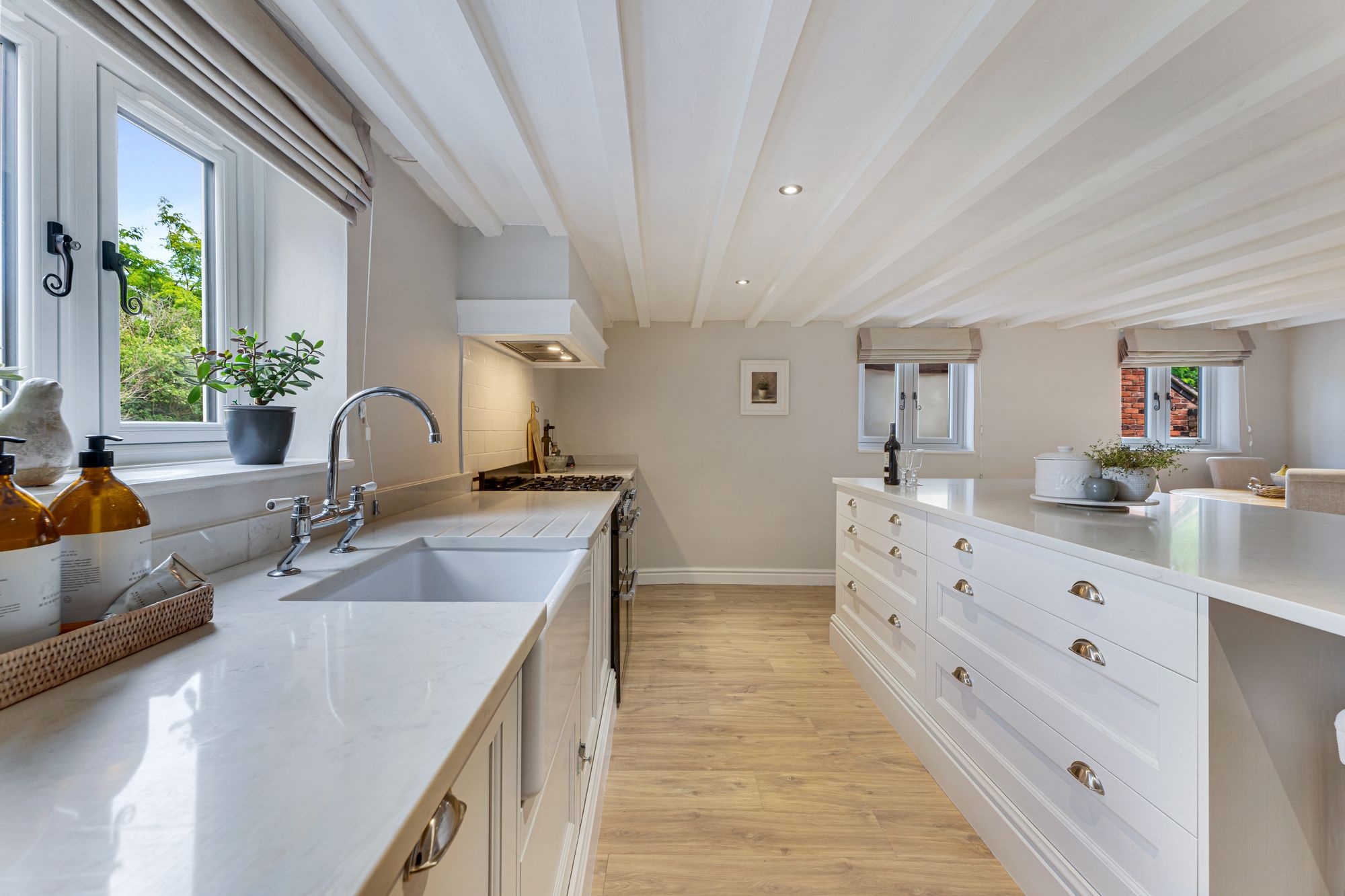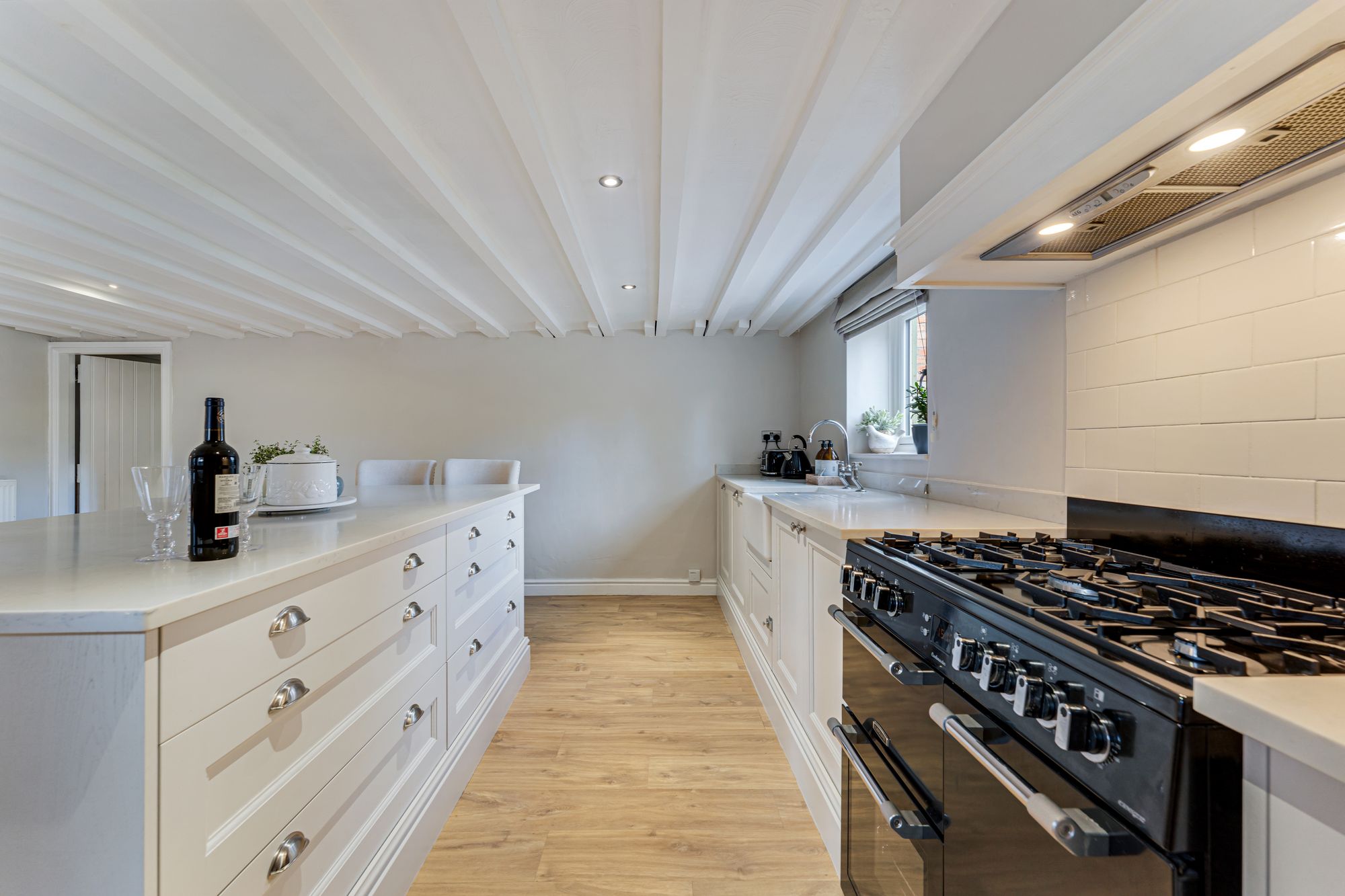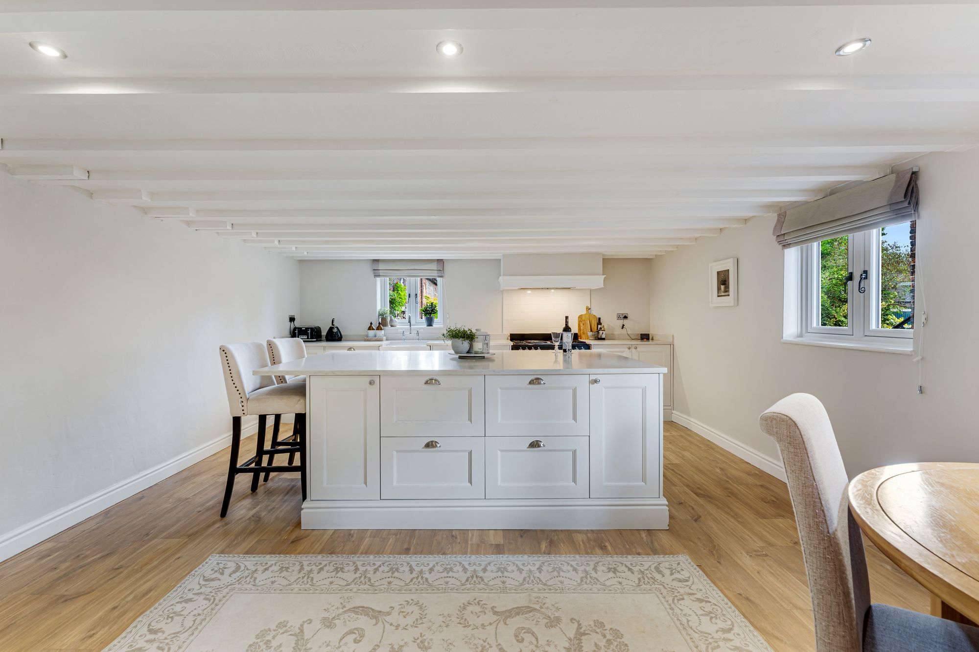 At the end of the hallway, light streams through into the dining kitchen from windows to both the front and side. Crisp grey-white shades are reflected in both the painted beams above, and the classic country cabinetry to the walls and within the quartz-topped central island, where breakfast bar seating offers the ease and convenience of casual dining.