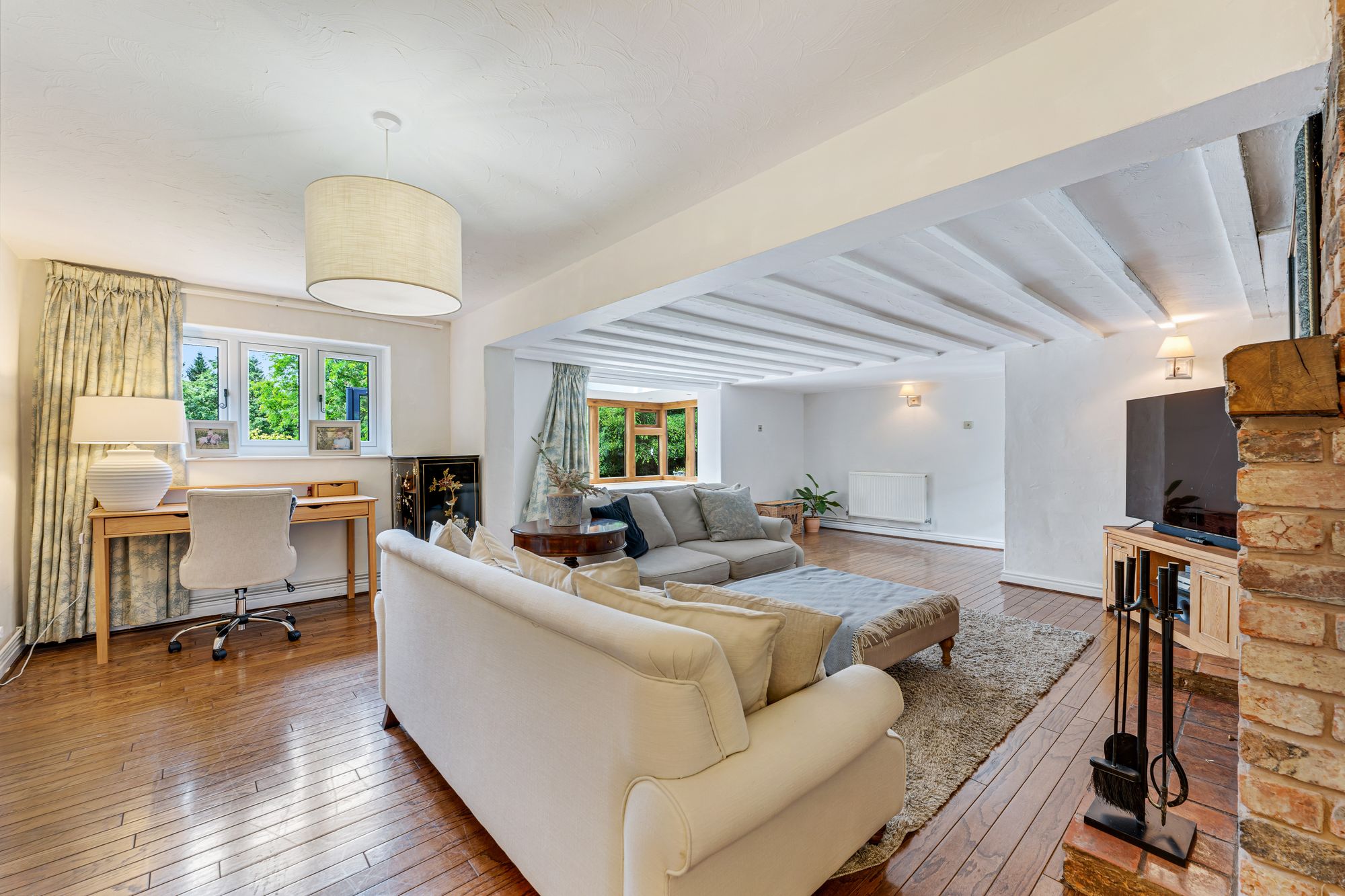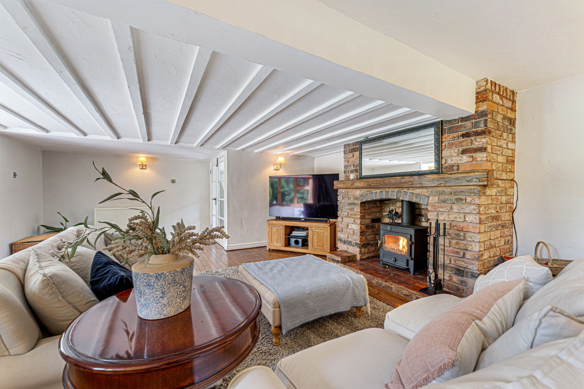 Step inside and feel the calm settle. Natural materials and soft heritage tones run throughout: hardwood floors, exposed beams, warm oak. In the entrance hall whitewashed beams keep a light, fresh feel overhead, whilst ahead, glazed double doors offer green glimpses through to the garden from the lounge beyond.