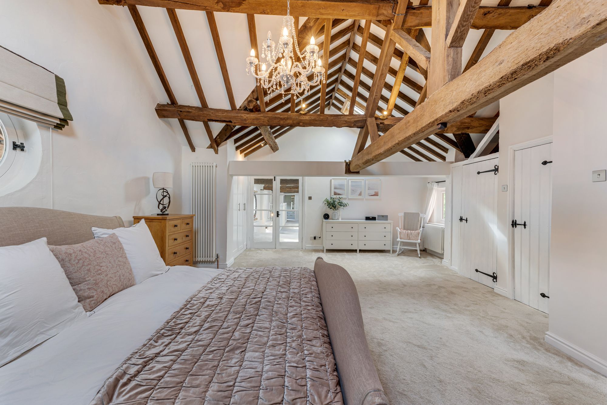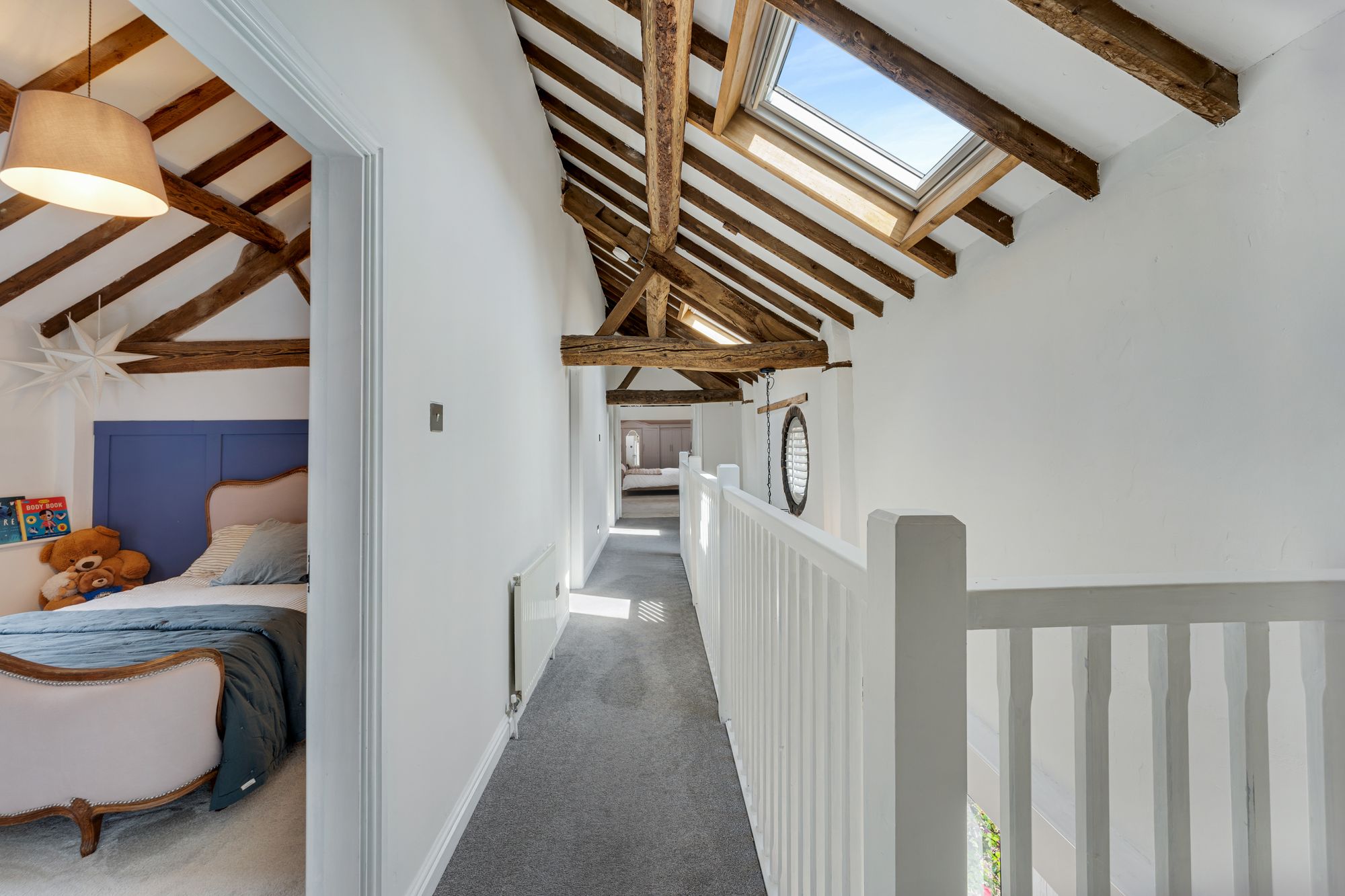 Back along the entrance hall, take the stairs up to the landing, where beams trace the lofty ridgelines of the ceiling above and where light streams in through a shuttered porthole window to the front.
