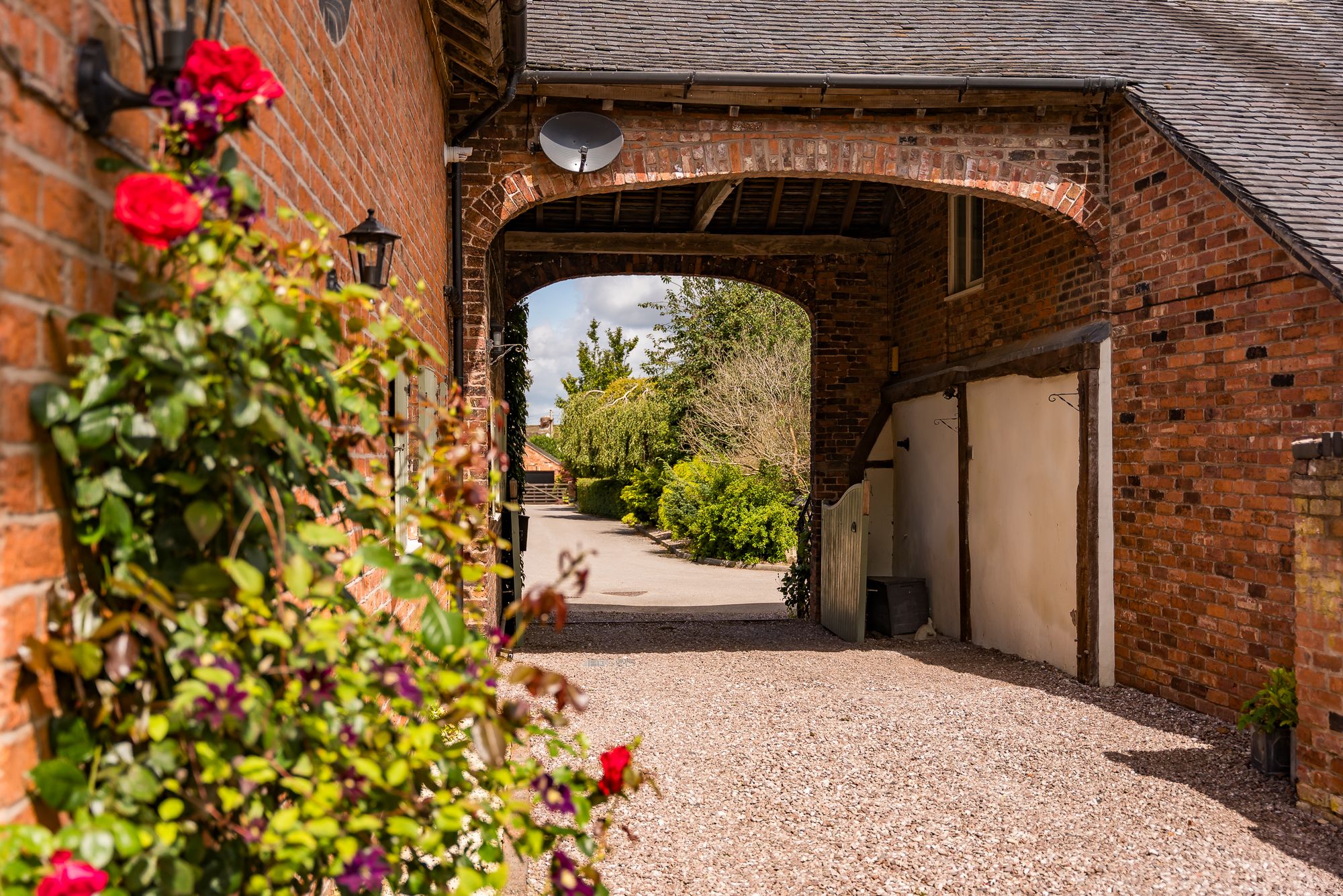 From the quiet country lane, pull through the sage-green gates, beneath a brick archway and onto the grey gravelled driveway where ample parking for six or seven cars can be foundalongside a double garage.