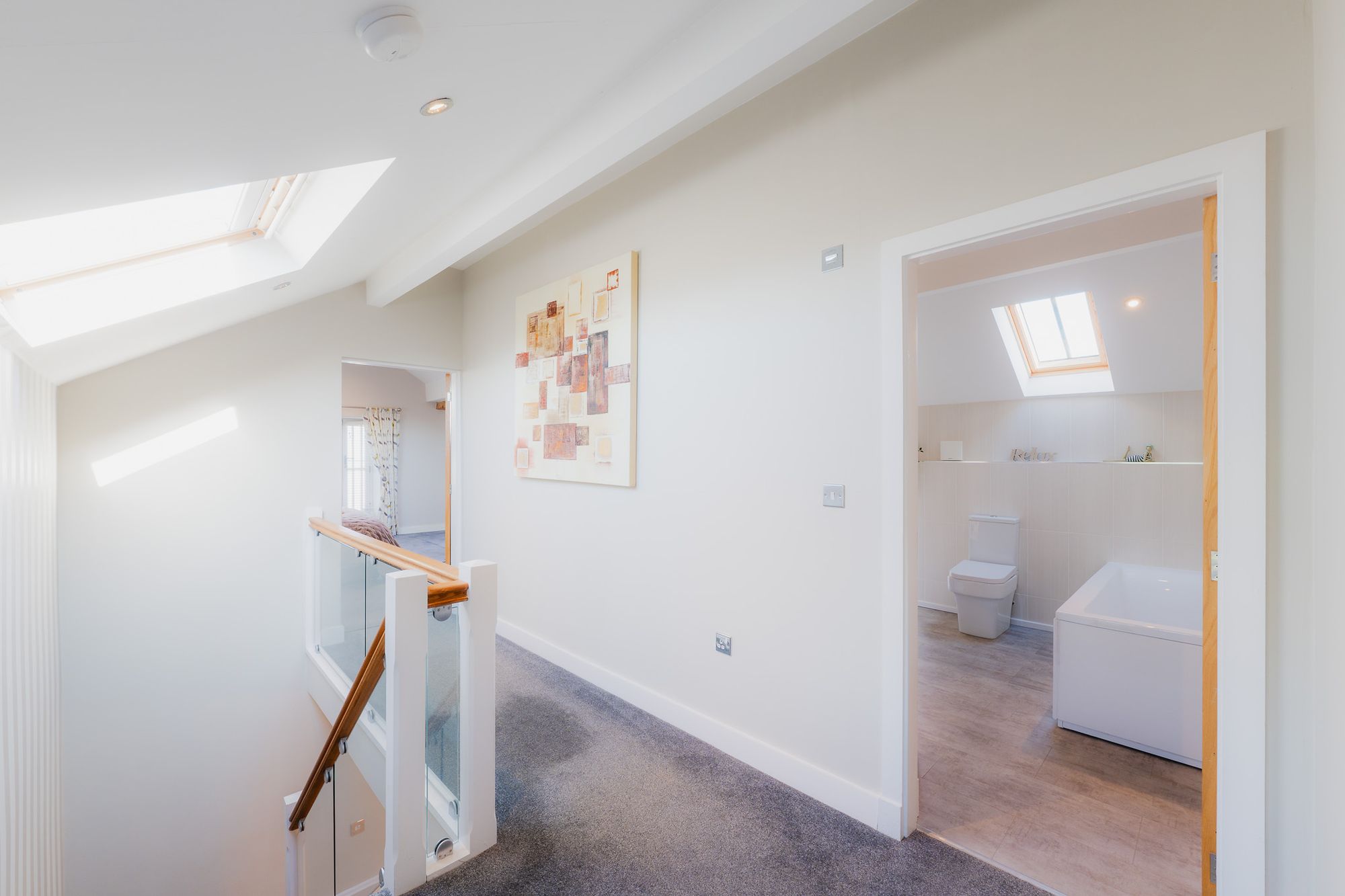 Returning along the landing, the family bathroom on the left, complete with a separate shower and bath, is perfectly positioned to serve the two guest bedrooms further along. The thoughtful layout of the bedrooms- spaced well apart - offers enhanced privacy for guests and is ideal for older children seeking independence.