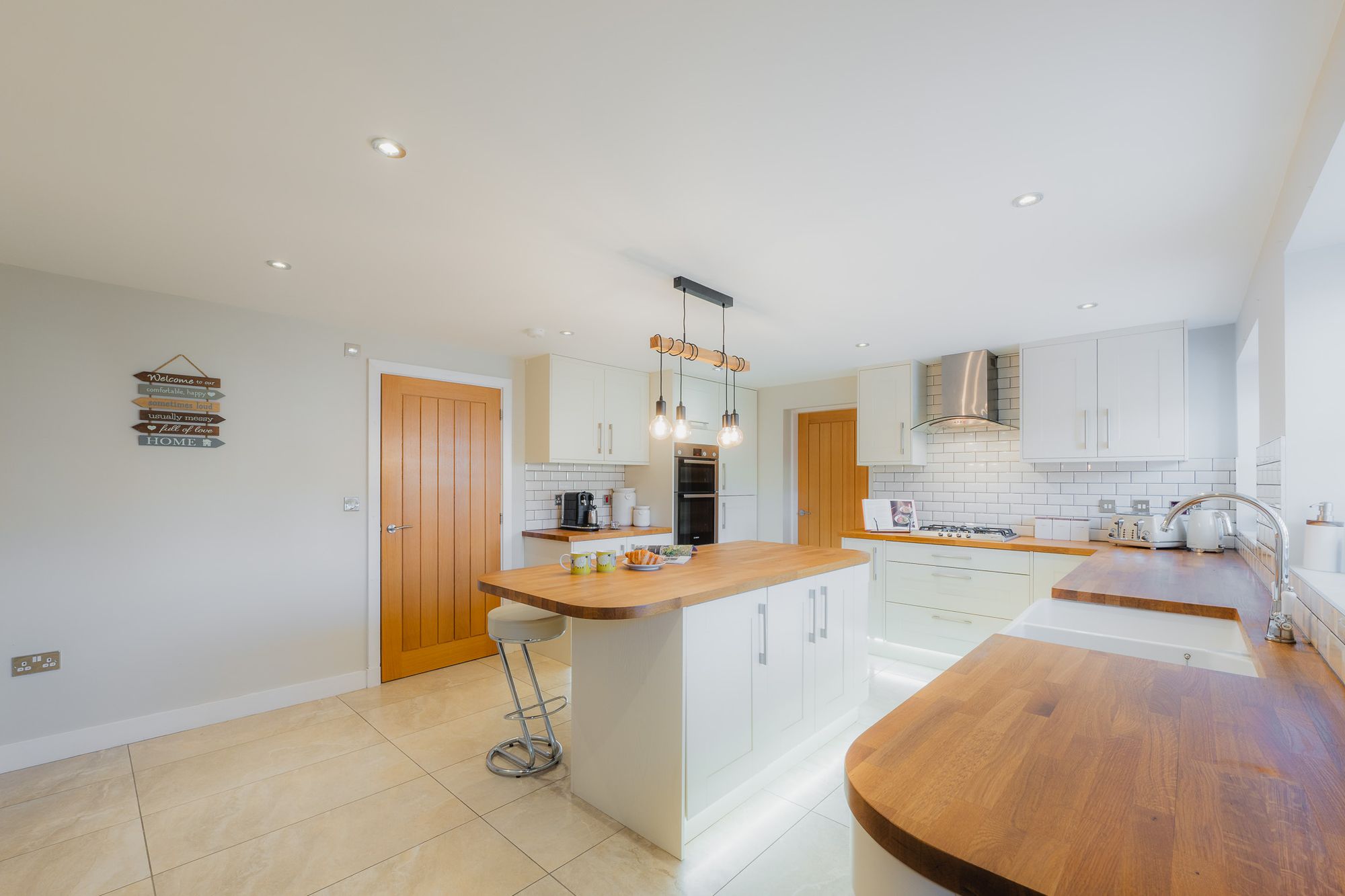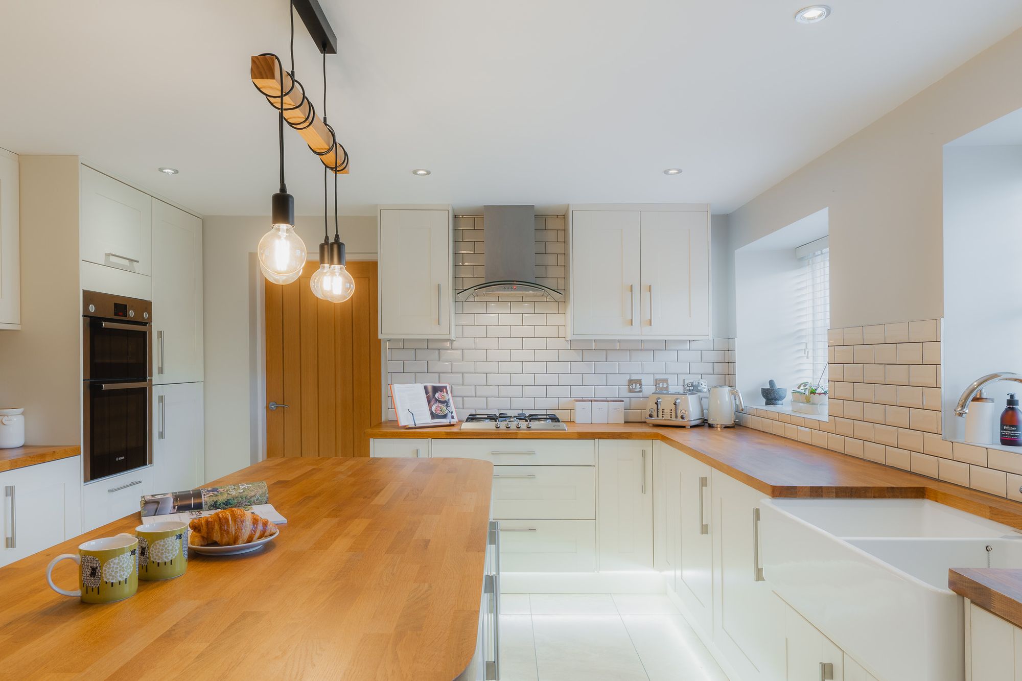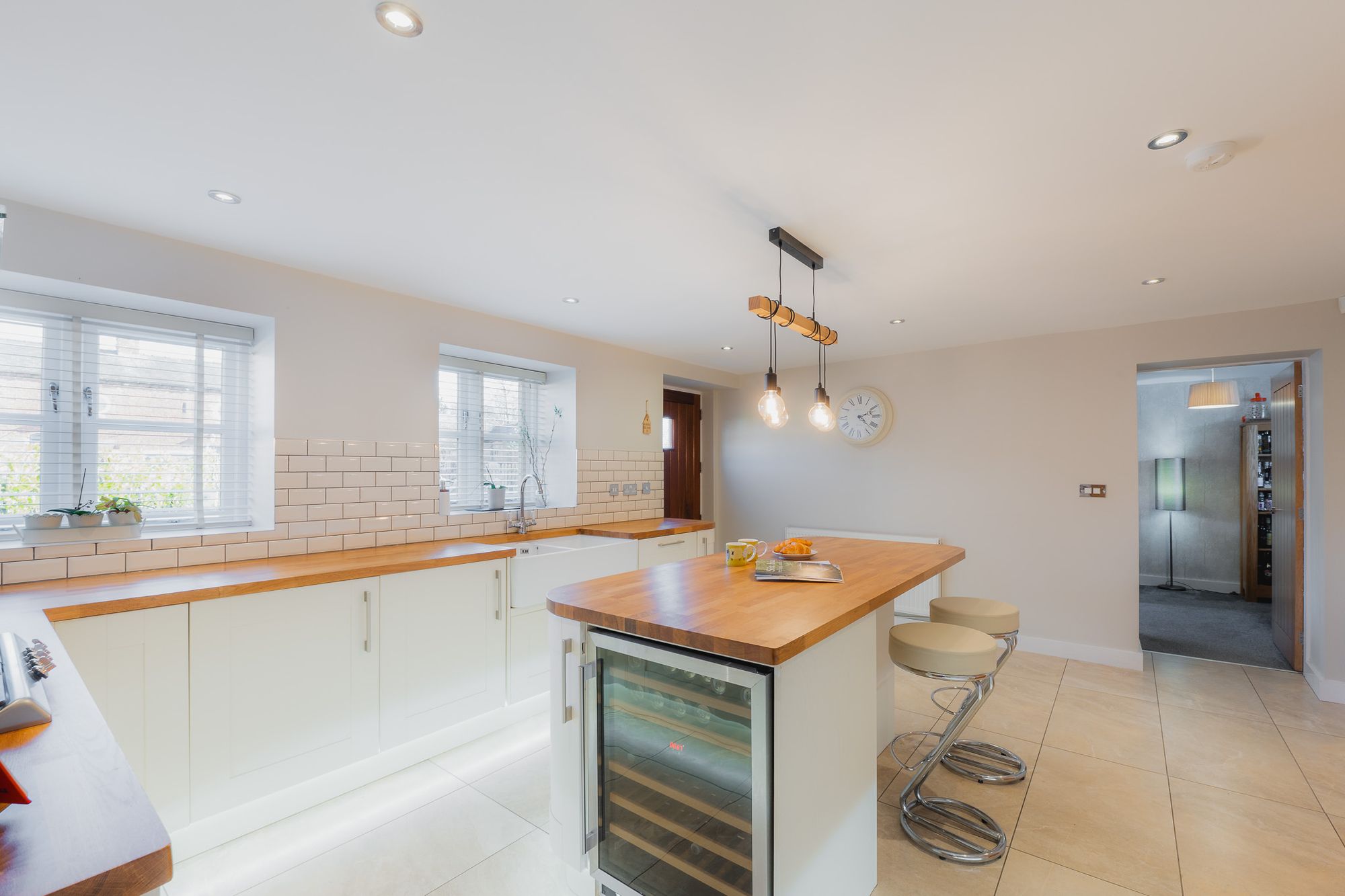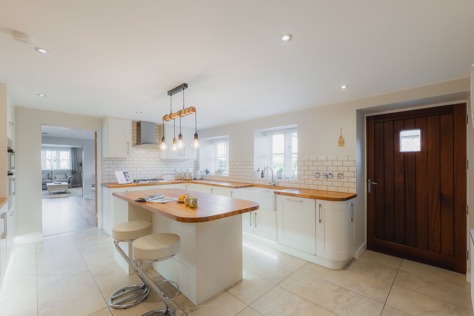 Stepping indoors, savour the spaciousness of the family kitchen, lined in large cream tiles and furnished in a contemporary farmhouse style, with plinth-lit cream cabinetry and drawers and an oak-topped central island breakfast bar set beneath a stylish suspended stripped bulb lighting feature.