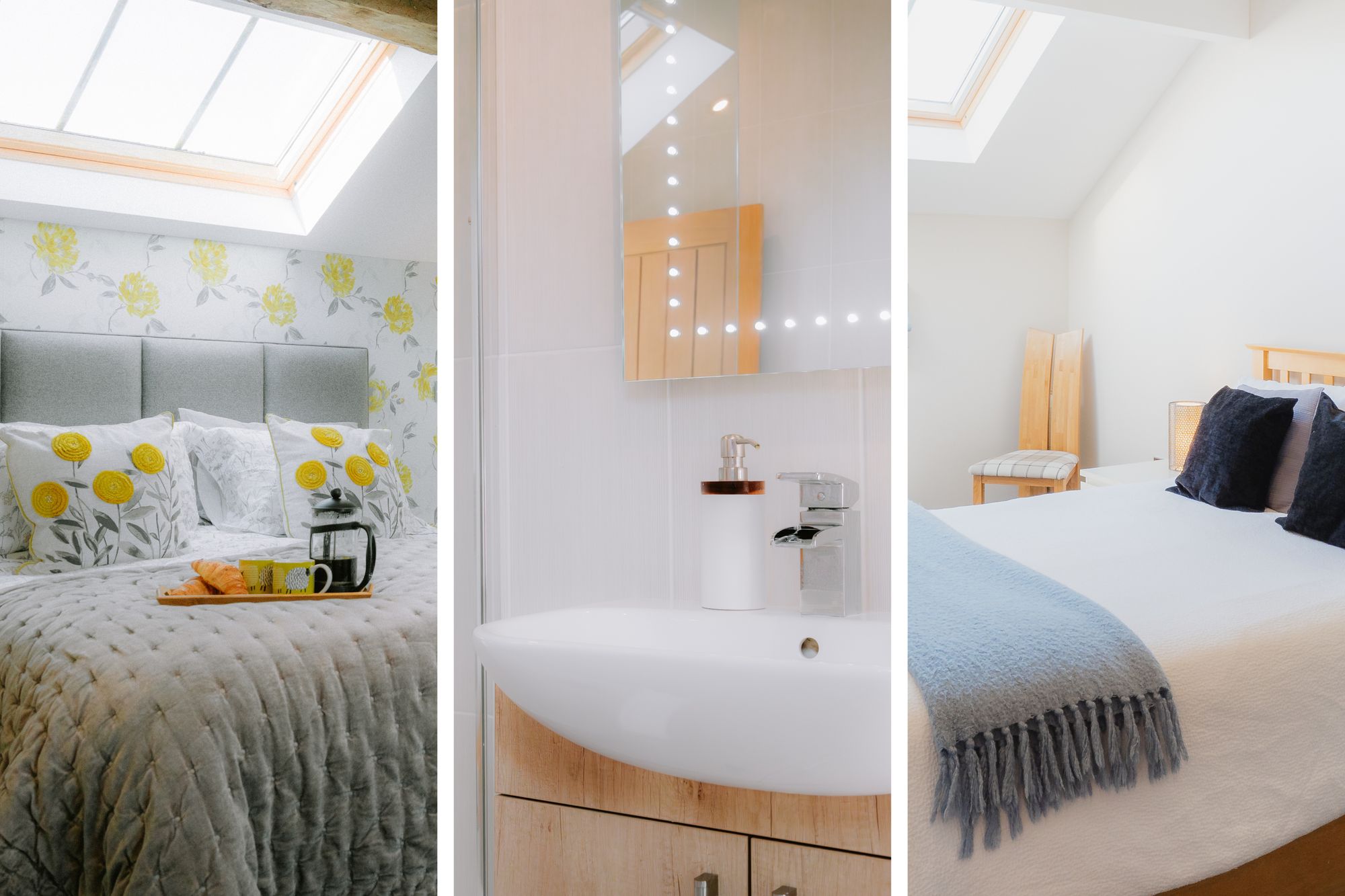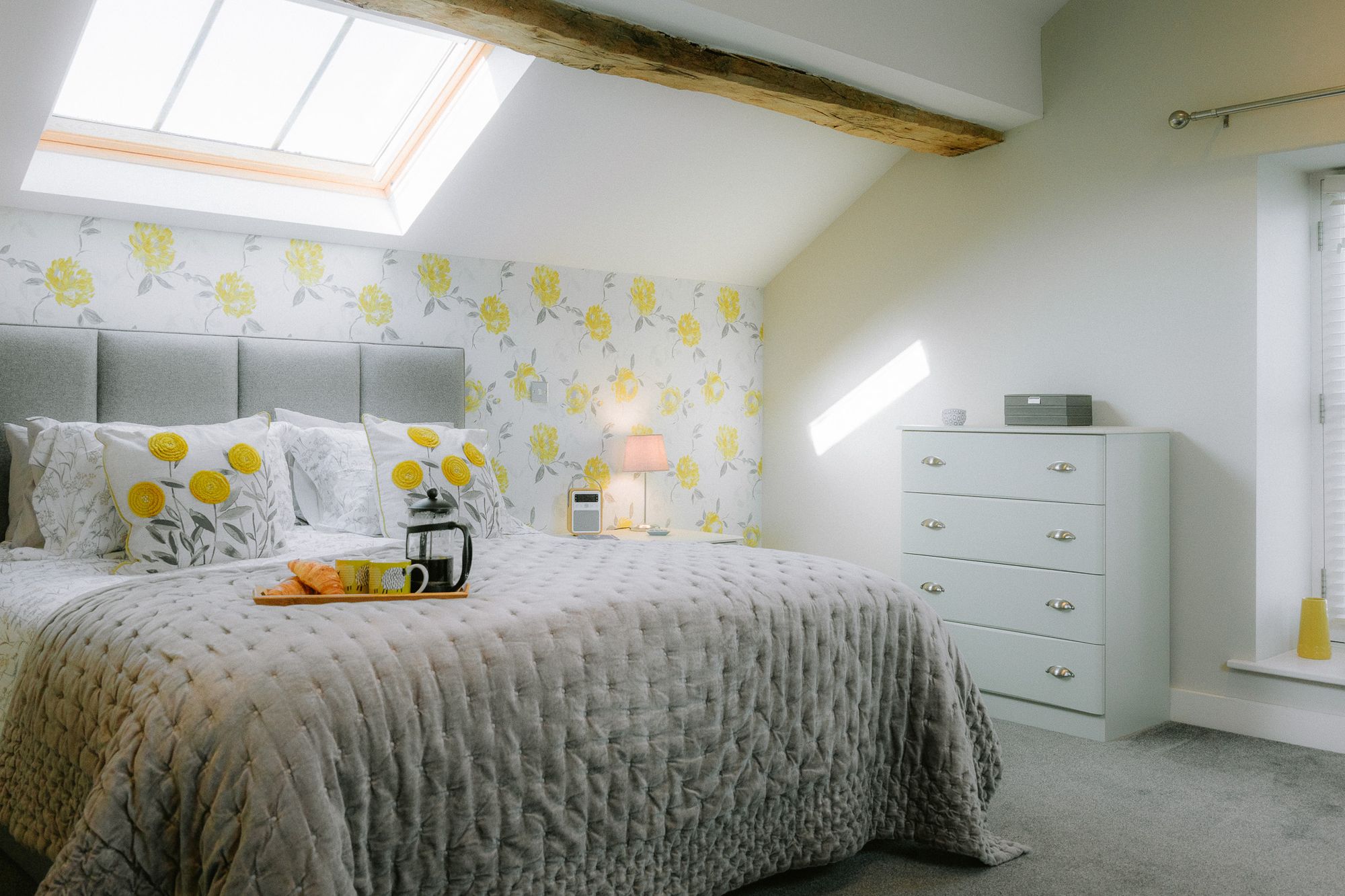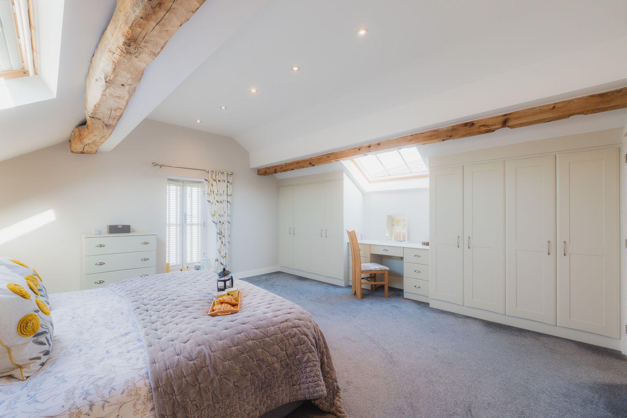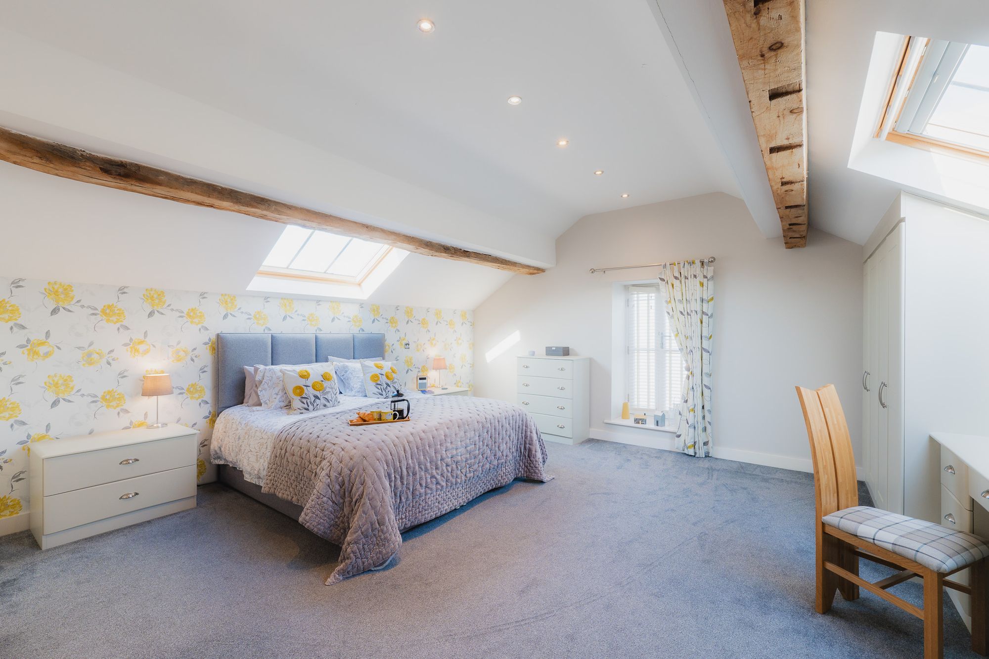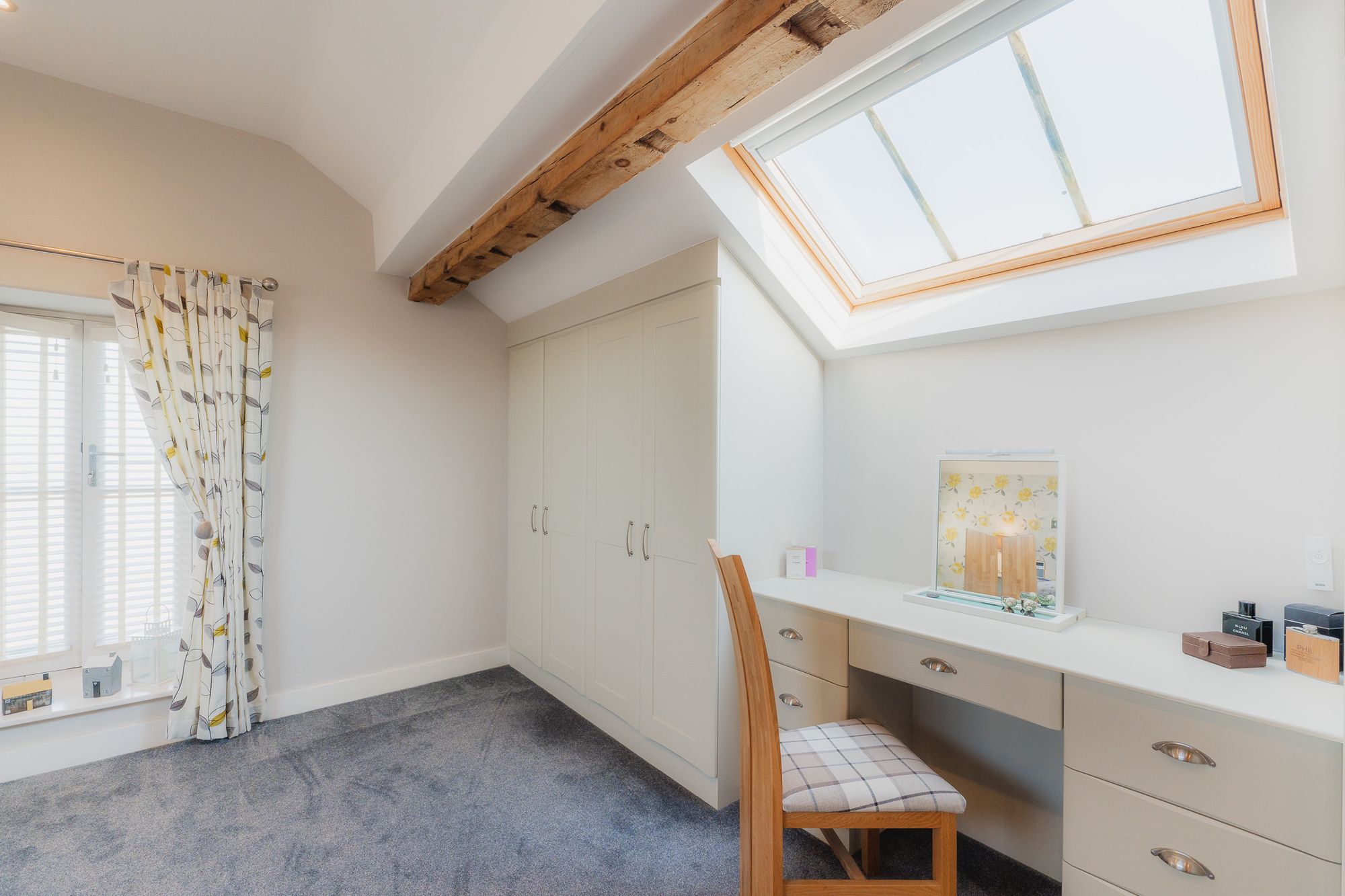 To the left, tucked privately away, the master bedroom serves as a sanctuary for sweet dreams, suffused with light and a cheerful floral feature wall. Rustic beams retain the heritage of the home’s farming origins, balanced by the modern built-in storage, and dressing table thoughtfully situated beneath the large Velux window.