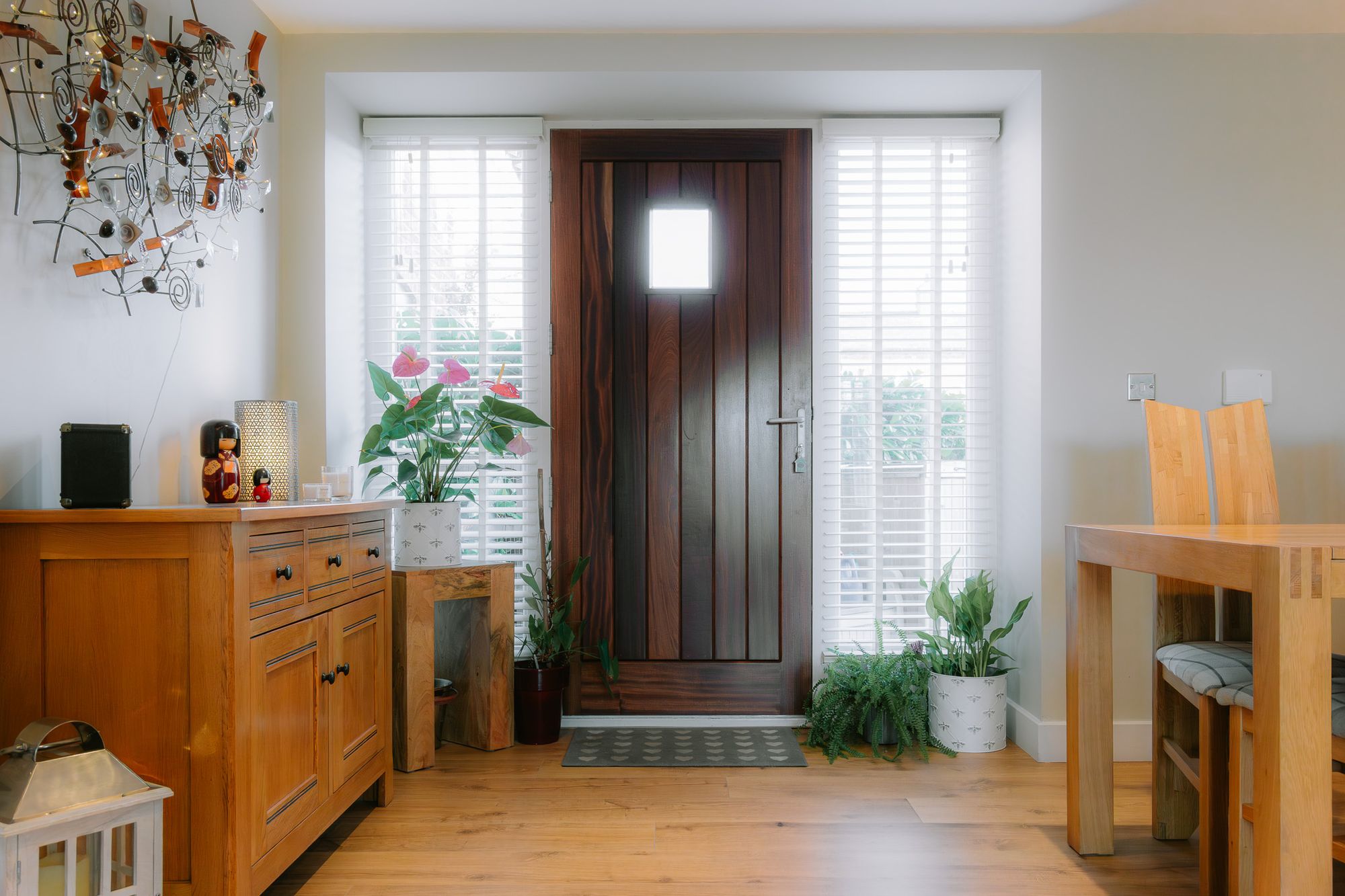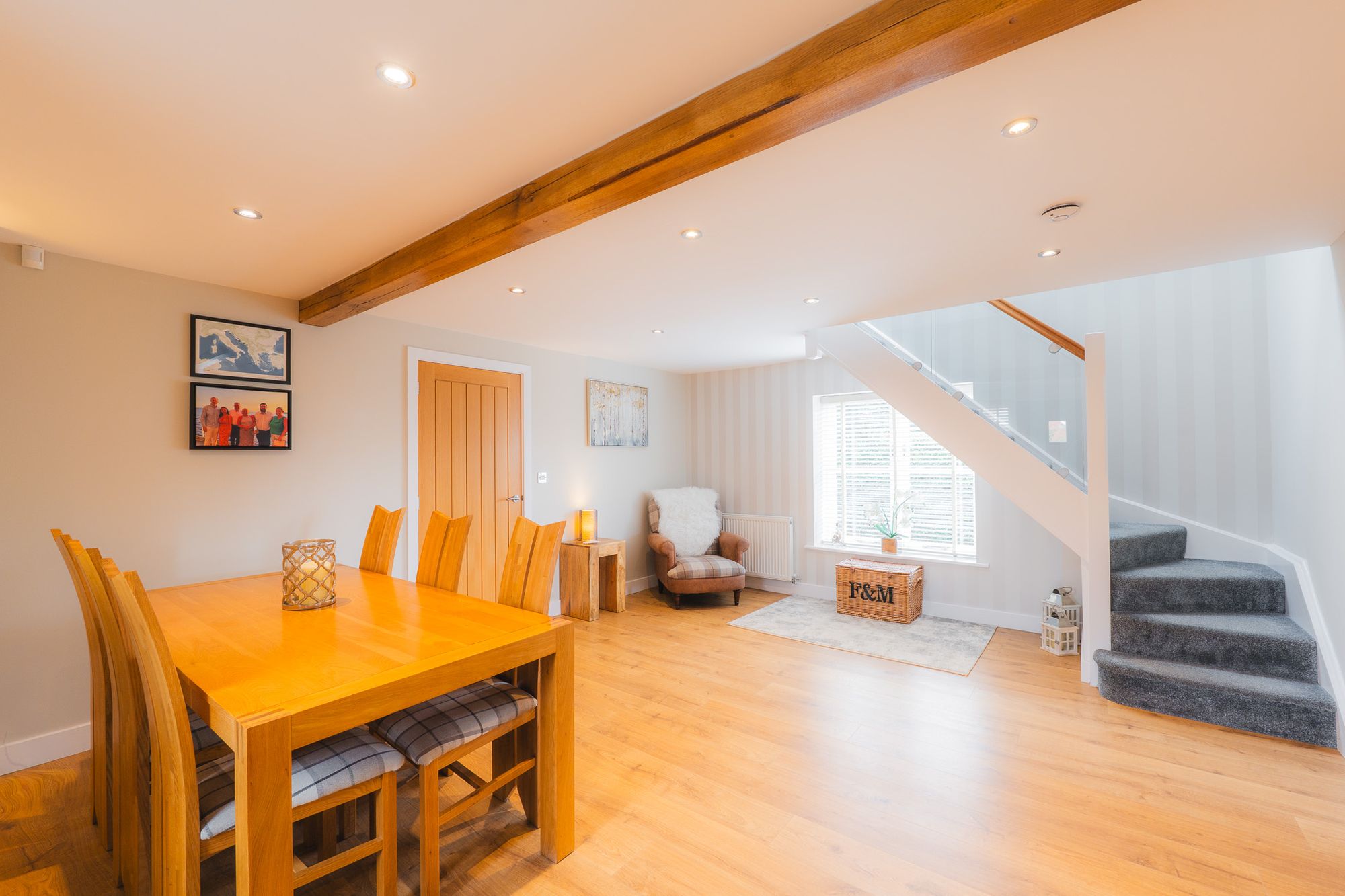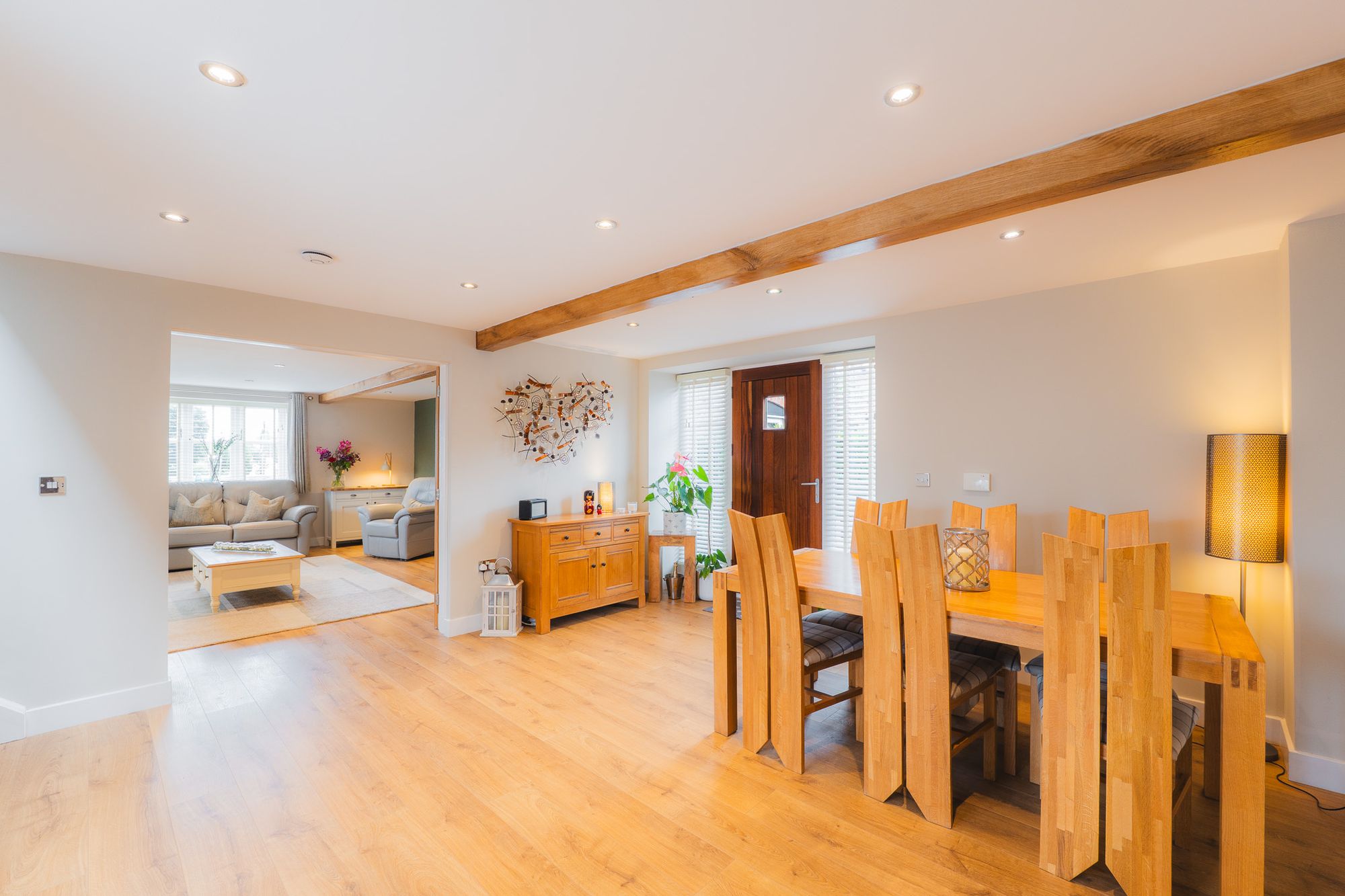 Entertain family and friends in the dining hall opening up to the right of the kitchen, a distinct space yet easily accessible when hosting. Light and bright, with blind-fitted windows to the front and rear, this room can be directly accessed from the garden, making it ideal for summer dining out in the garden.
