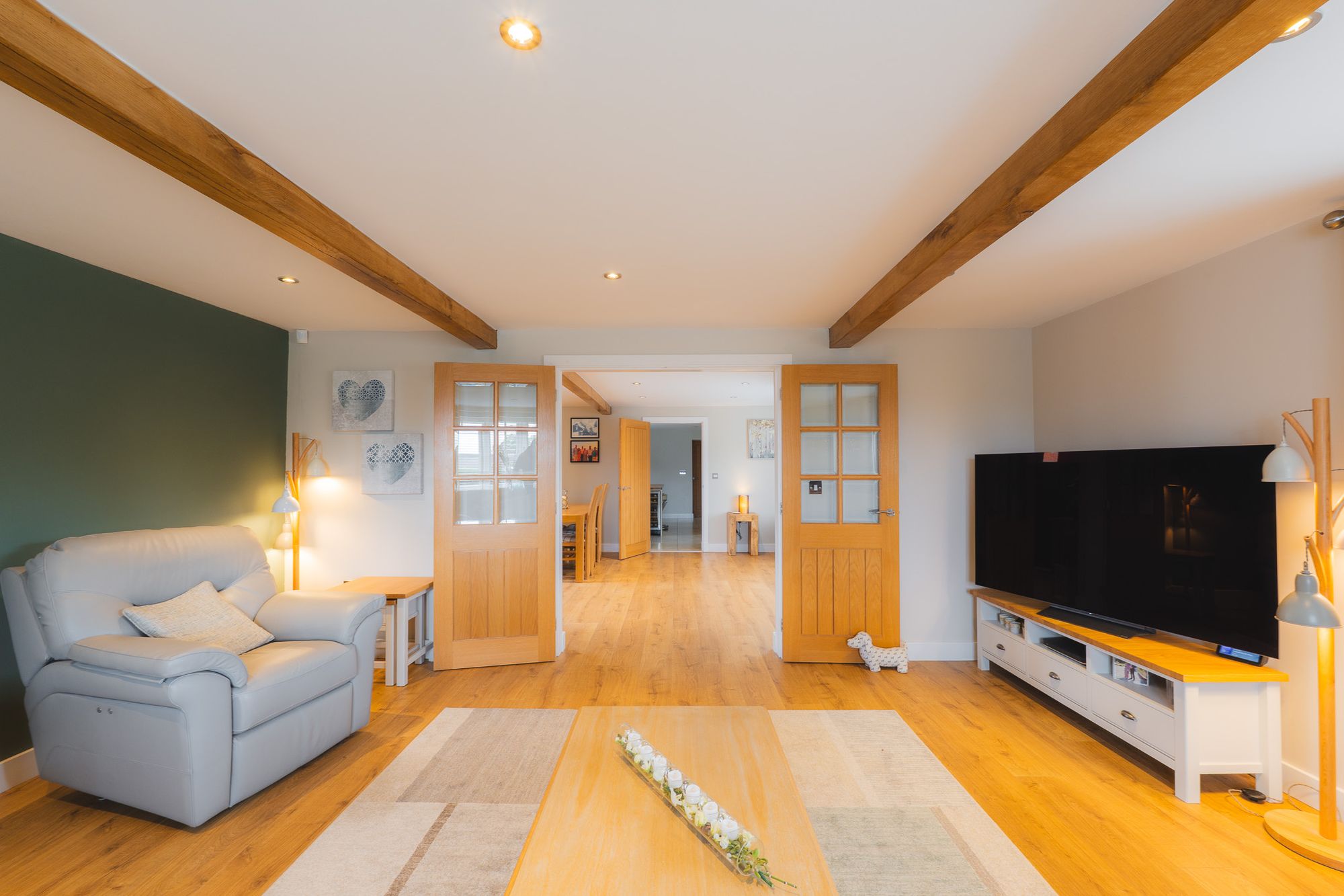 Double doors connect through into the main living room, a light and bright haven, with plenty of space for sofas and guests. Toasty warmth fills the room from the gas log burner, whilst windows provide views out over the fields and lane.
