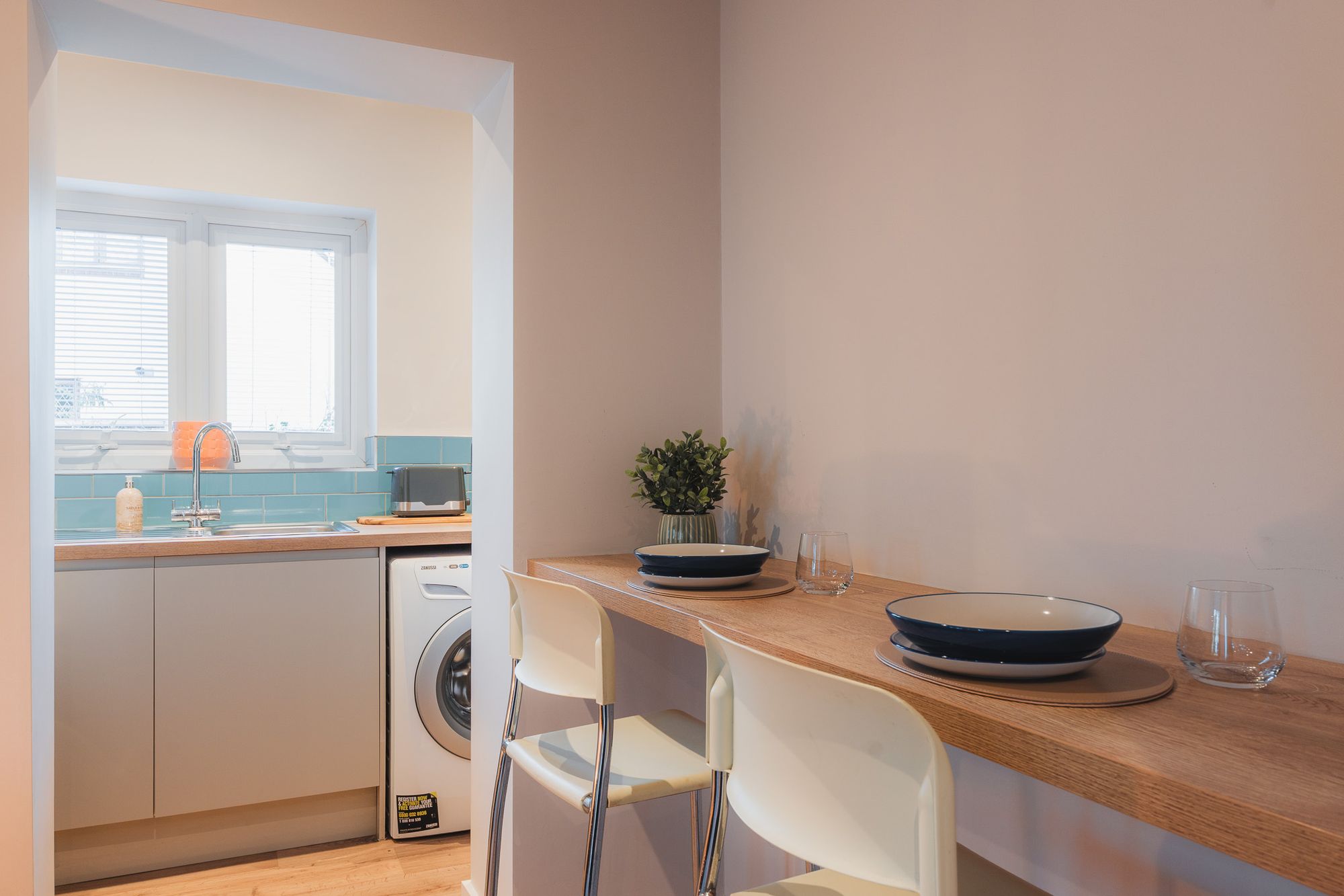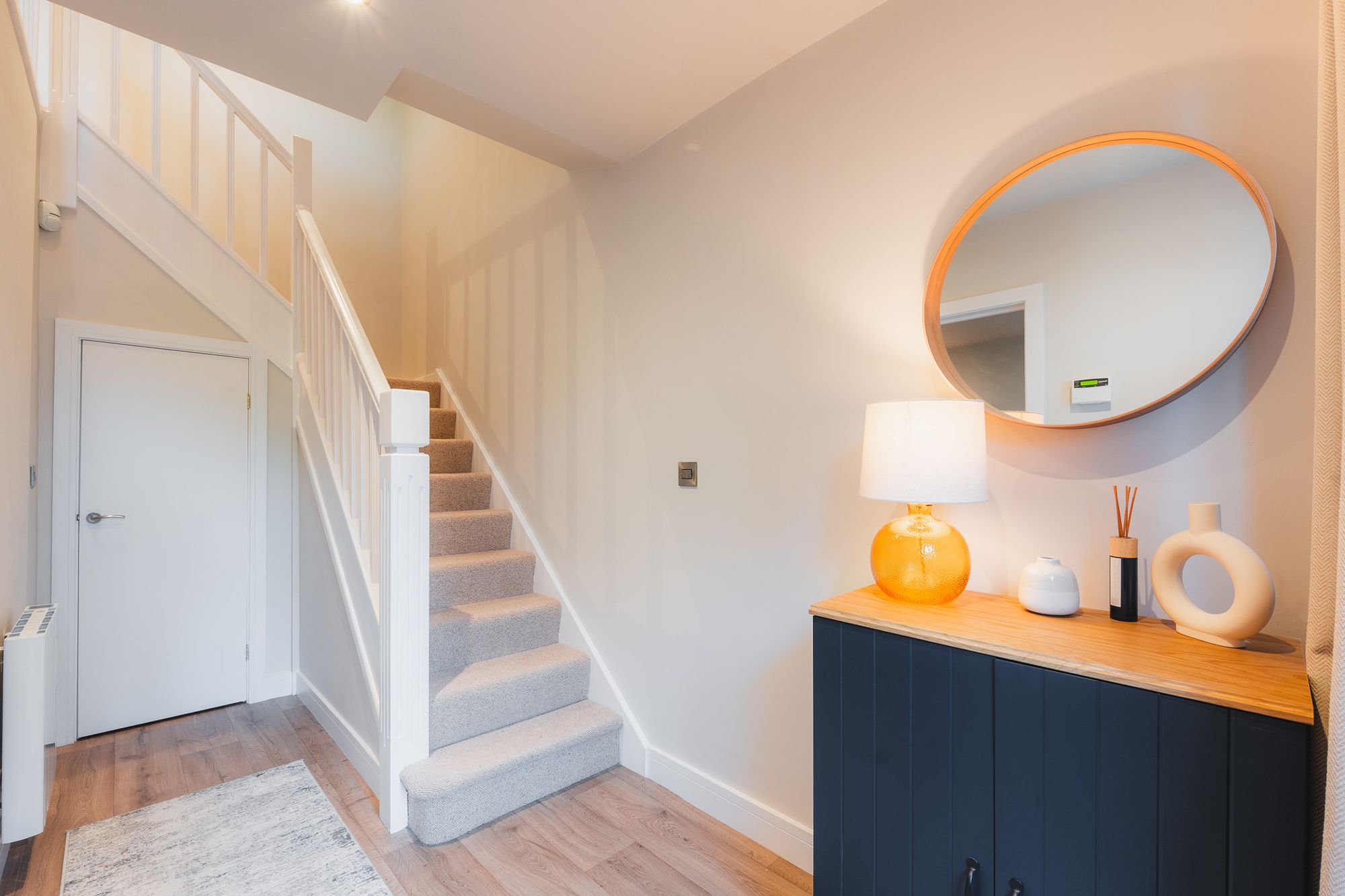 With its own landscaped frontage of leafy planting, gravel and a welcoming front path, the annexe stands as a spacious two-bedroom, two-storey home in its own right. Step inside to an airy entrance hallway dressed in muted tones (the annexe was fully refurbished just 18 months ago), with handy understairs storage ahead.