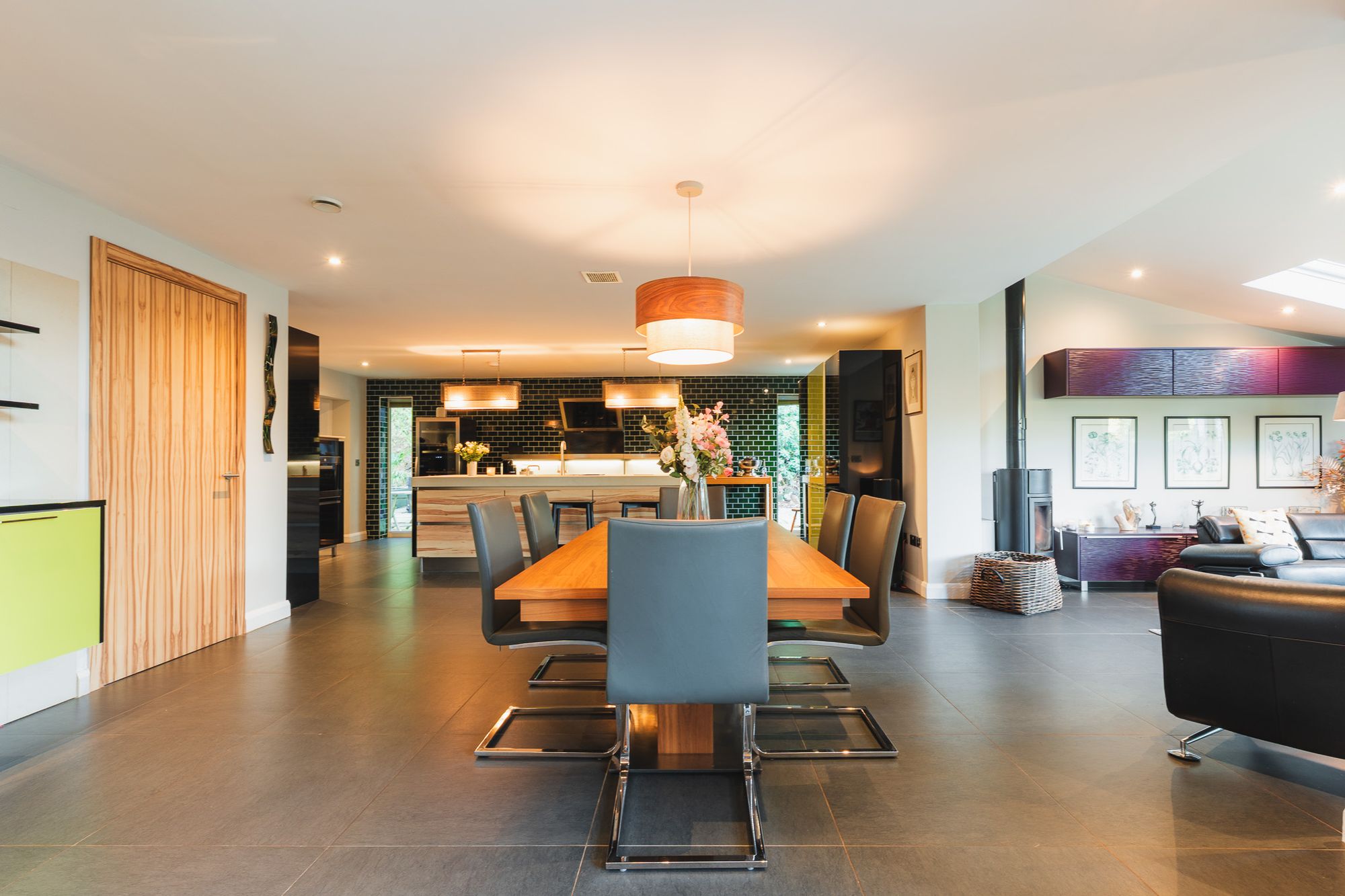 A log-burning stove infuses warmth on December days, while roof lanterns and bifolding doors draw in light, opening the room out to the garden in warmer months. A true party-friendly heart to the home, this entire flowing space was designed as a place for family visits, sociable catch ups with friends and festive celebrations.