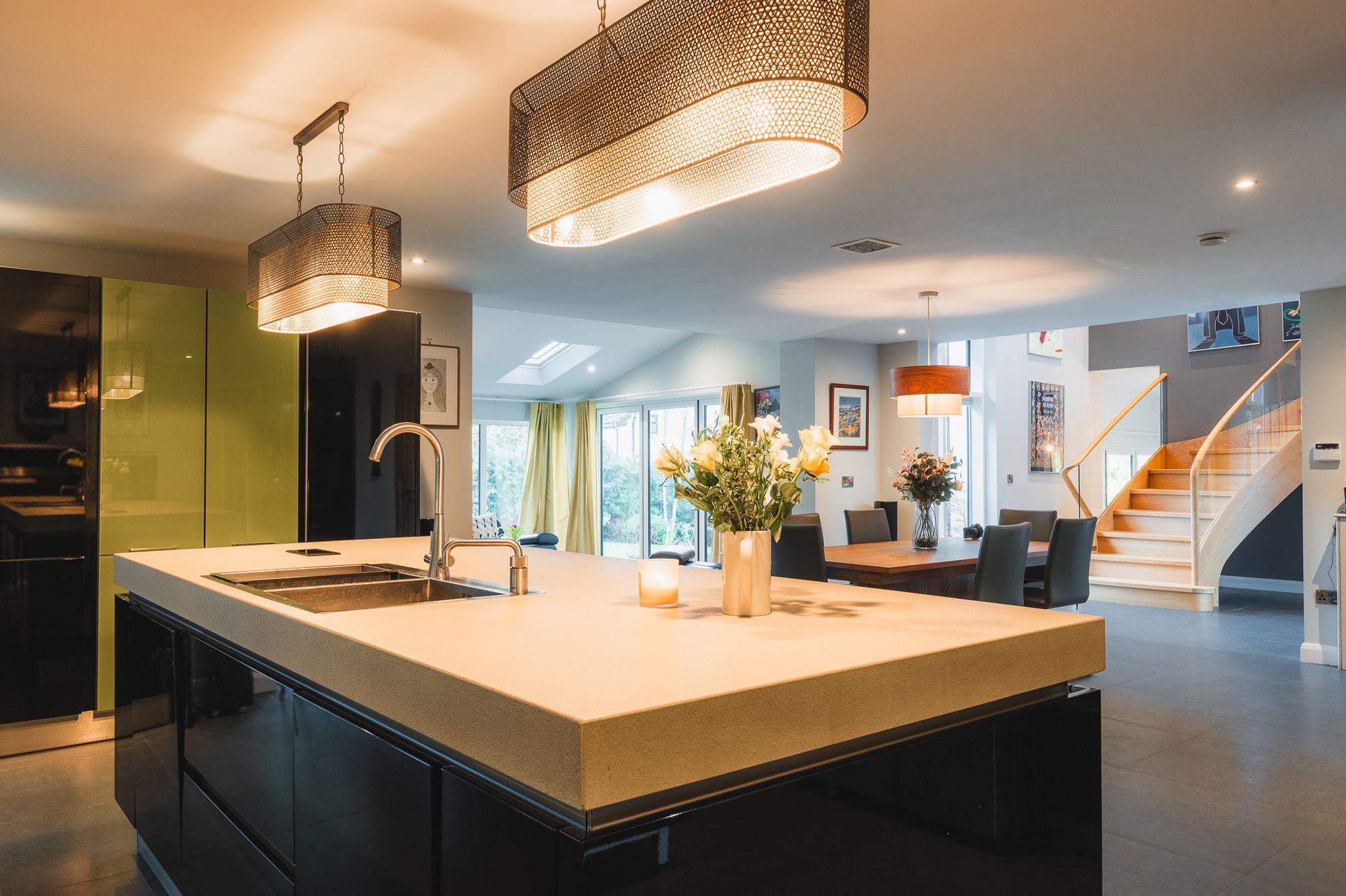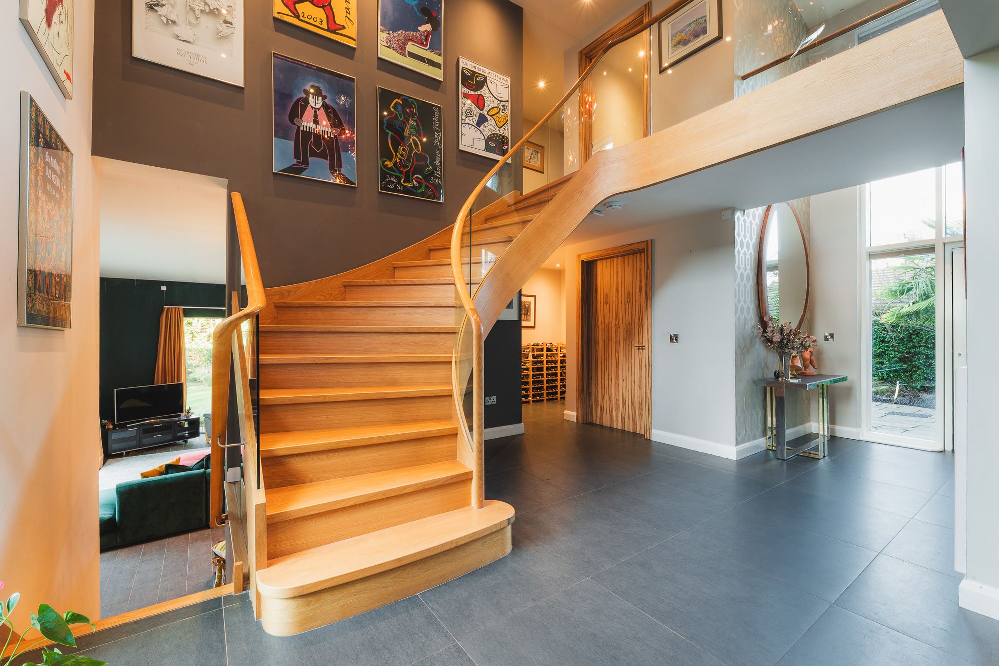 From the entrance hall, the artisan crafted, curving oak stairs sweep up to the first floor, where double height windows offer views to both the front and rear from the gallery landing. Overhead, a striking Tom Dixon feature light adds sculptural flair, while a discreet recessed area at the top of the stairs provides the perfect spot should a lift ever be desired in future.