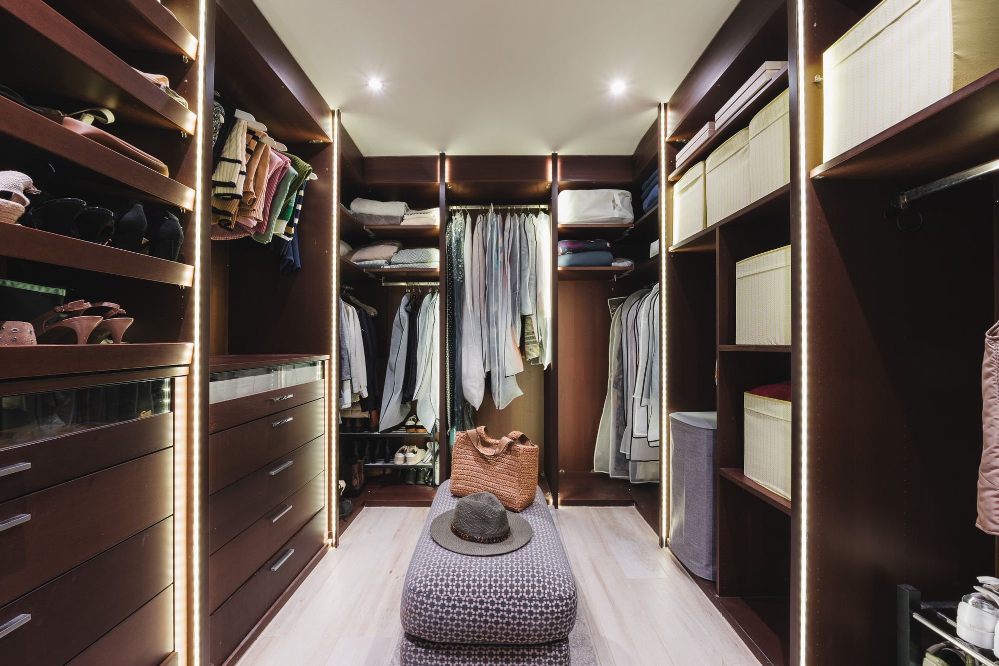 Across, the walk-in wardrobe delivers boutique-style organisation, with open shelves for hats and accessories, woven baskets, hanging rails and a bank of soft-close drawers for elegantly ordered storage.