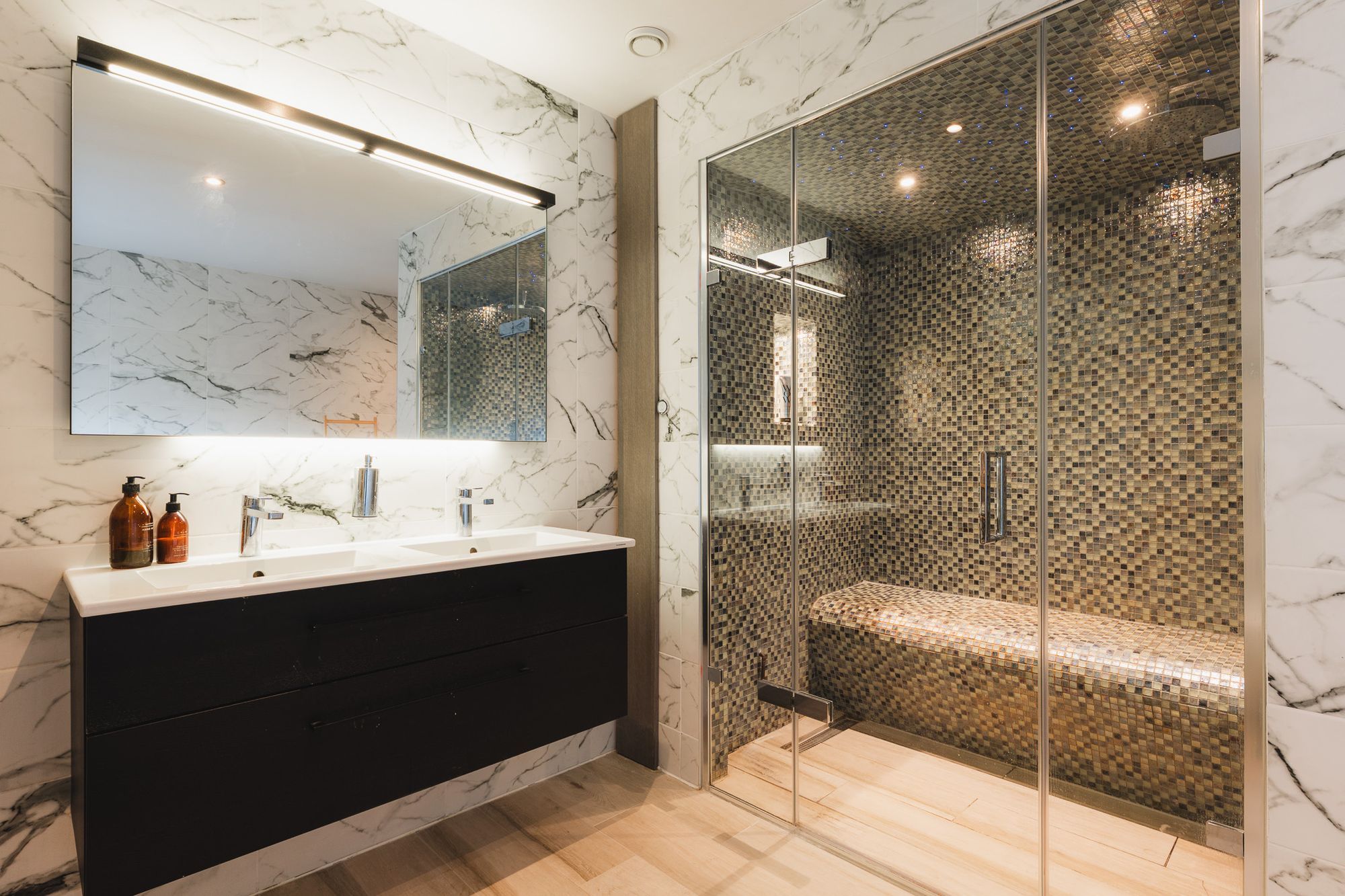 From the main stairs, turn right over the gallery landing to find the principal bedroom, whoseen suite is a true sanctuary, wrapped in striking, marble-patterned walls that set a serene, spa-like tone. A freestanding tub sits beneath the window, perfectly positioned for long, quiet soaks with garden views while along another wall, twin basins sit beneath a wide, illuminated mirror. Refresh and revive in the large walk-in steam shower, featuring a curved built-in seat, creating a calm, restorative retreat.