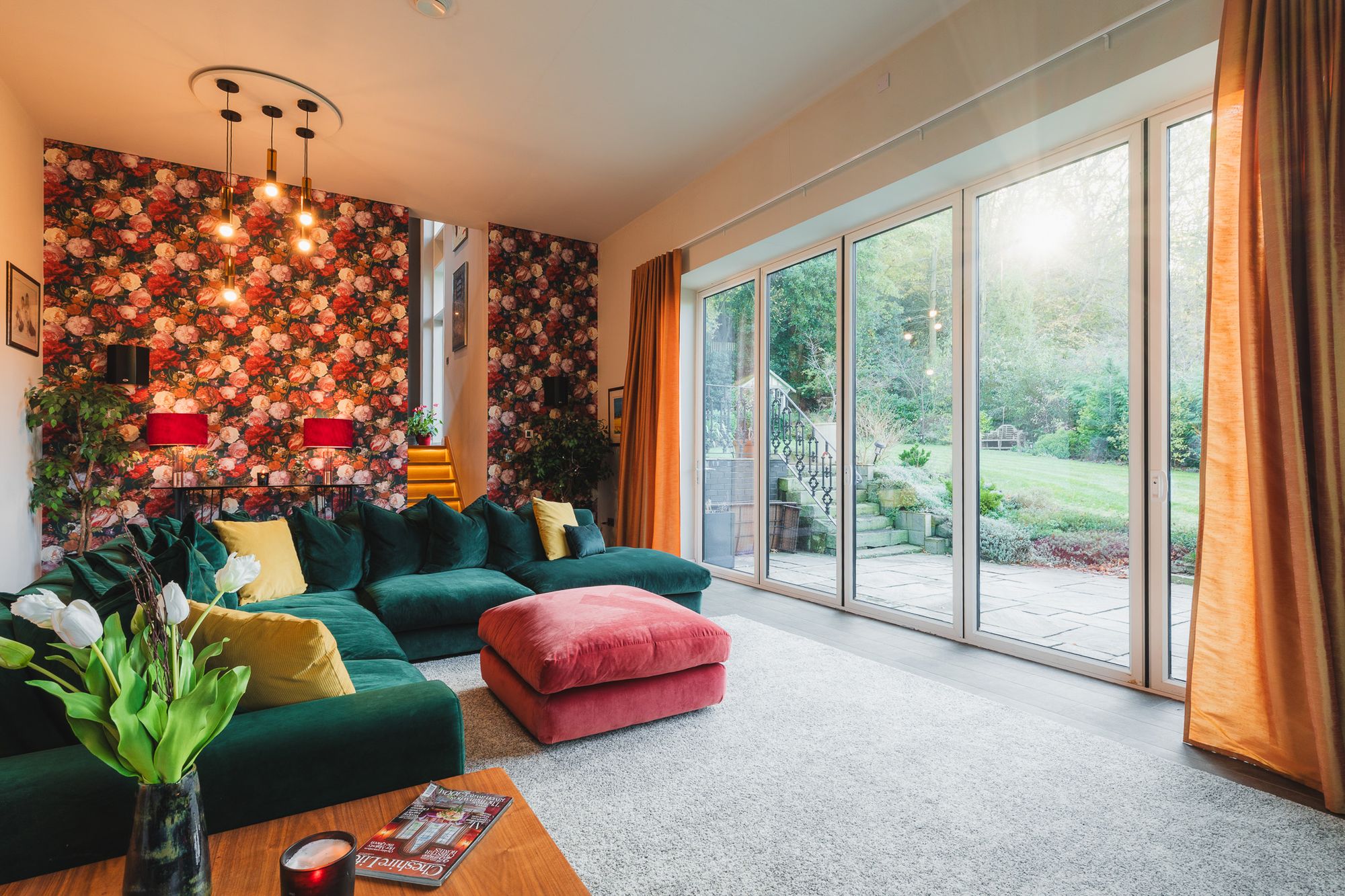 For a moment of quiet, open plan living gives way to cosy calm across the entrance hallway and down illuminated wooden steps, in the comfort of the lounge. Walls of glass keep the outdoors close, with a big wall of bifolding doors inviting the garden indoors in summer. In winter, a log-burning stove creates cosy cheer, with a handsome floral feature wall imbuing a sense of sophistication.