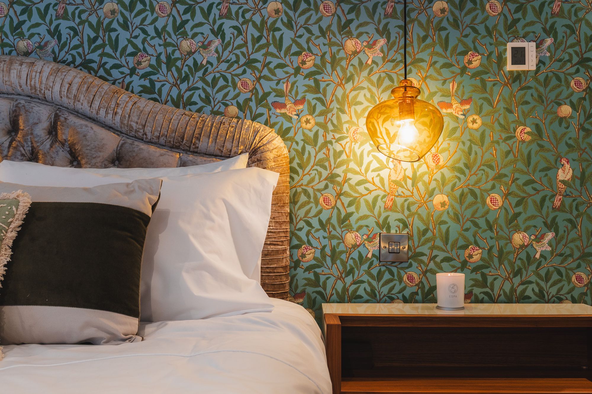 Serene and tranquil, with peaceful views stretching out over the garden, the main bedroom offers a true sense of retreat. Painted in a soothing Neptune shade, the room pairs its calm, chalky tones with a delicate floral feature wall and pale flooring, creating a fresh, restful atmosphere from first light to dusk.
