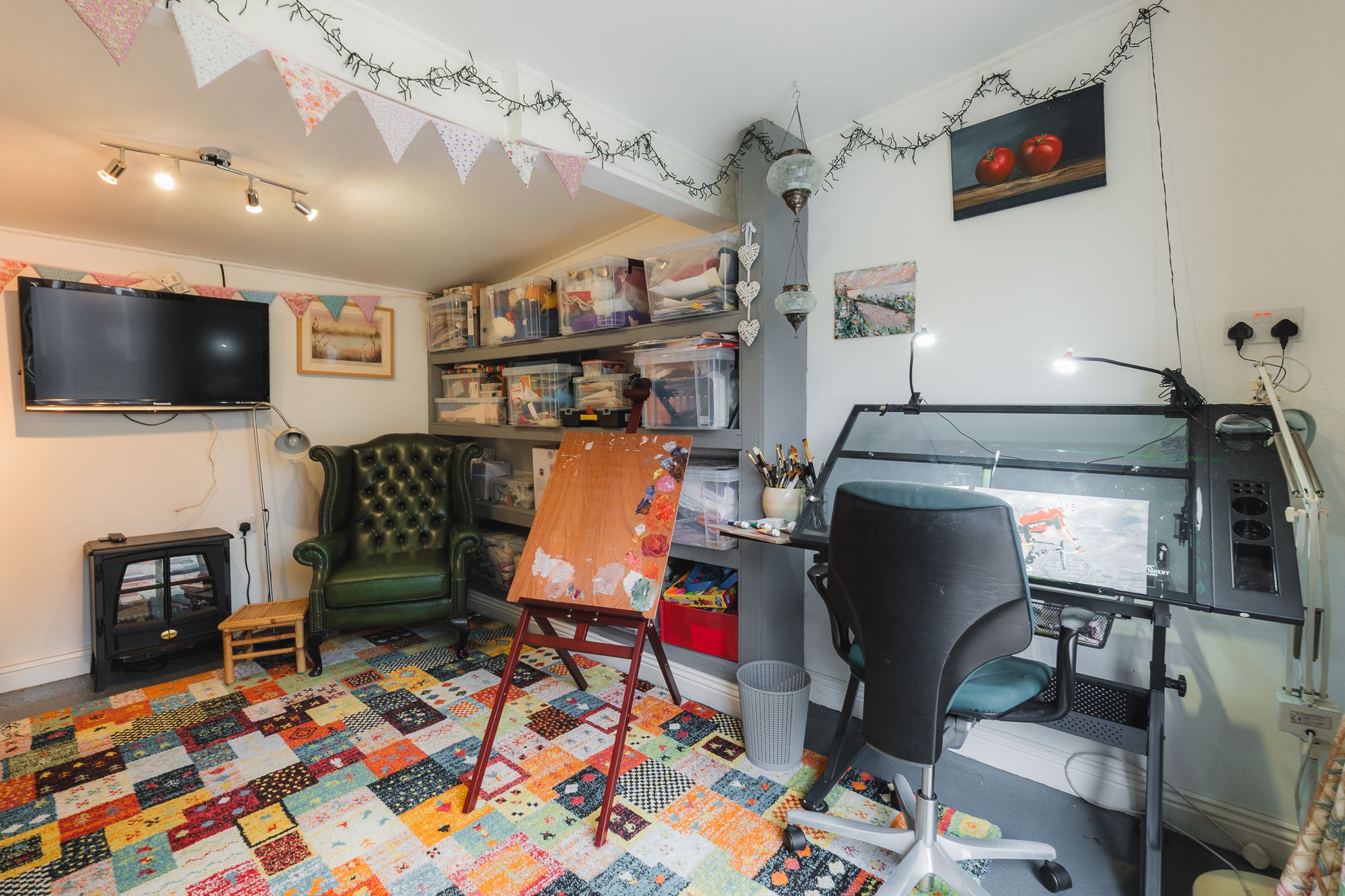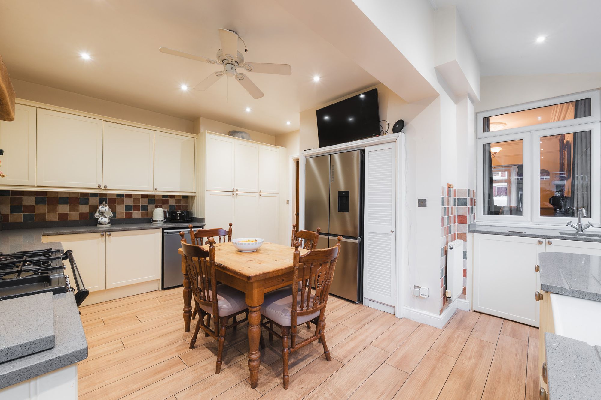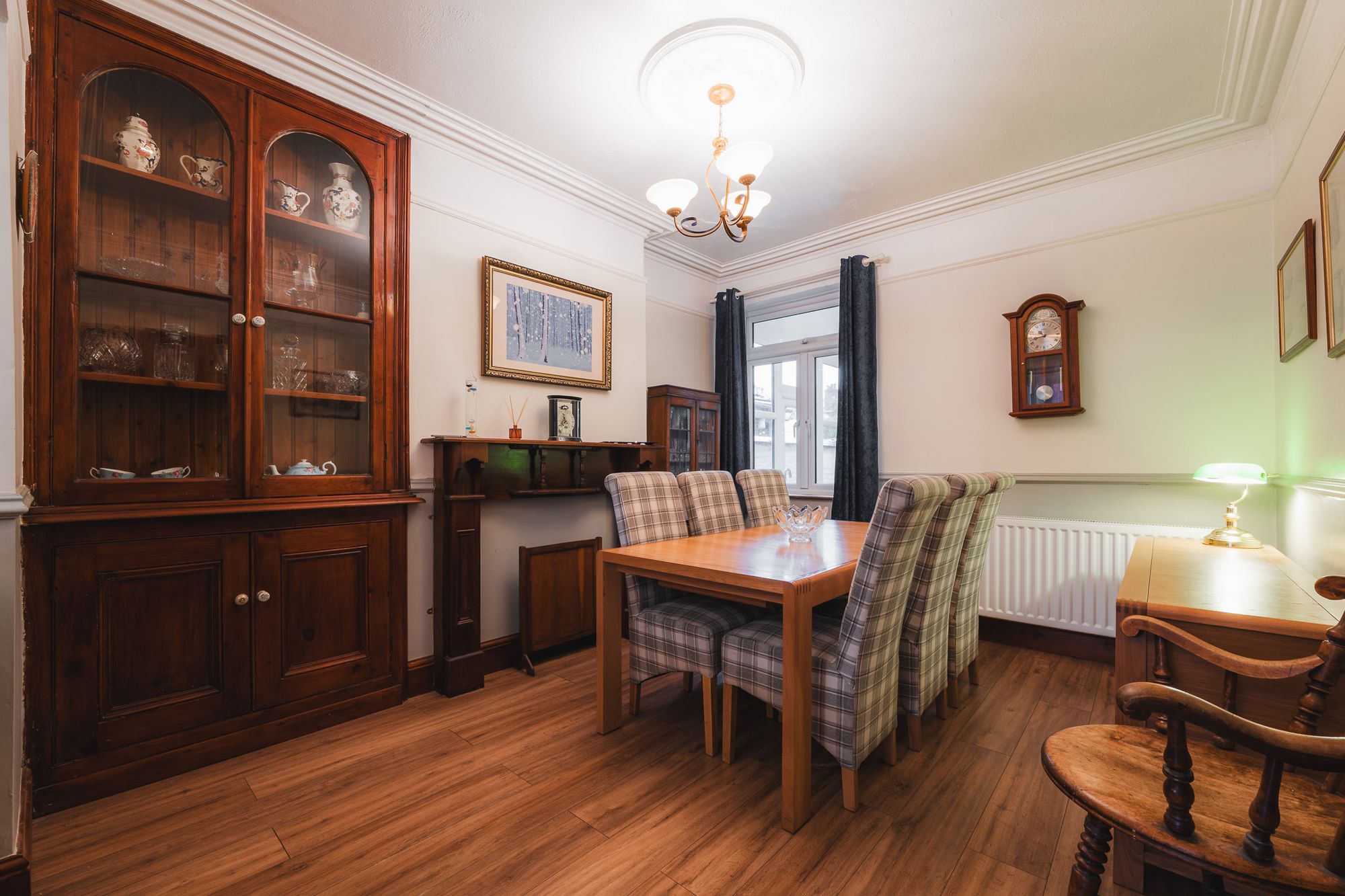 To the rear the dining room is light and bright, with ample space for a large dining table. Relocated from the lounge, the now ornamental wooden fire surround creates a toasty focal point.