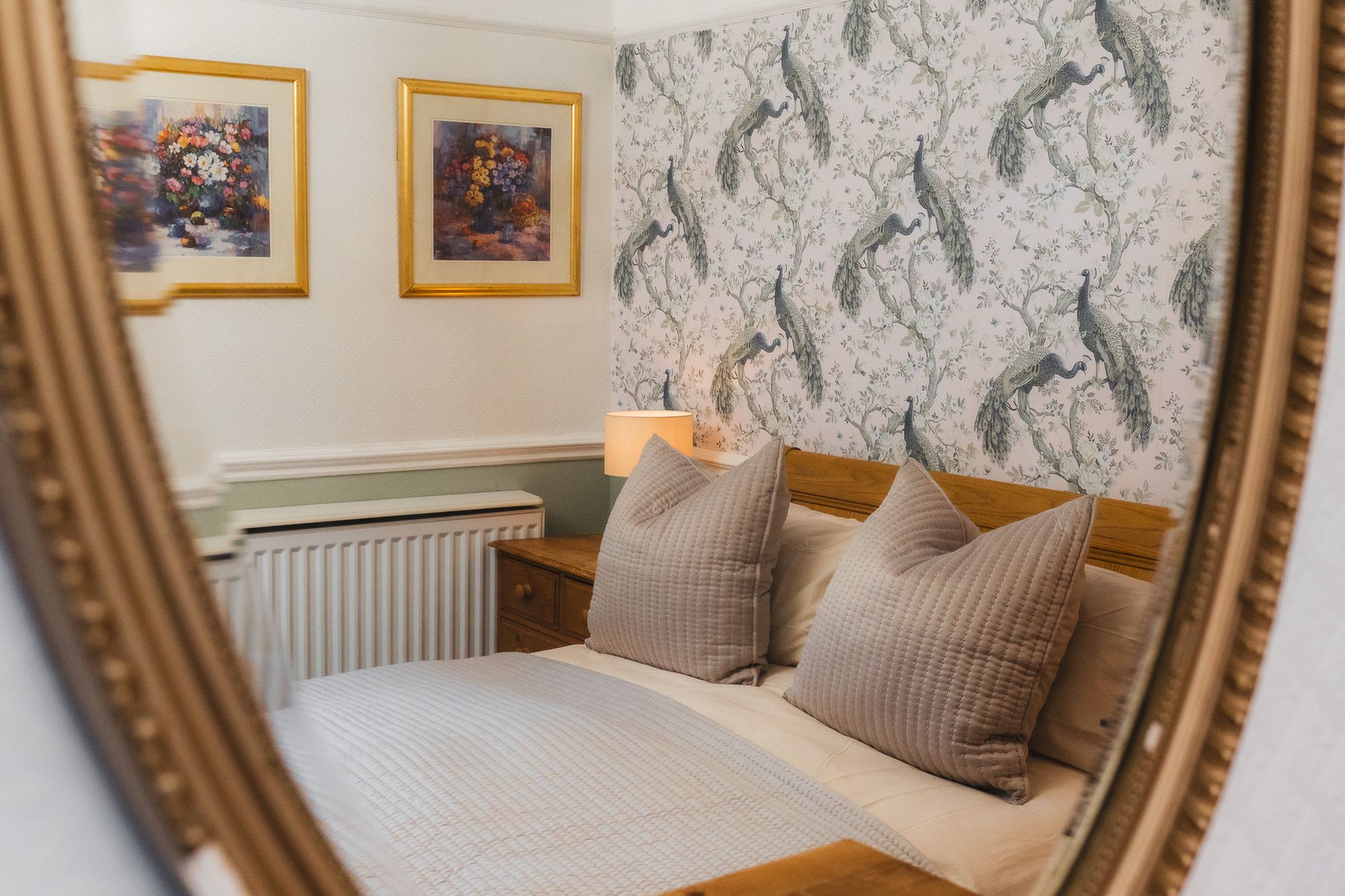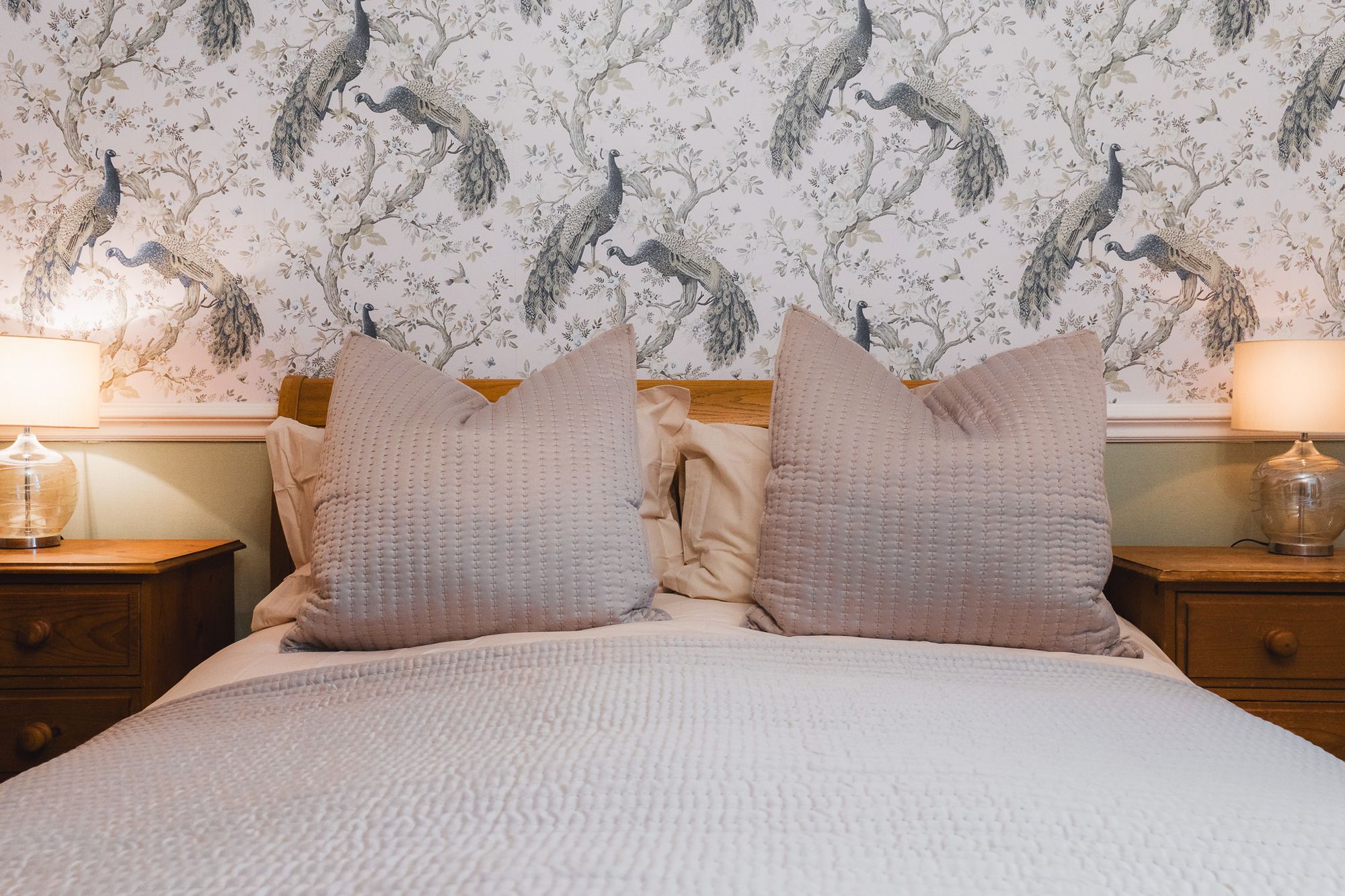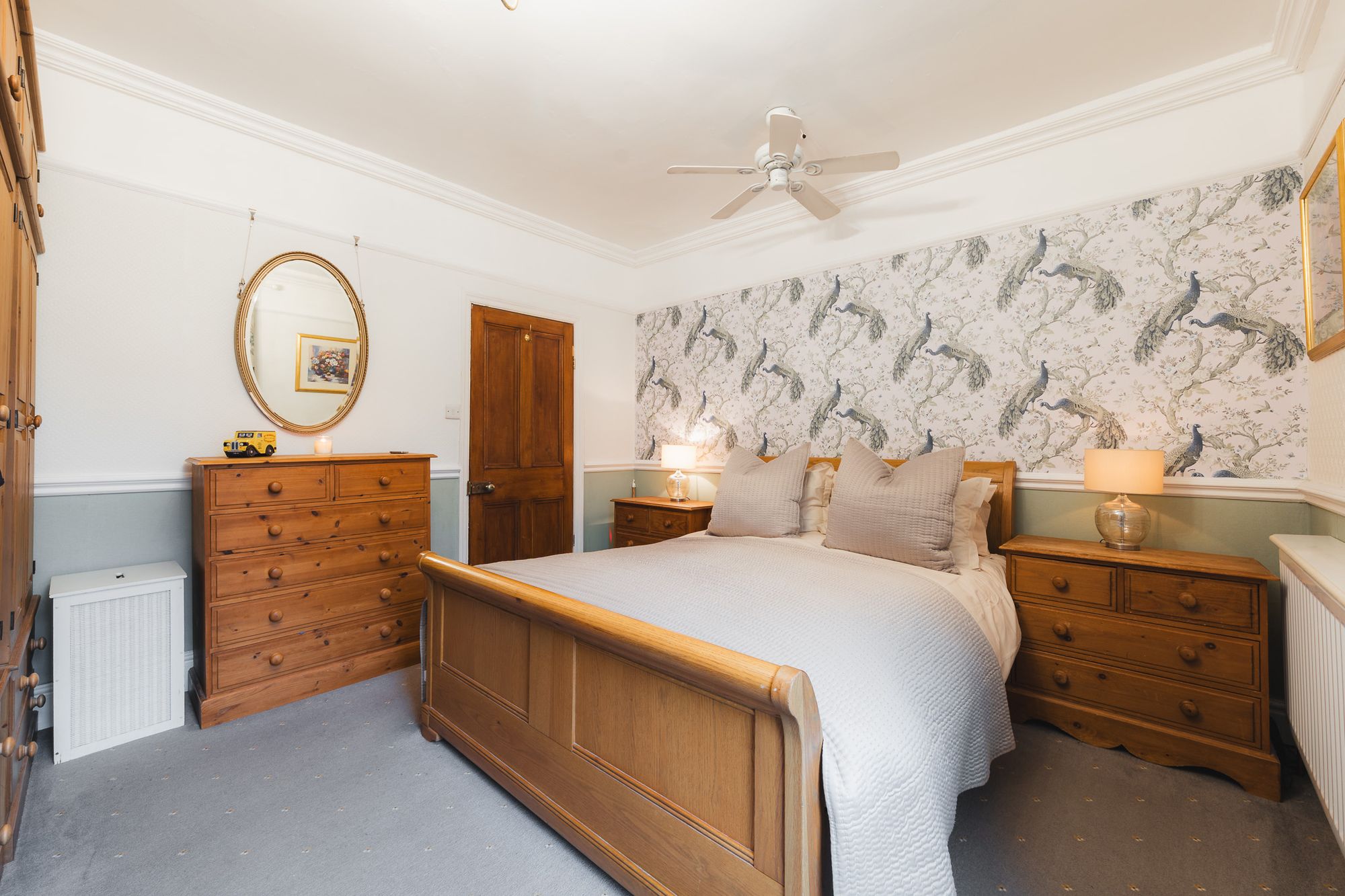 Passing another original wardrobe, continue ahead to arrive at the light-filled master bedroom, with plenty of space for wardrobes and its own shower room en suite, with reinstated coving and dado rail to ensure the period detailing continues uninterrupted. Decorated around 18 months ago, the room continues the heritage theme with a soft palette ofLaura Ashley peacock wallpaper and perfectly matched curtains bringing a sense of period refinement.