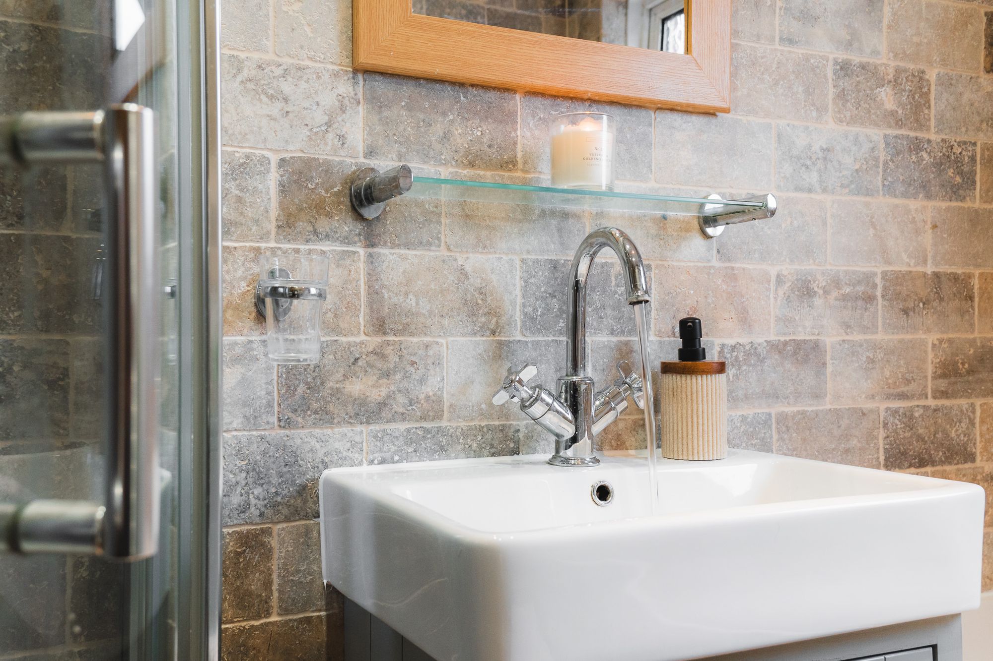 Updated in 2017-18 with a new ceiling and refined joinery, fitted cabinetry frames the bath and basin, while within the natural texture and patterns of the travertine, if you lie back in the bath and look across at the wall, one of the tiles reveals a natural marking that resembles a meerkat.
